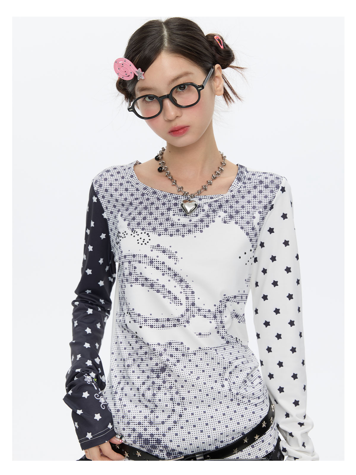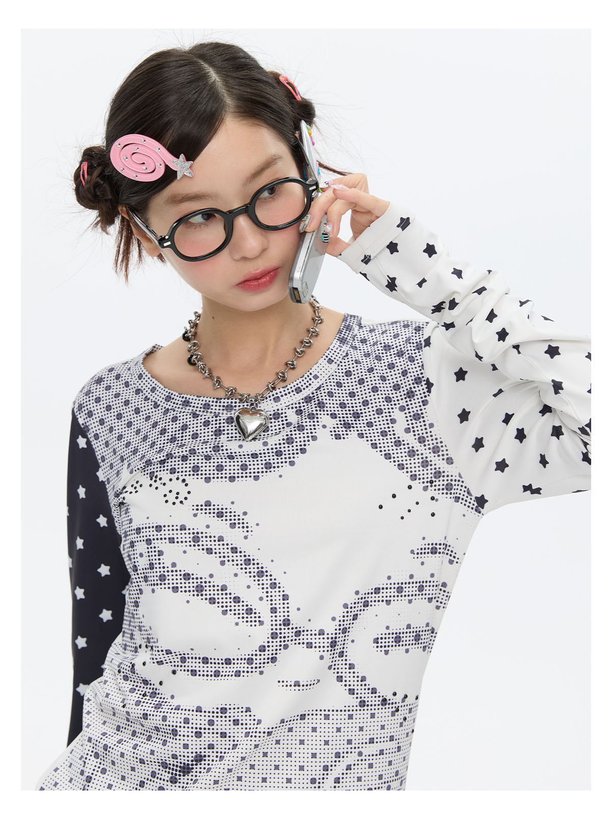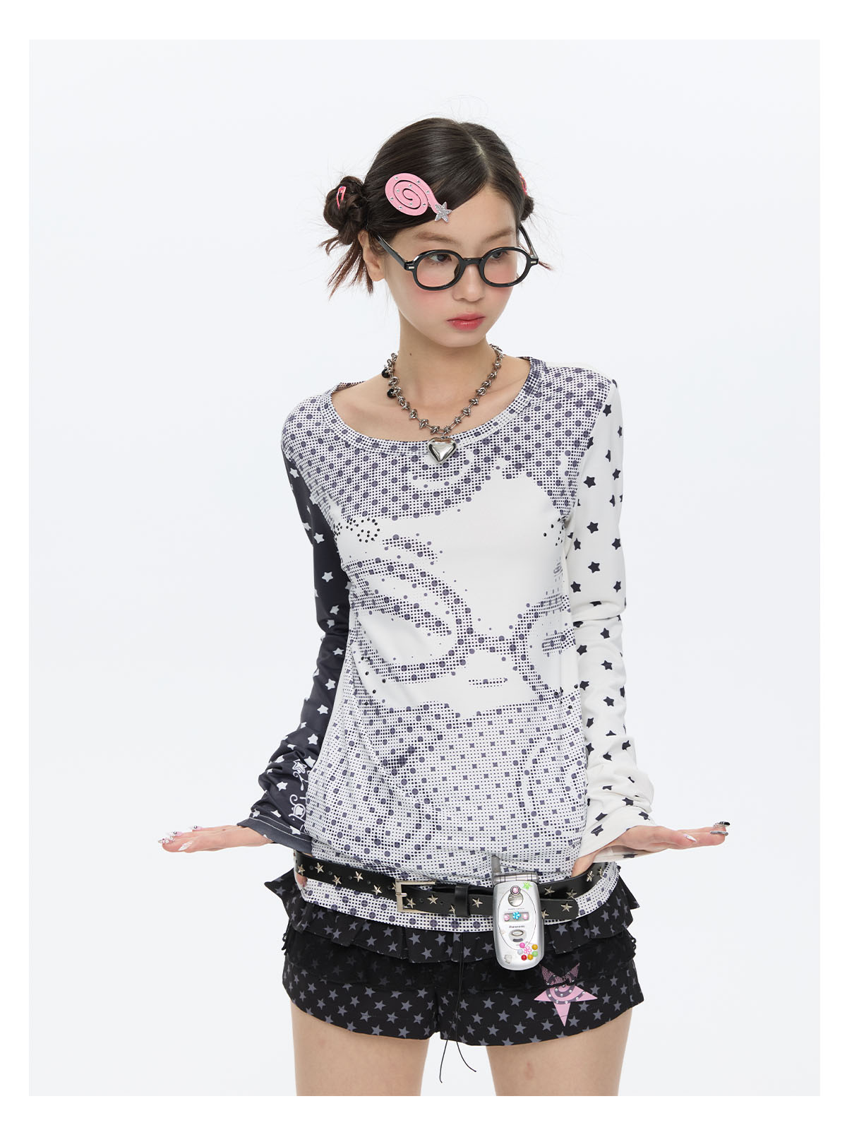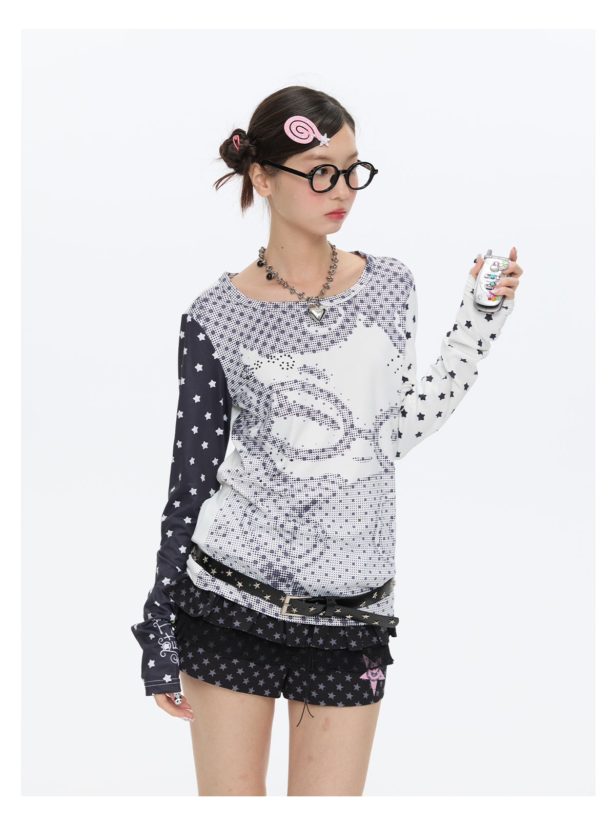 Anime pixel dot print long sleeve top with patchwork design Lookbook
