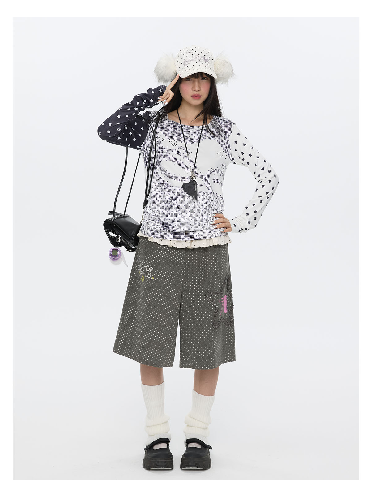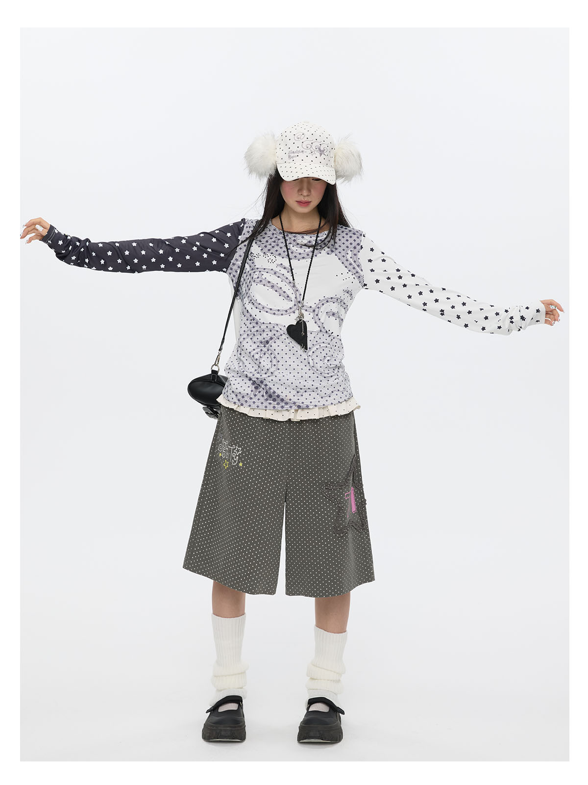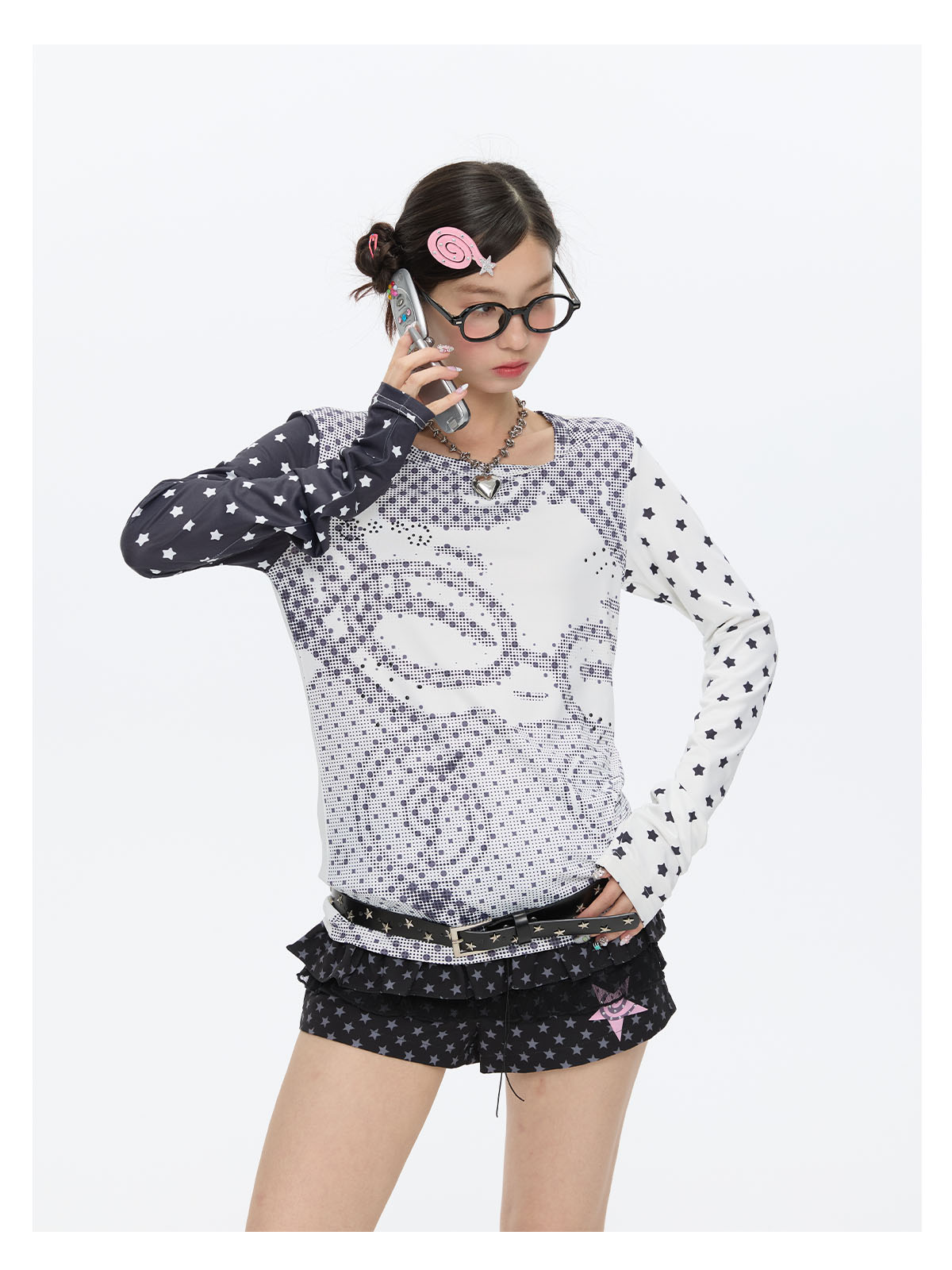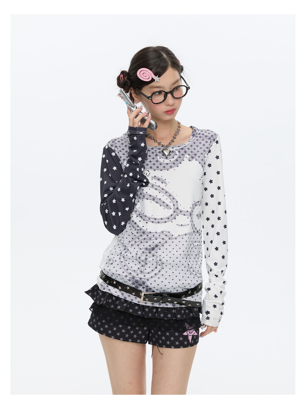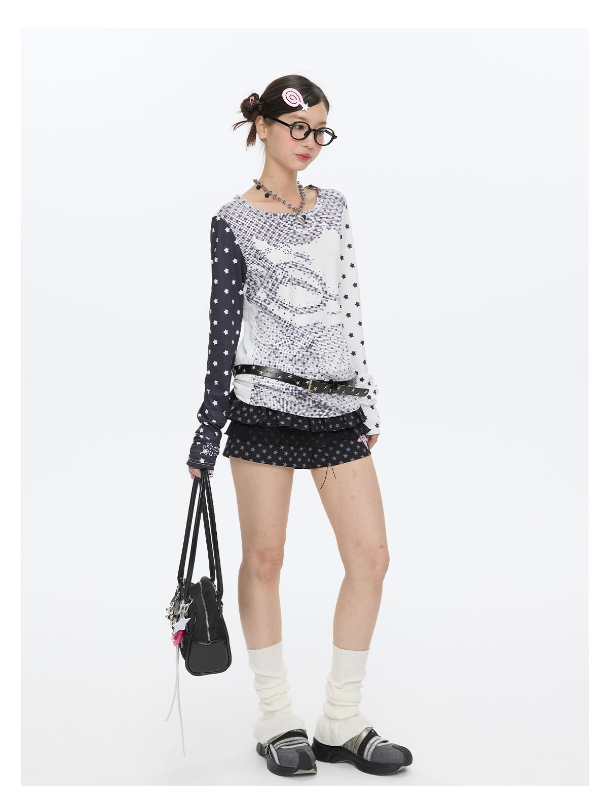 Anime pixel dot print long sleeve top with patchwork design Lookbook