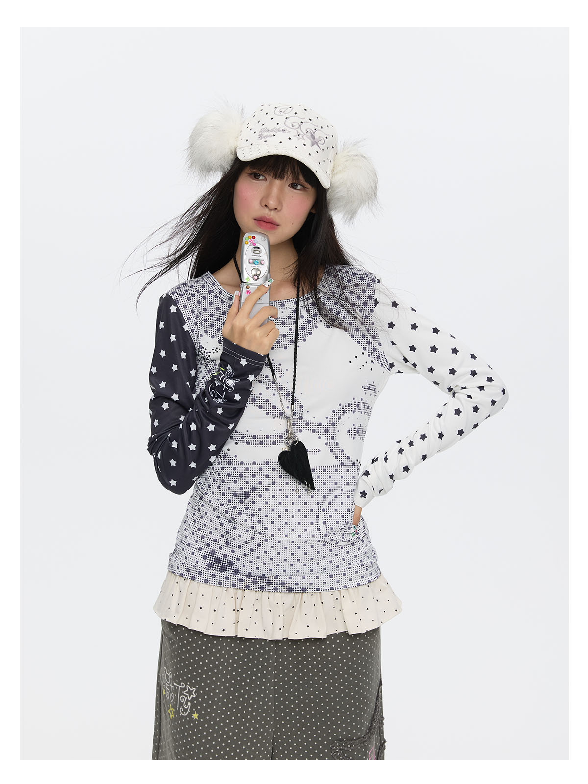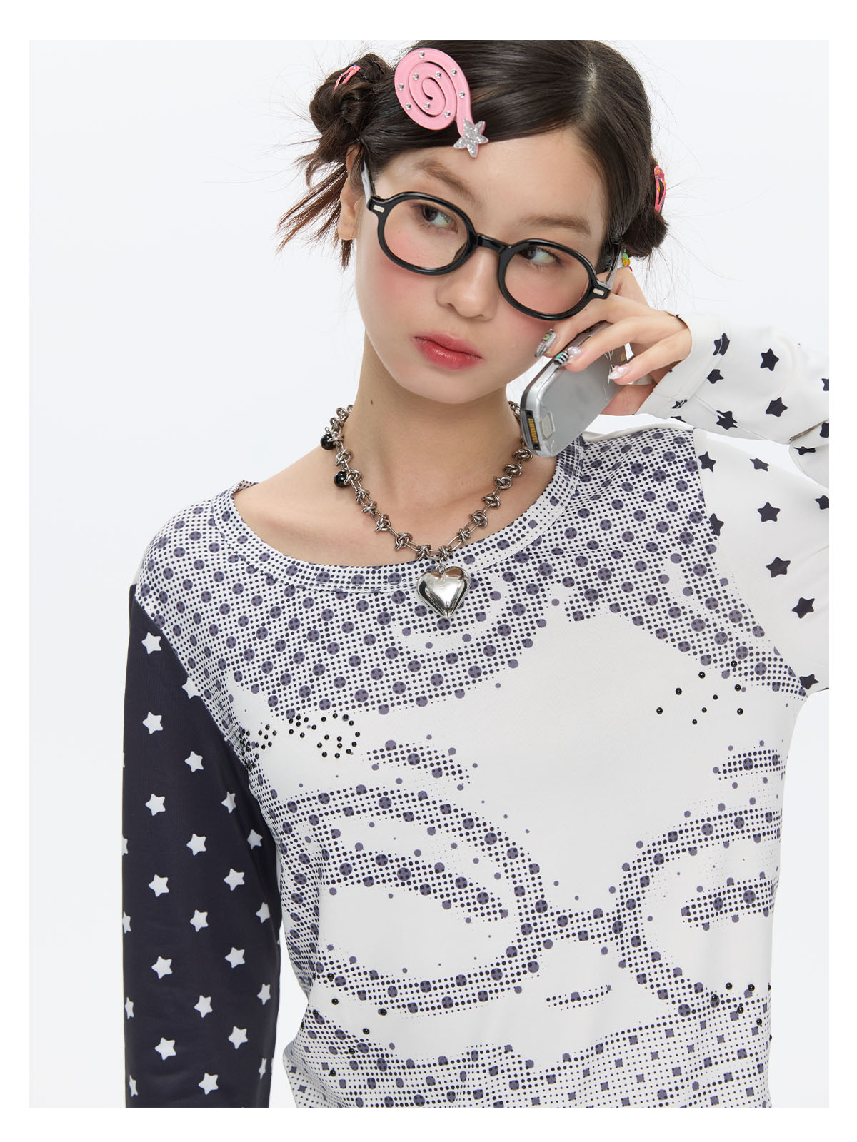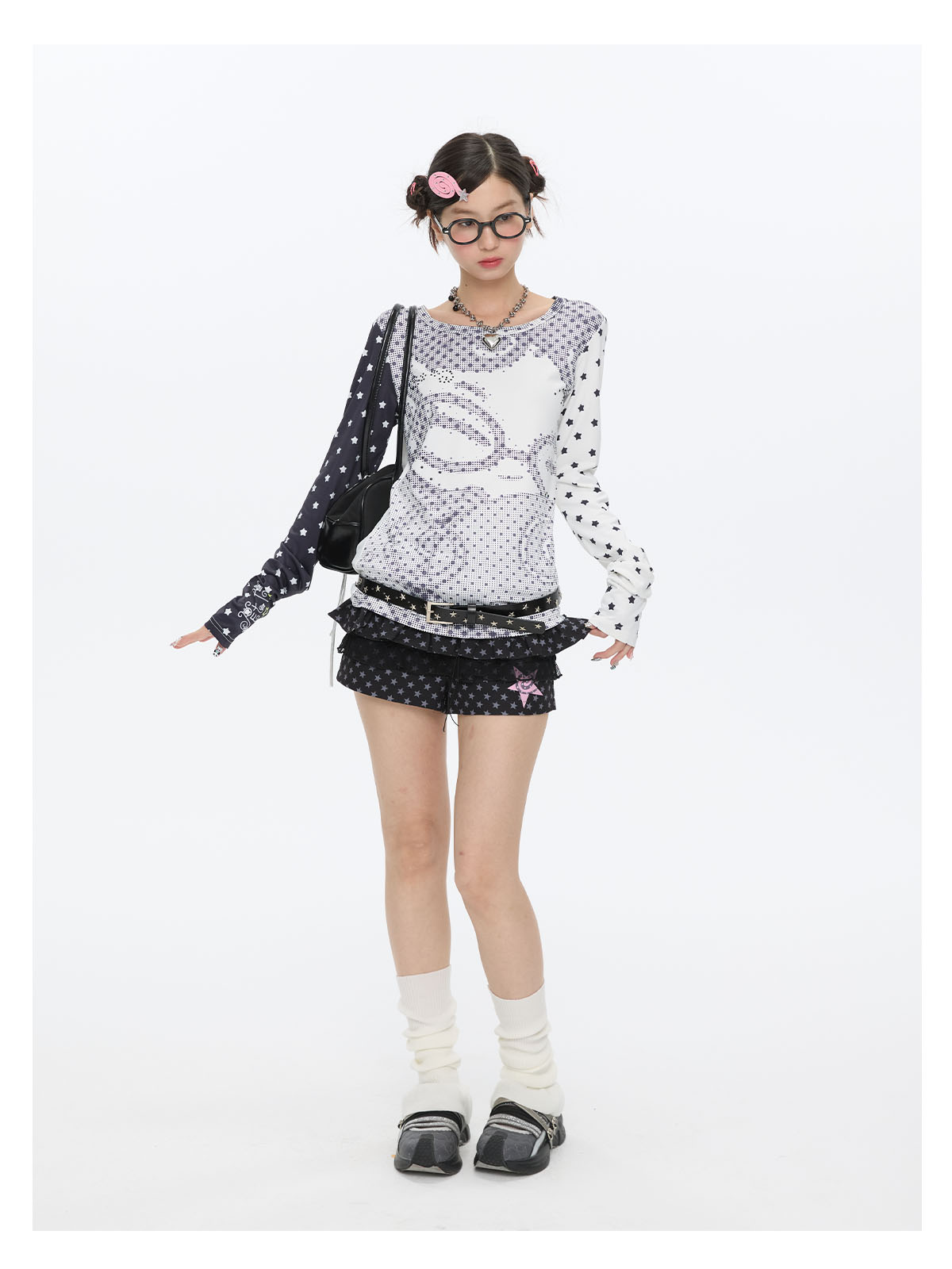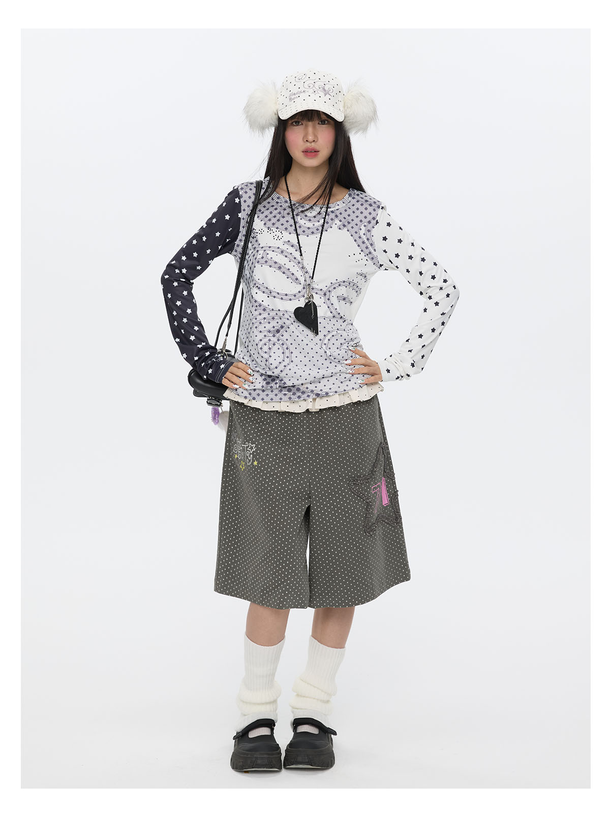 Anime pixel dot print long sleeve top with patchwork design Lookbook