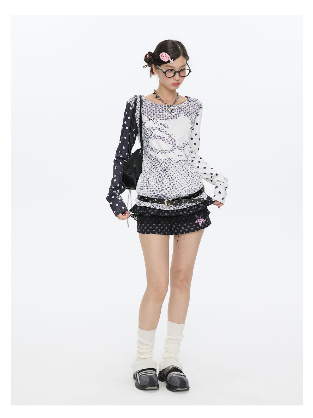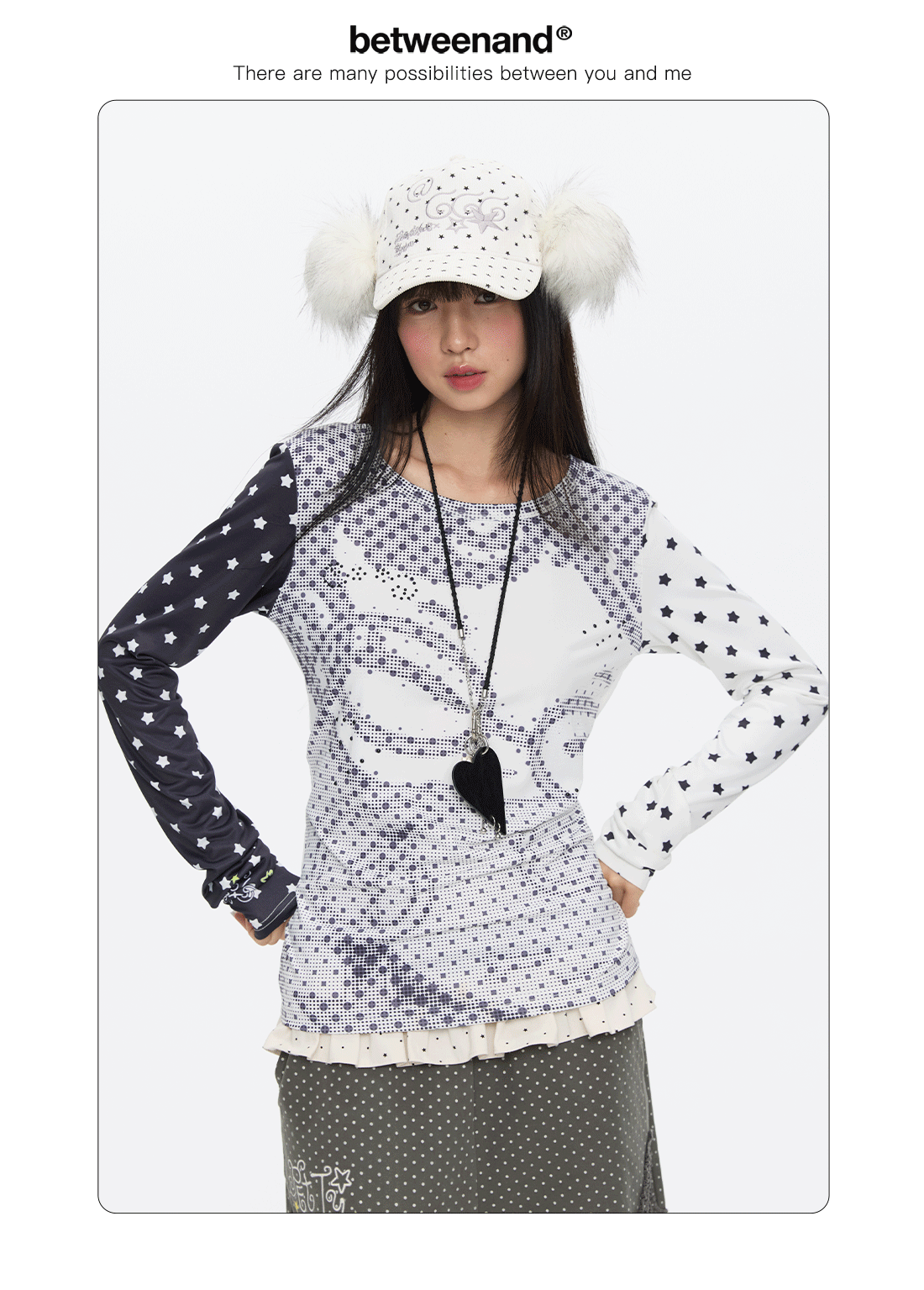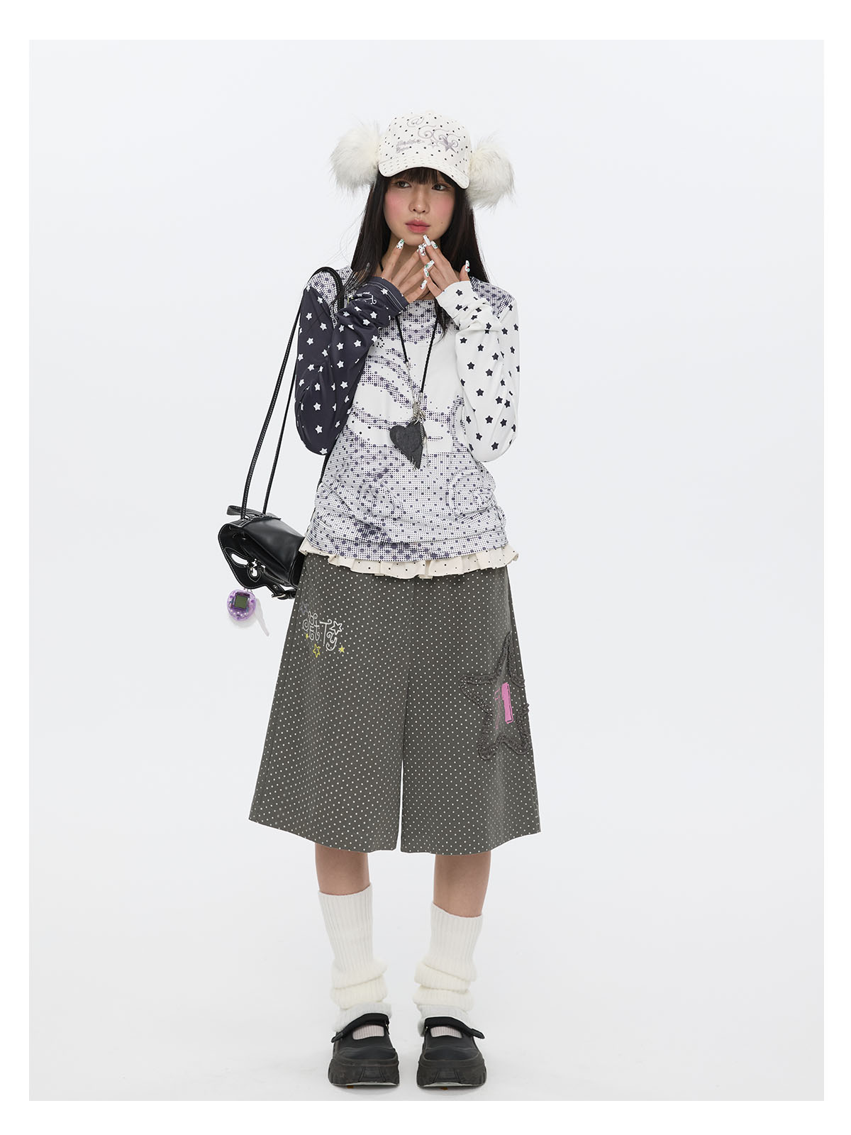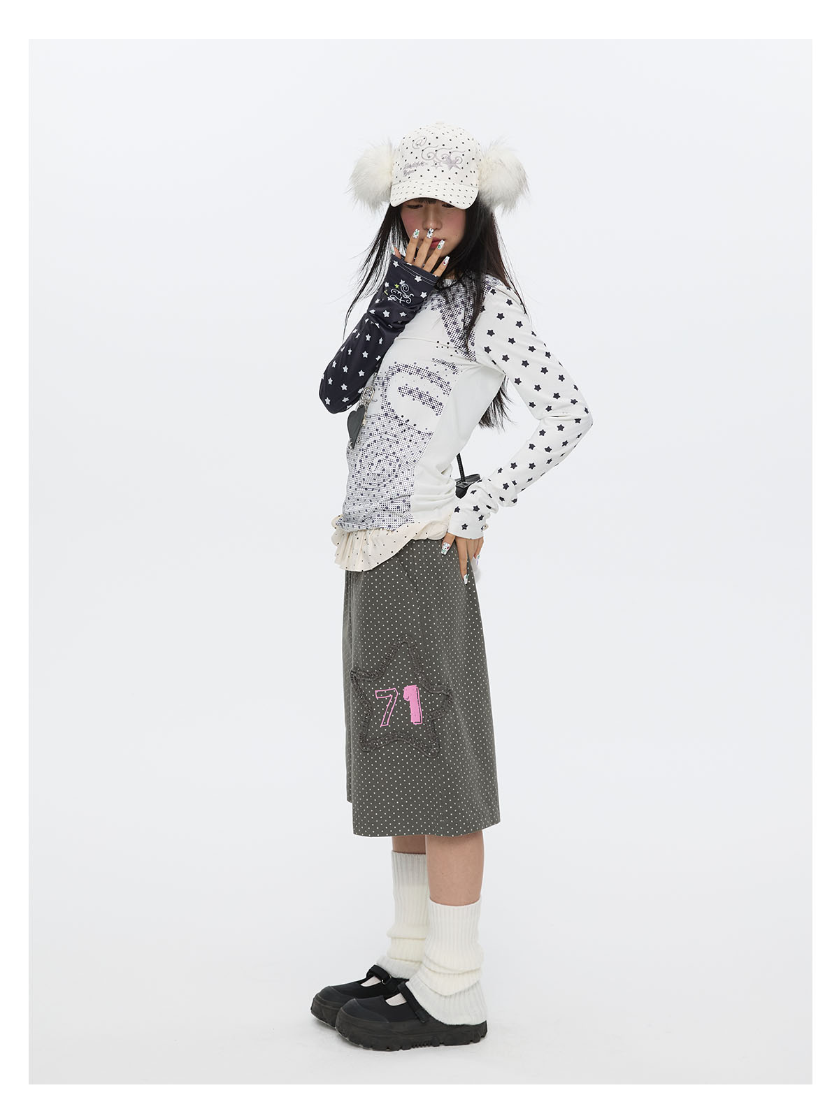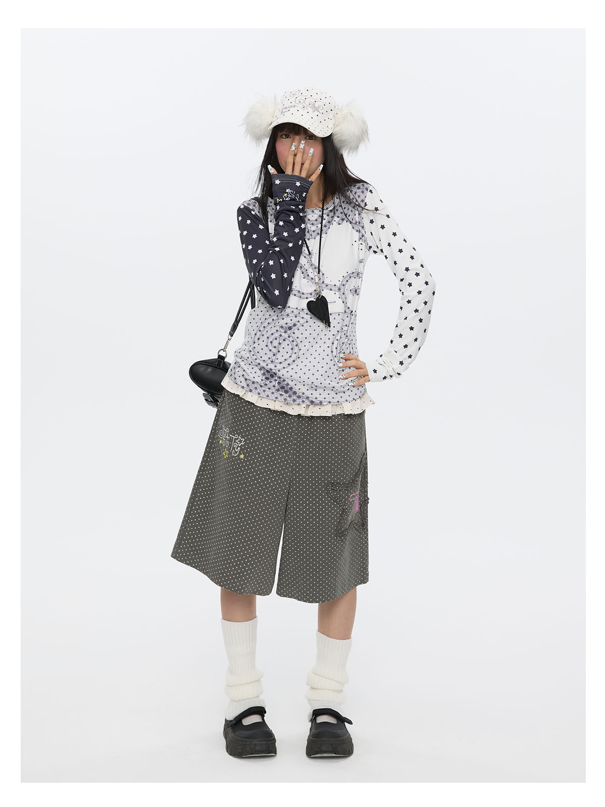 Anime pixel dot print long sleeve top with patchwork design Lookbook