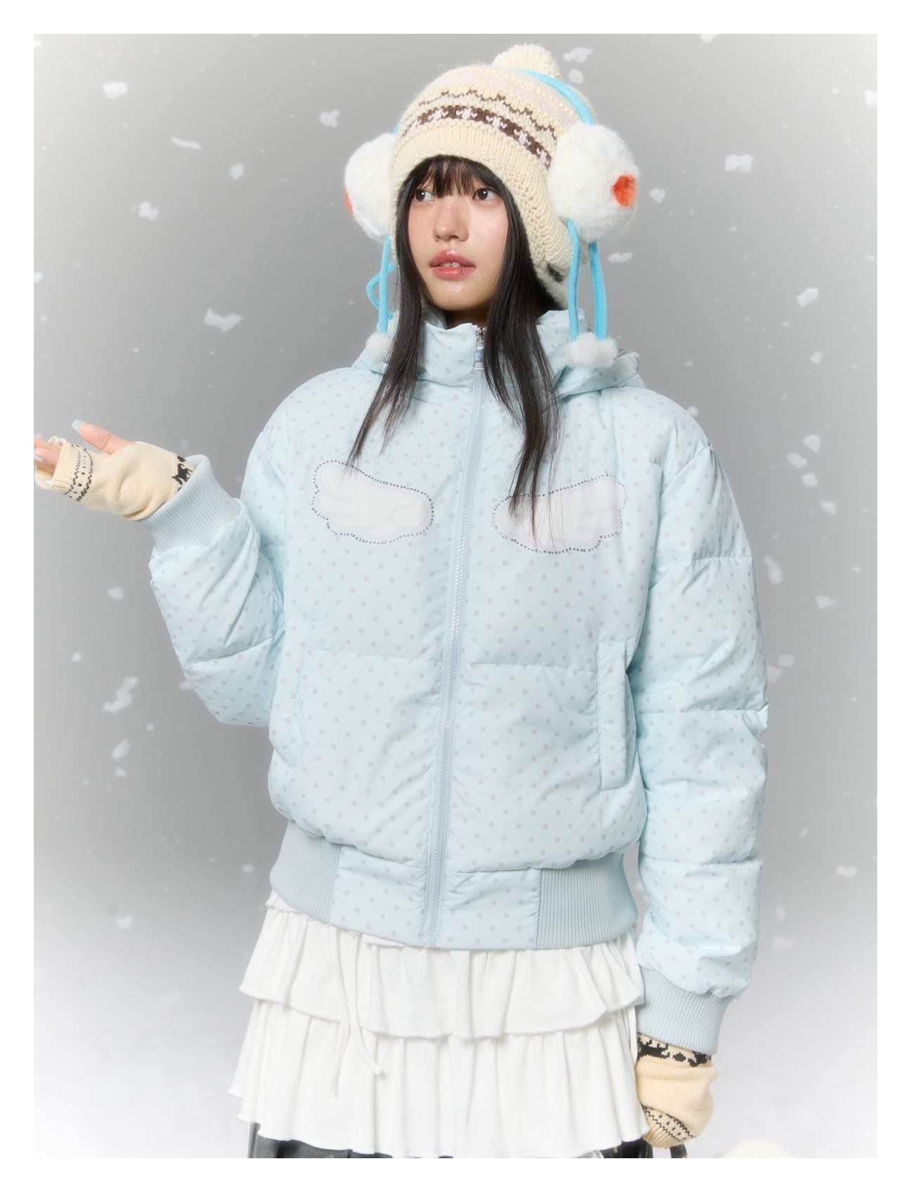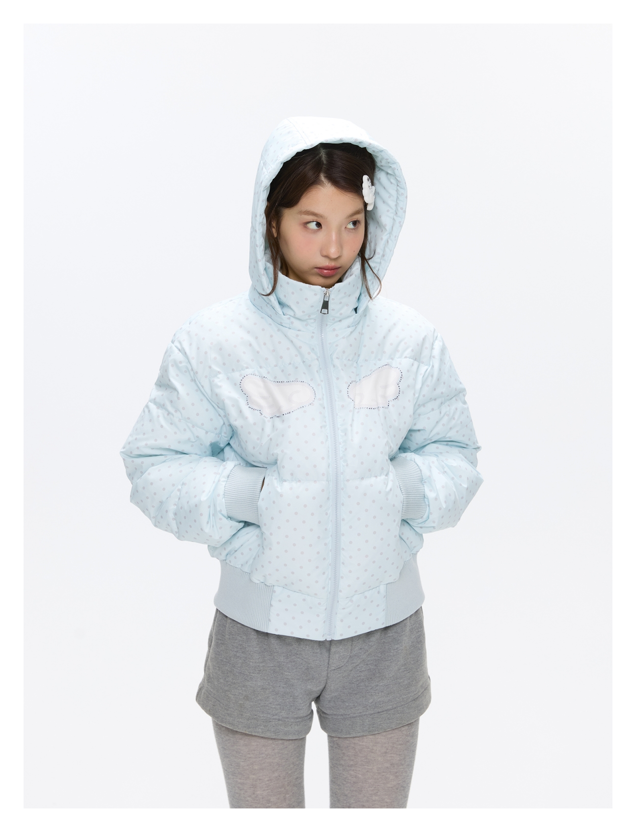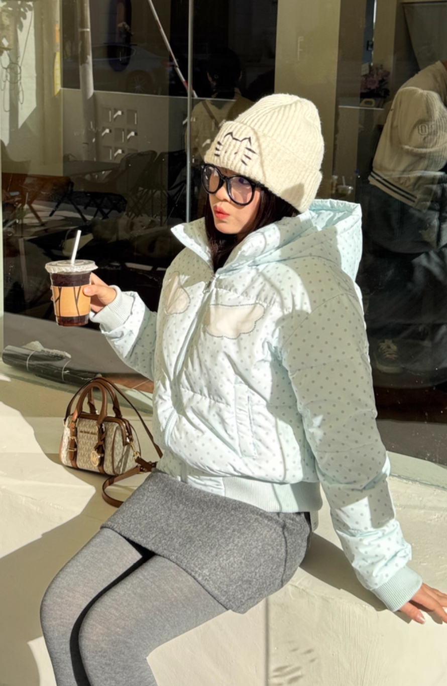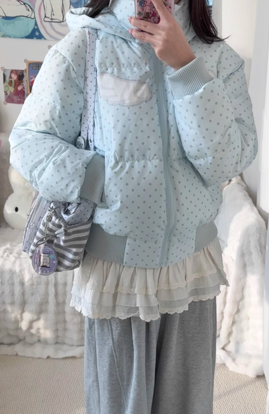 Baby blue polka dot down jacket with hood and warm duck filling Lookbook