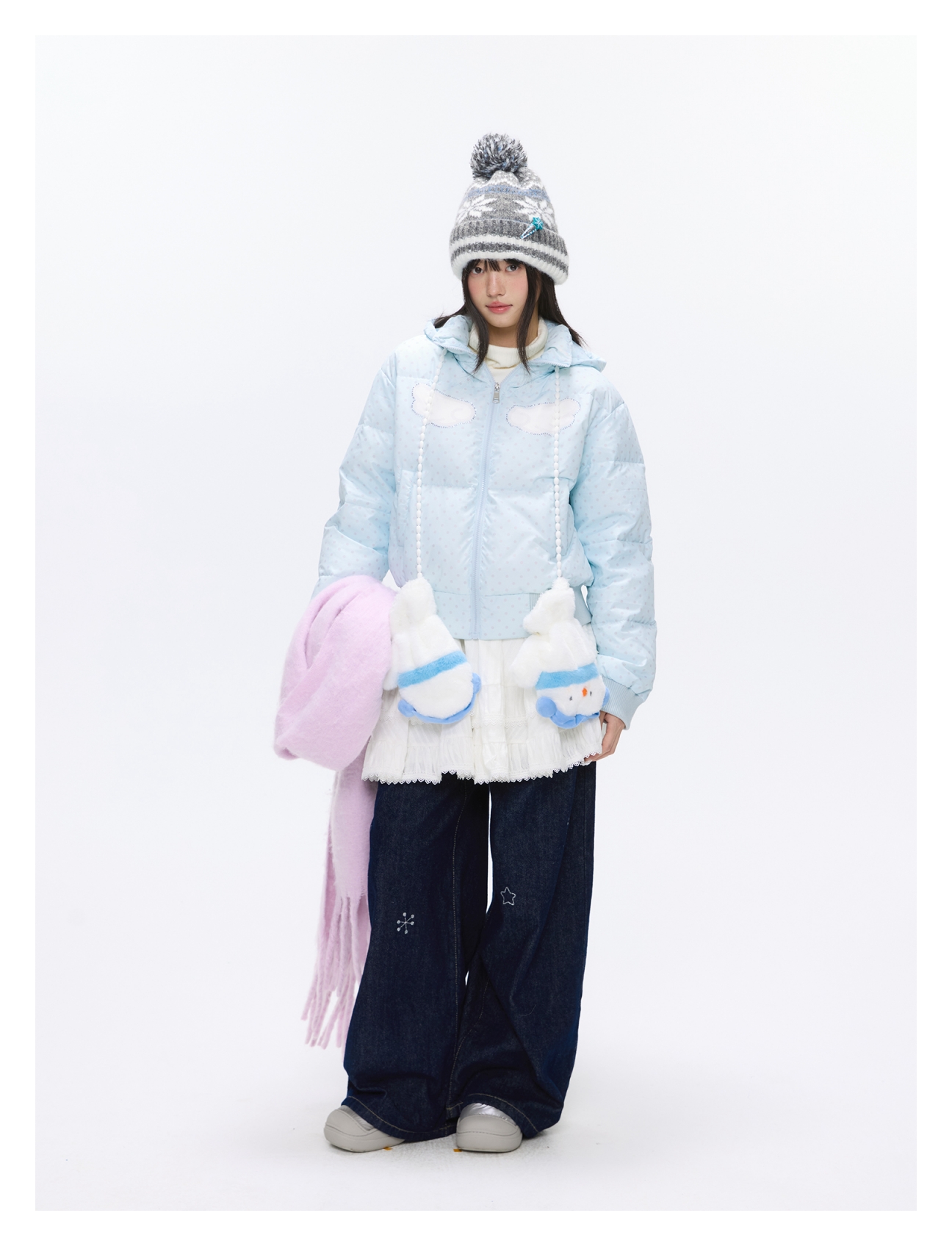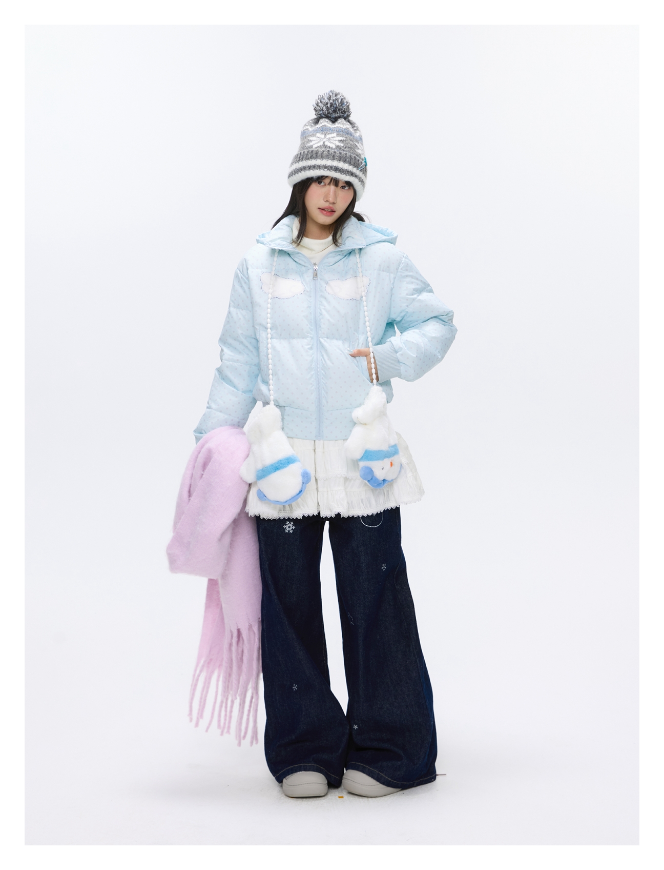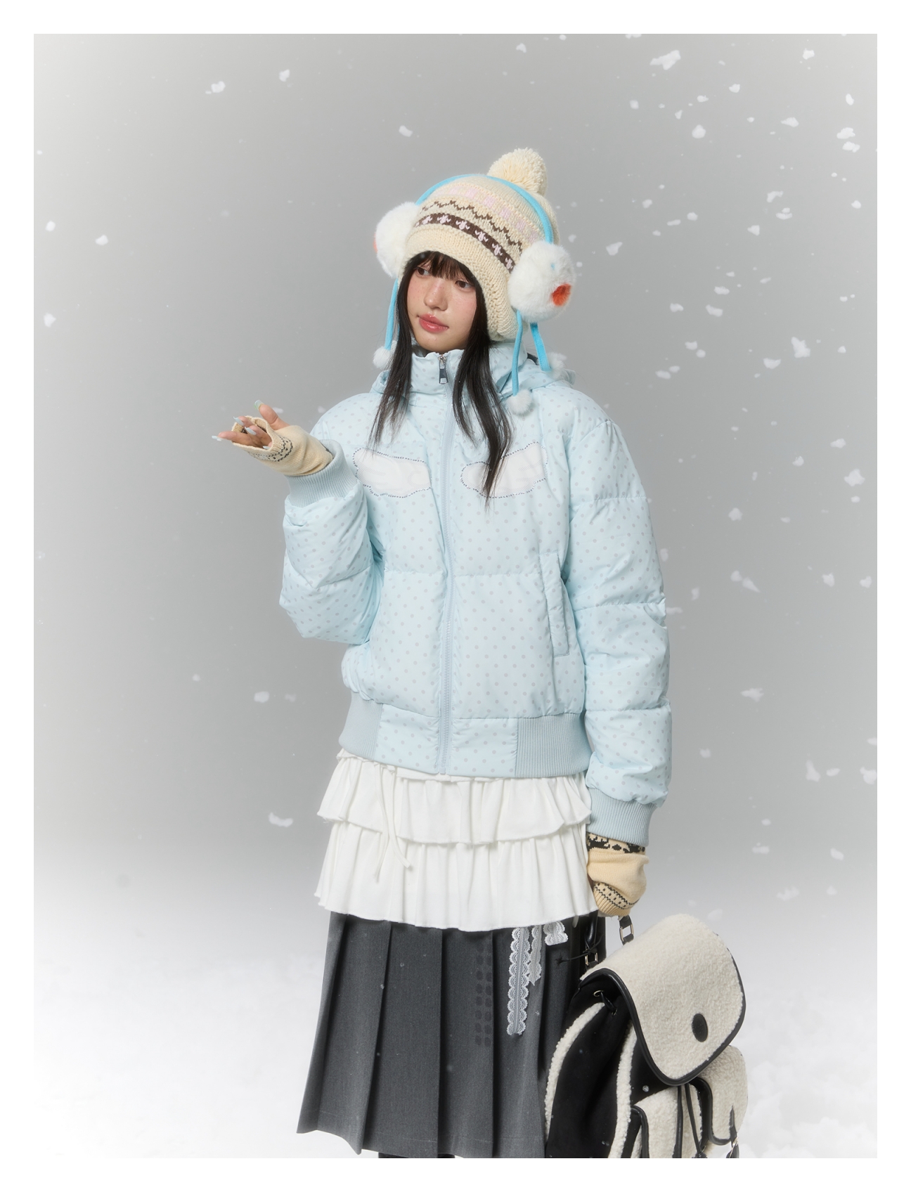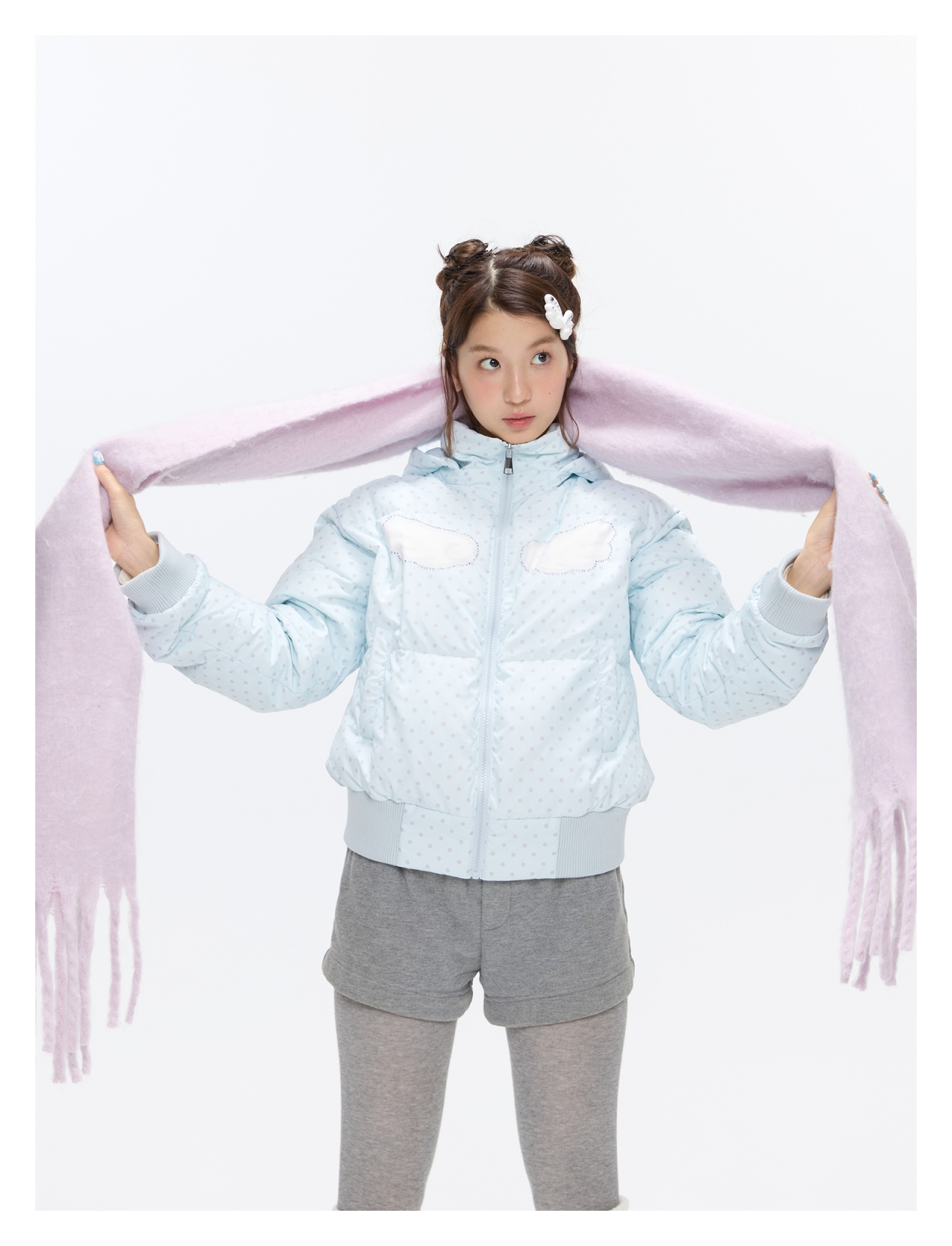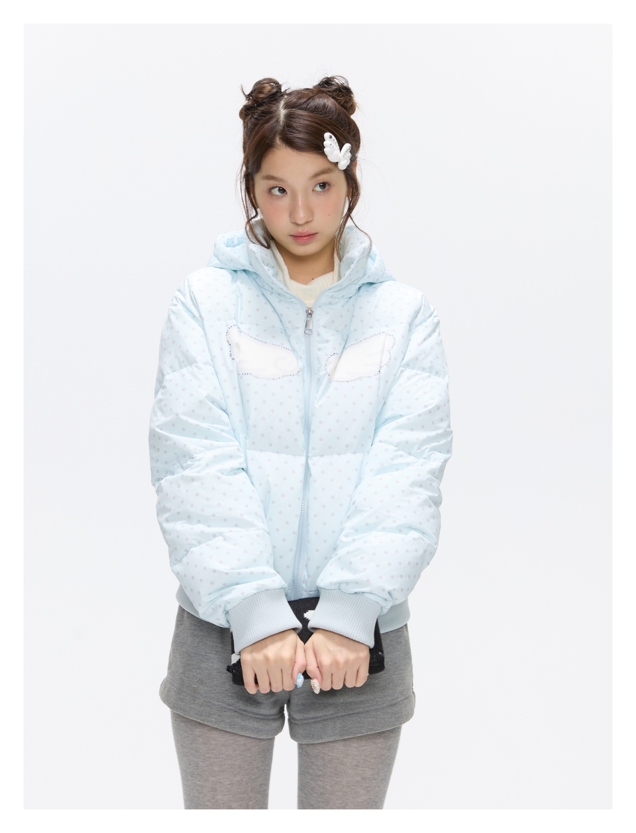 Baby blue polka dot down jacket with hood and warm duck filling Lookbook