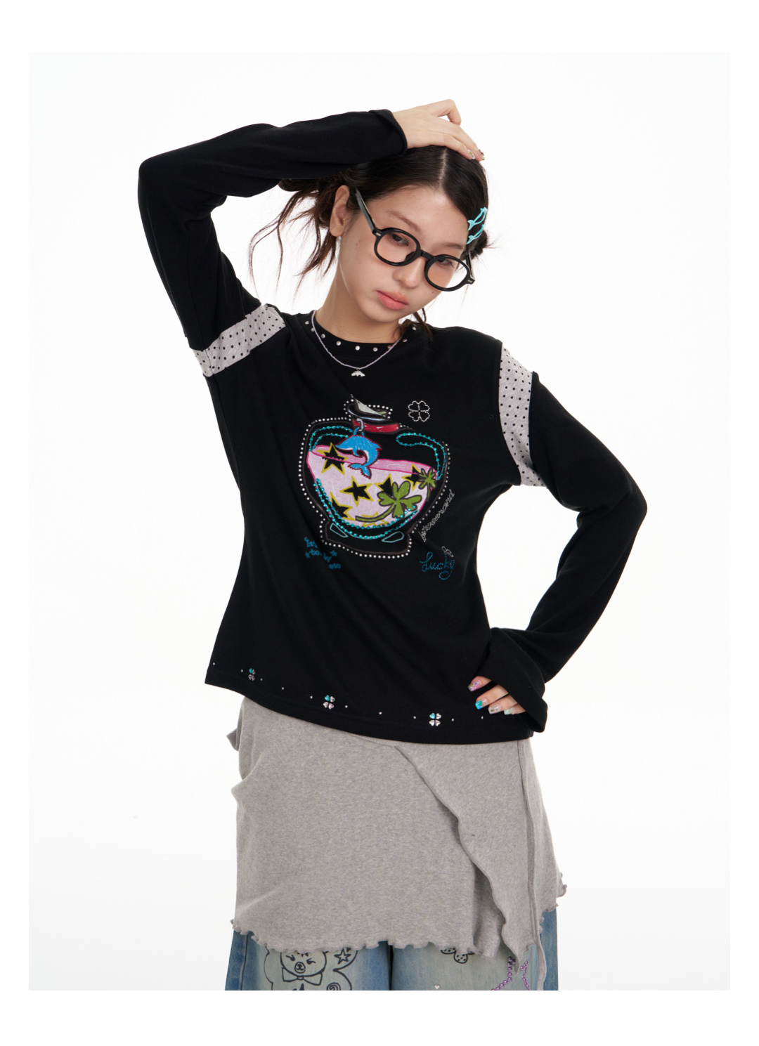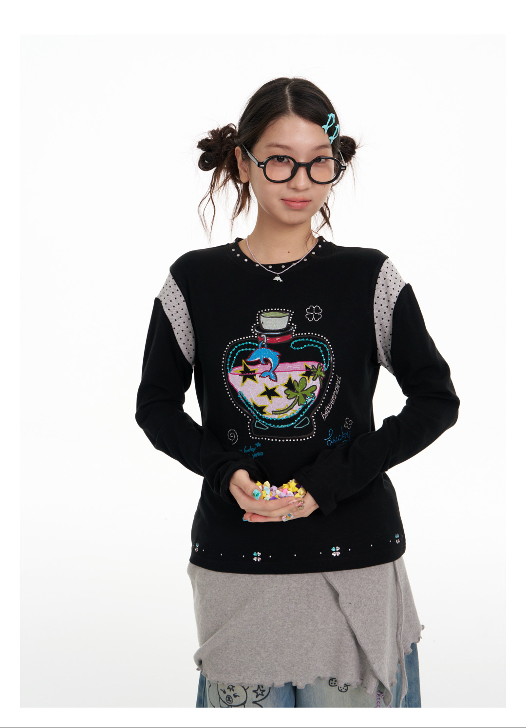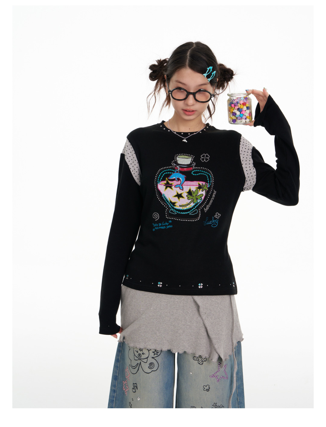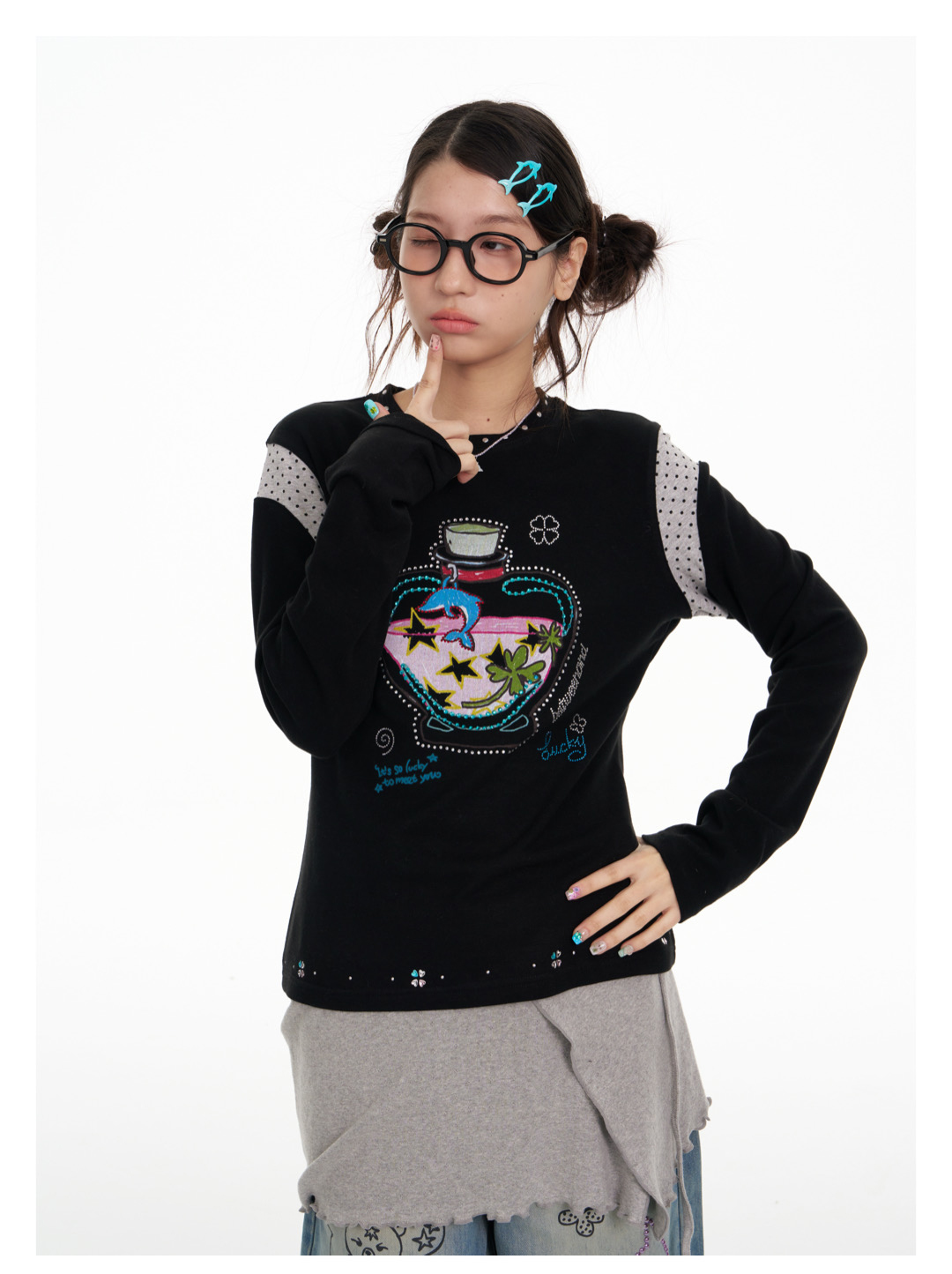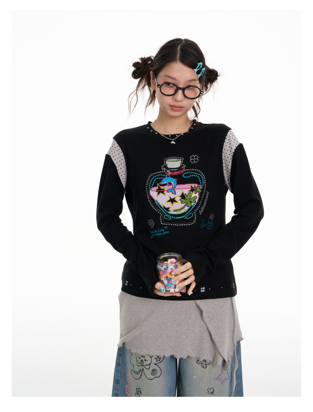 Black dolphin “lucky bottle” rhinestone patchwork long-sleeve tee Lookbook