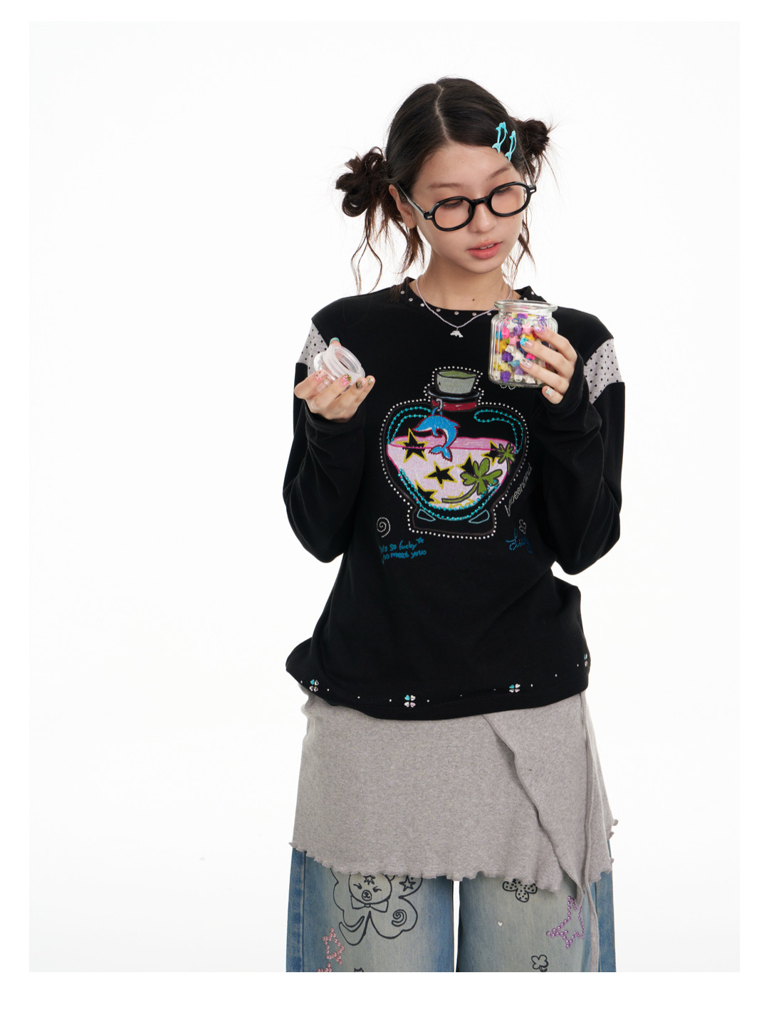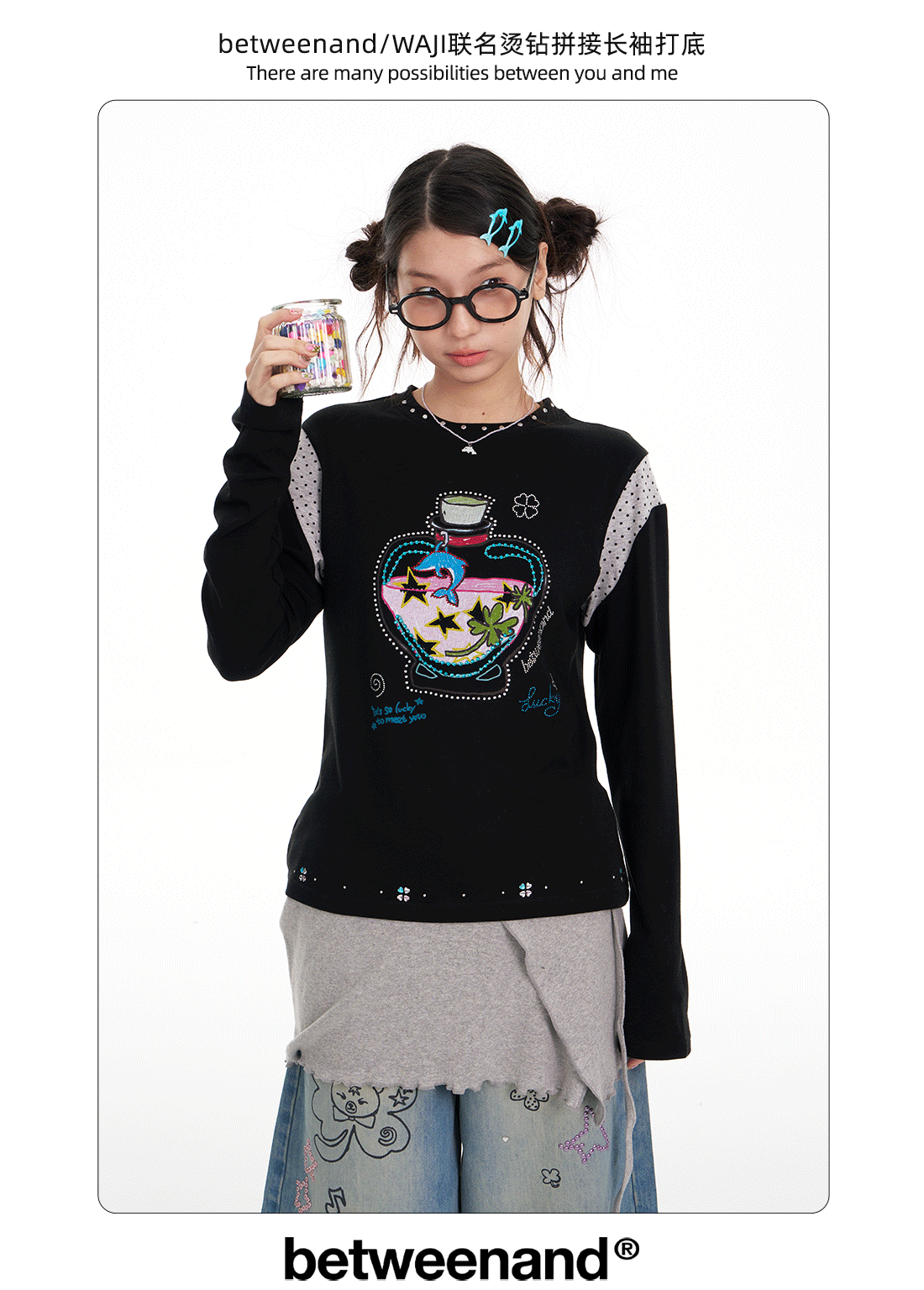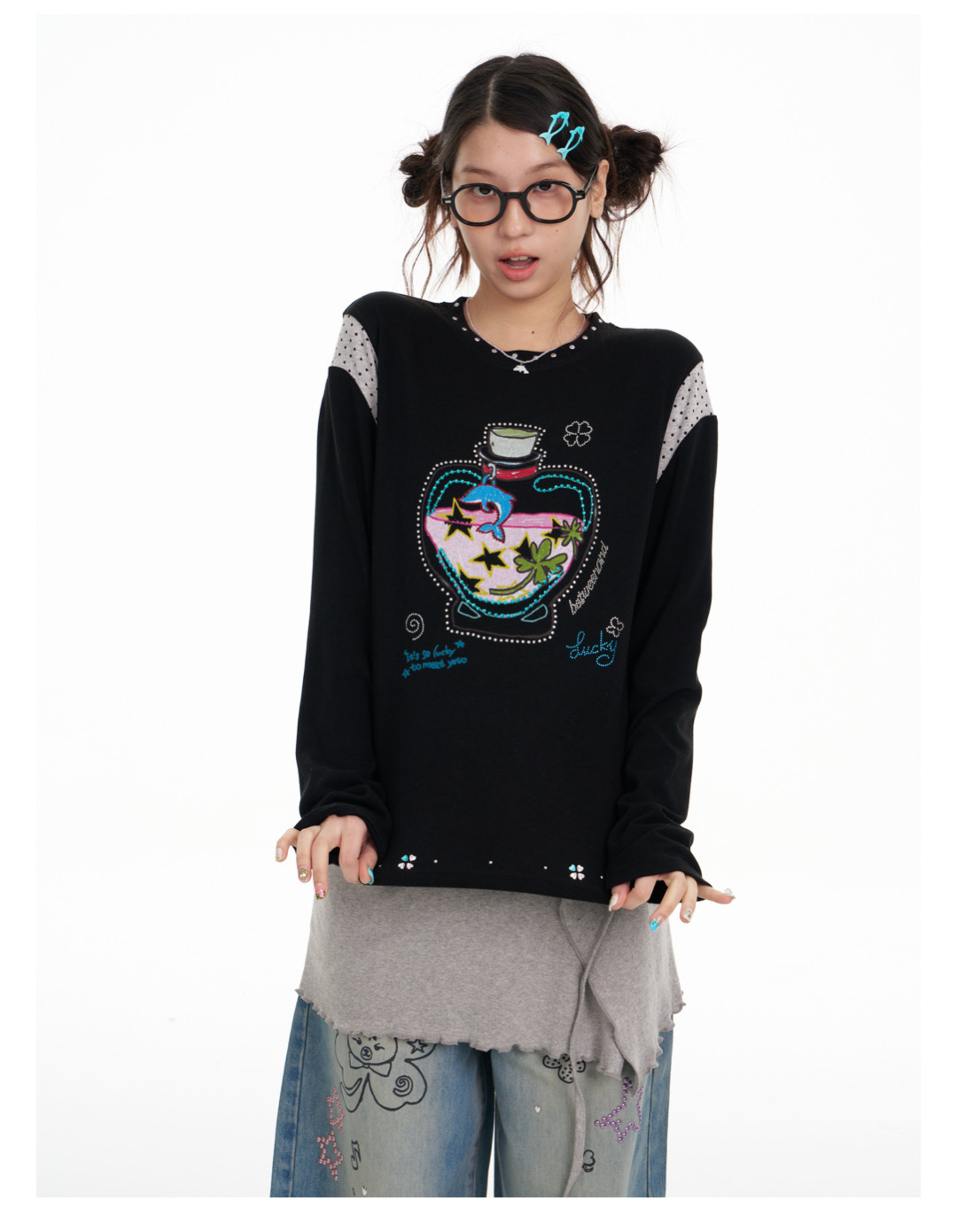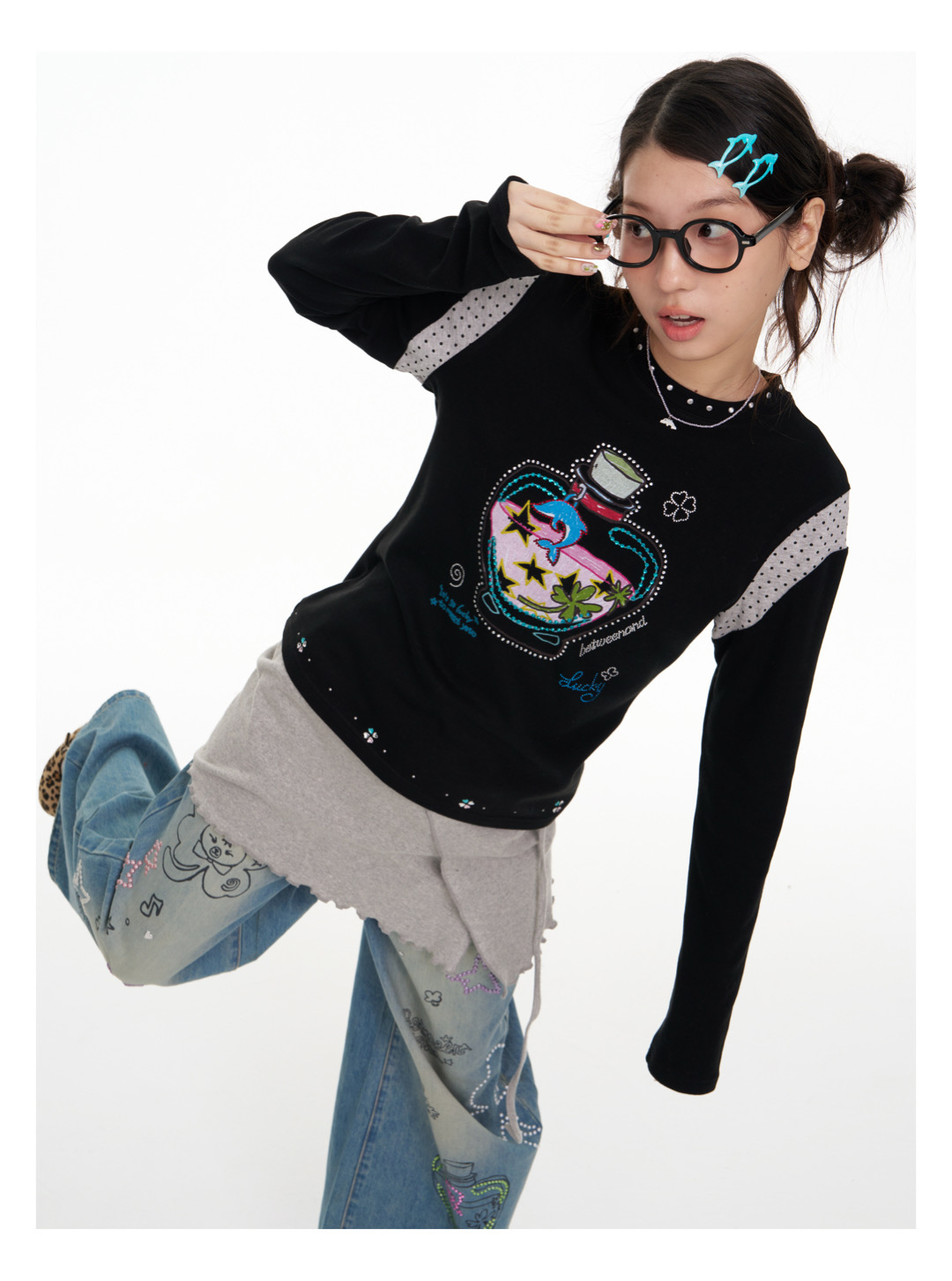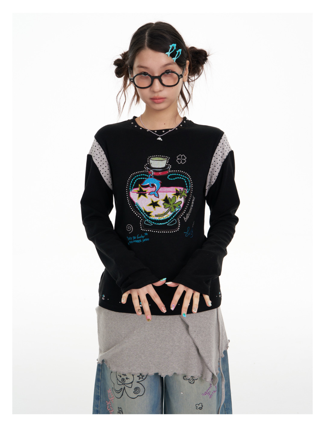 Black dolphin “lucky bottle” rhinestone patchwork long-sleeve tee Lookbook