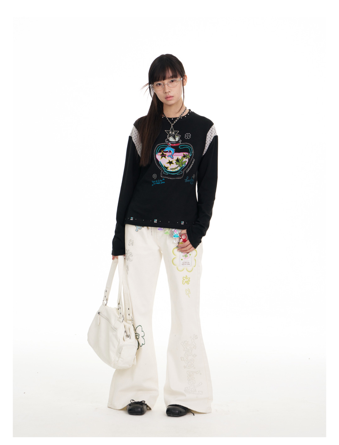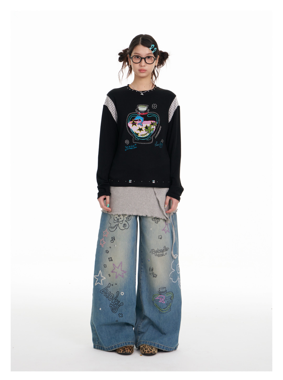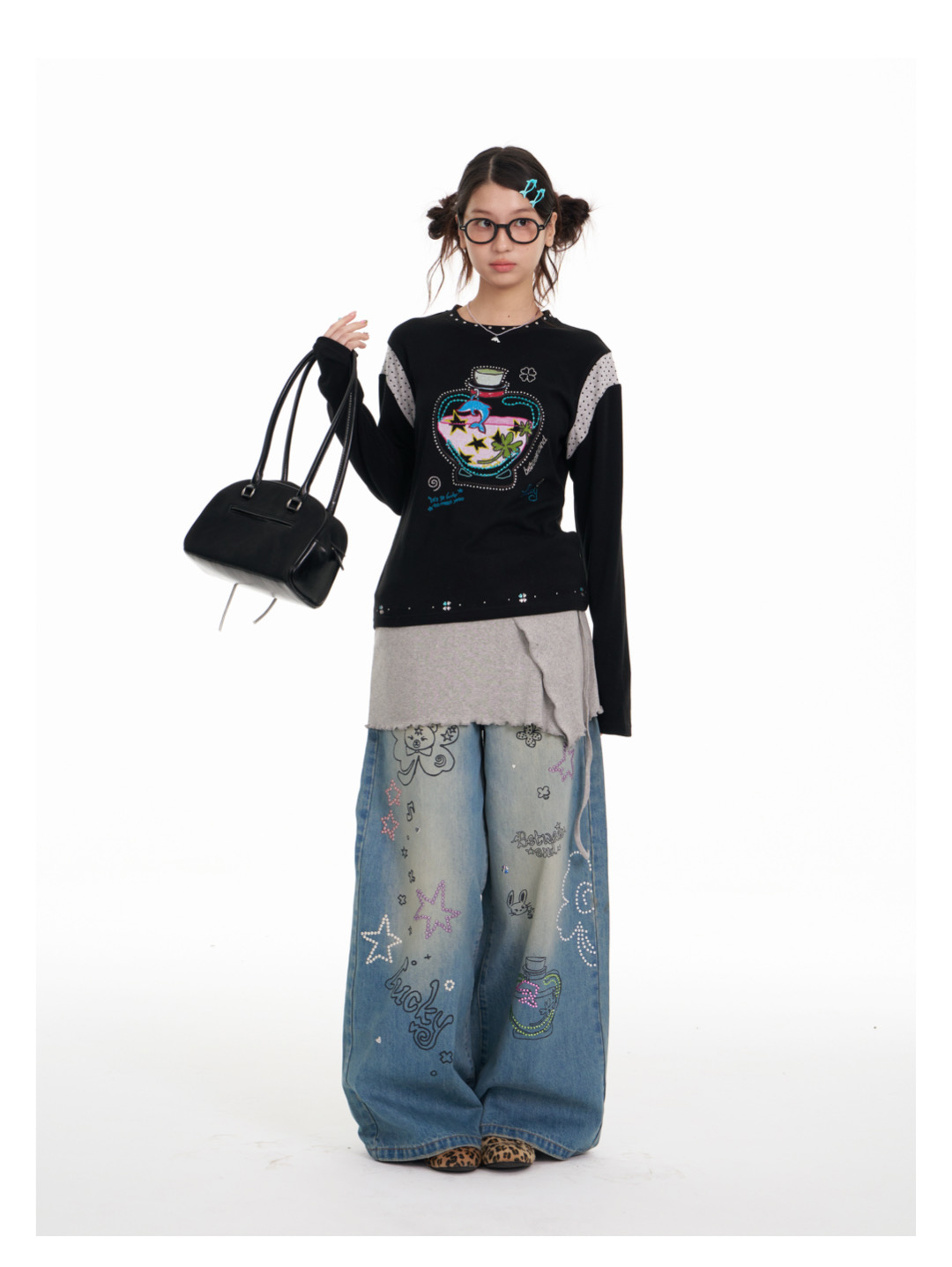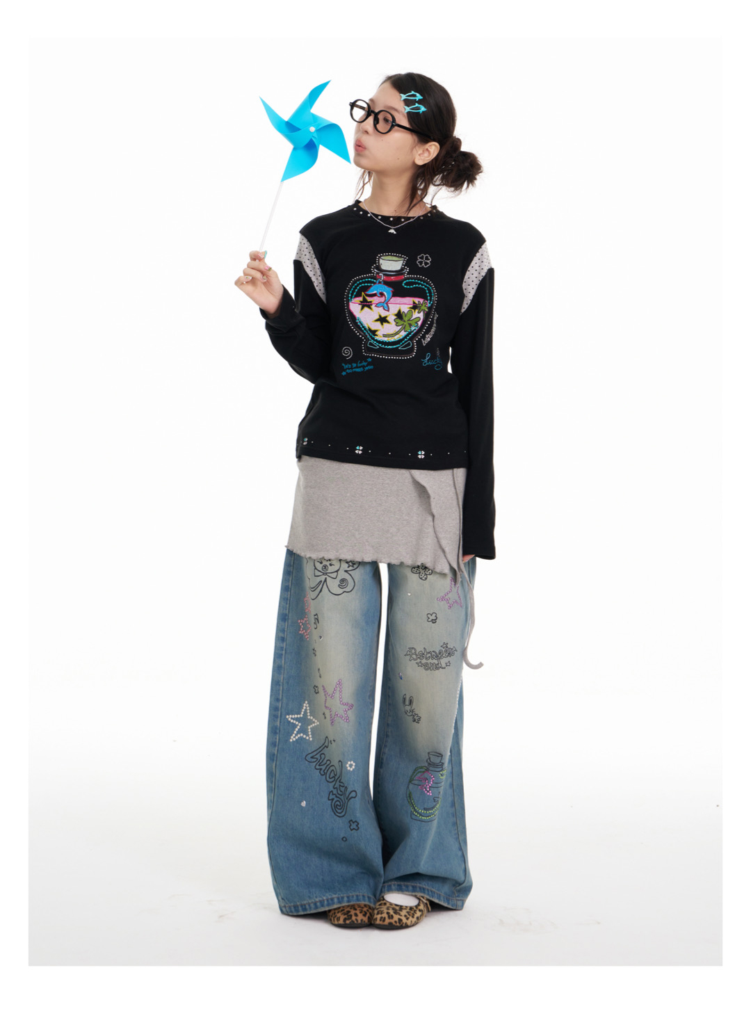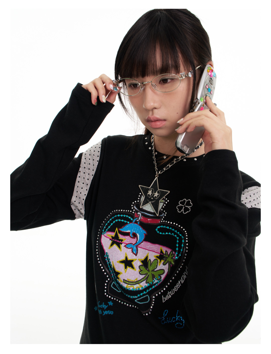 Black dolphin “lucky bottle” rhinestone patchwork long-sleeve tee Lookbook