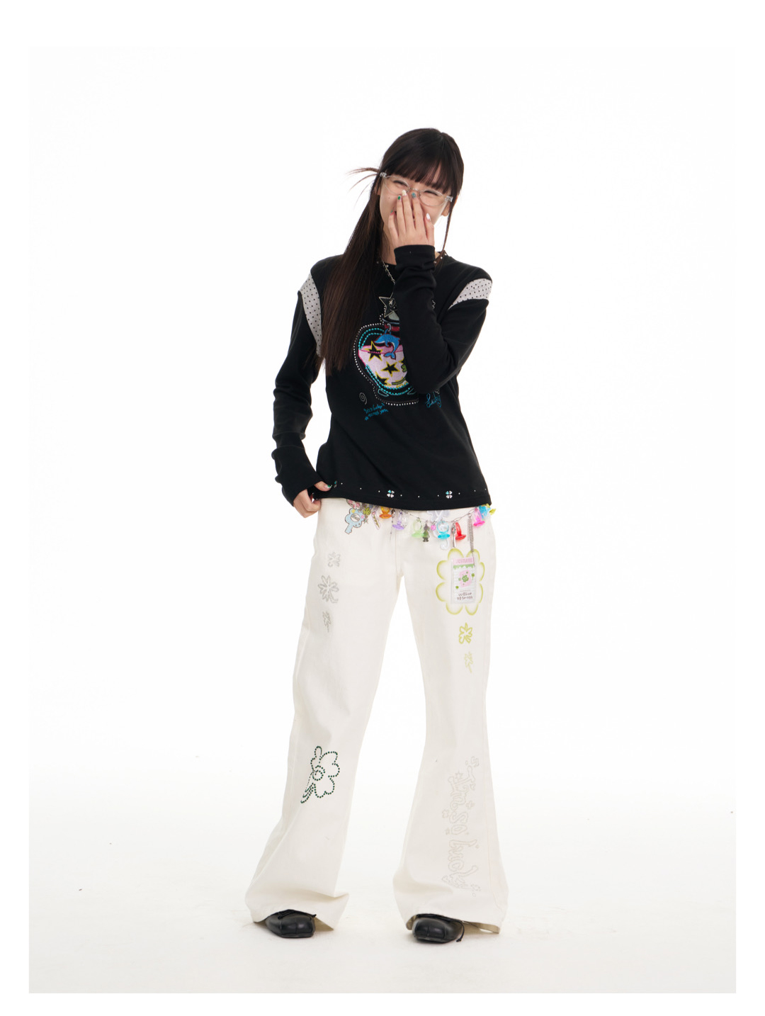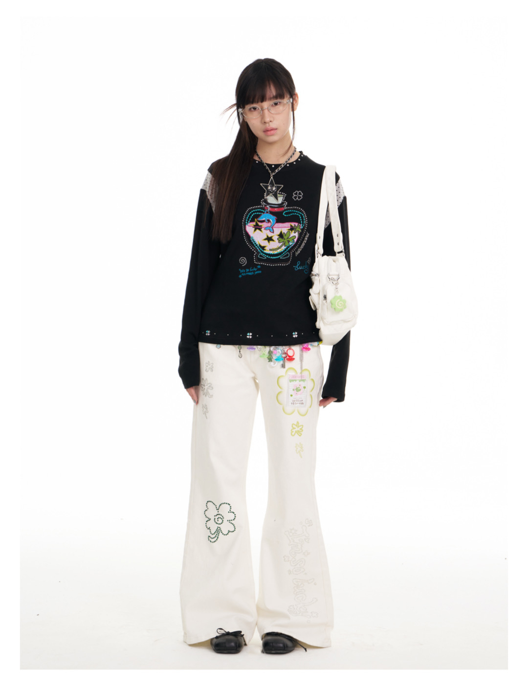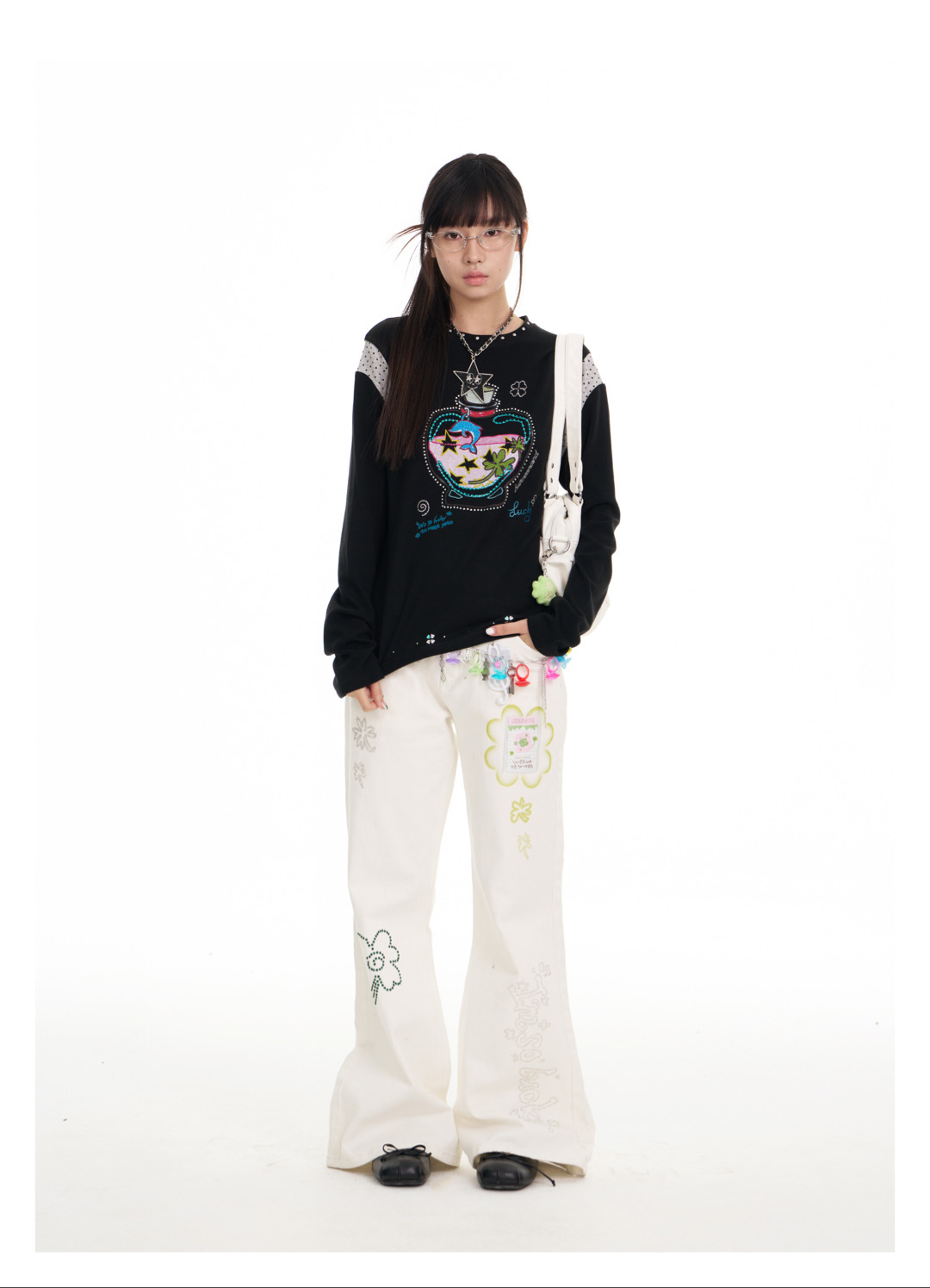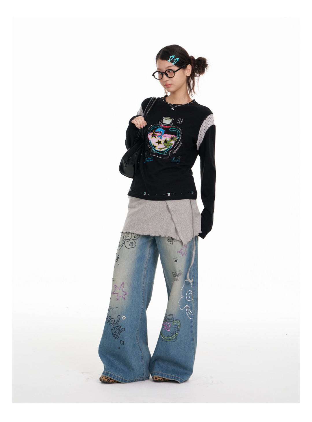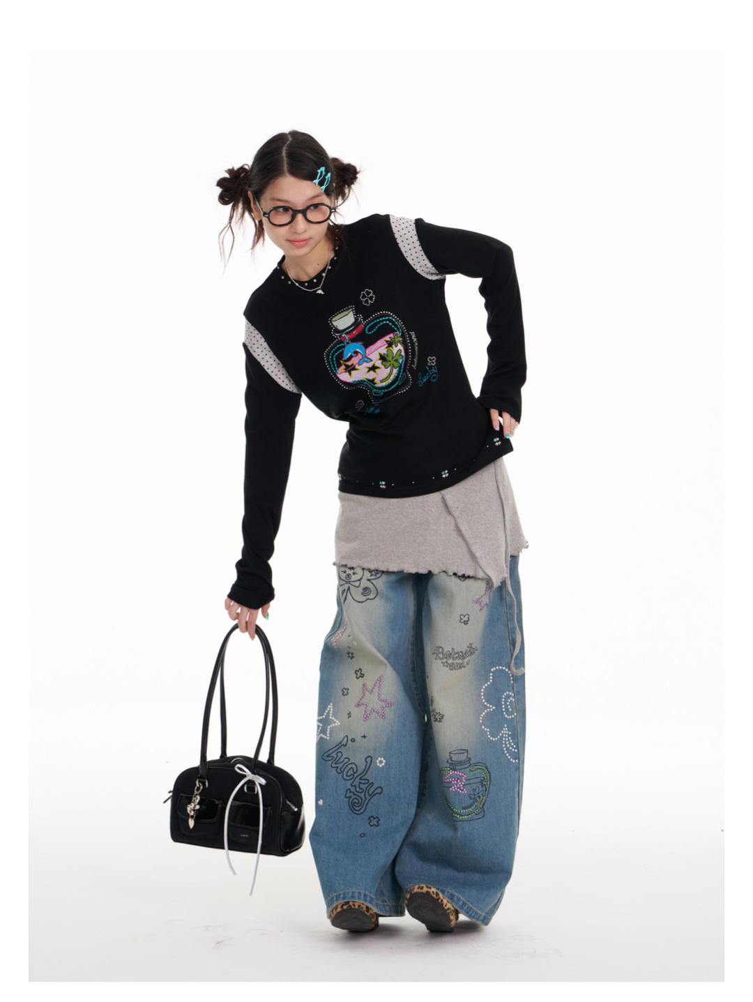 Black dolphin “lucky bottle” rhinestone patchwork long-sleeve tee Lookbook