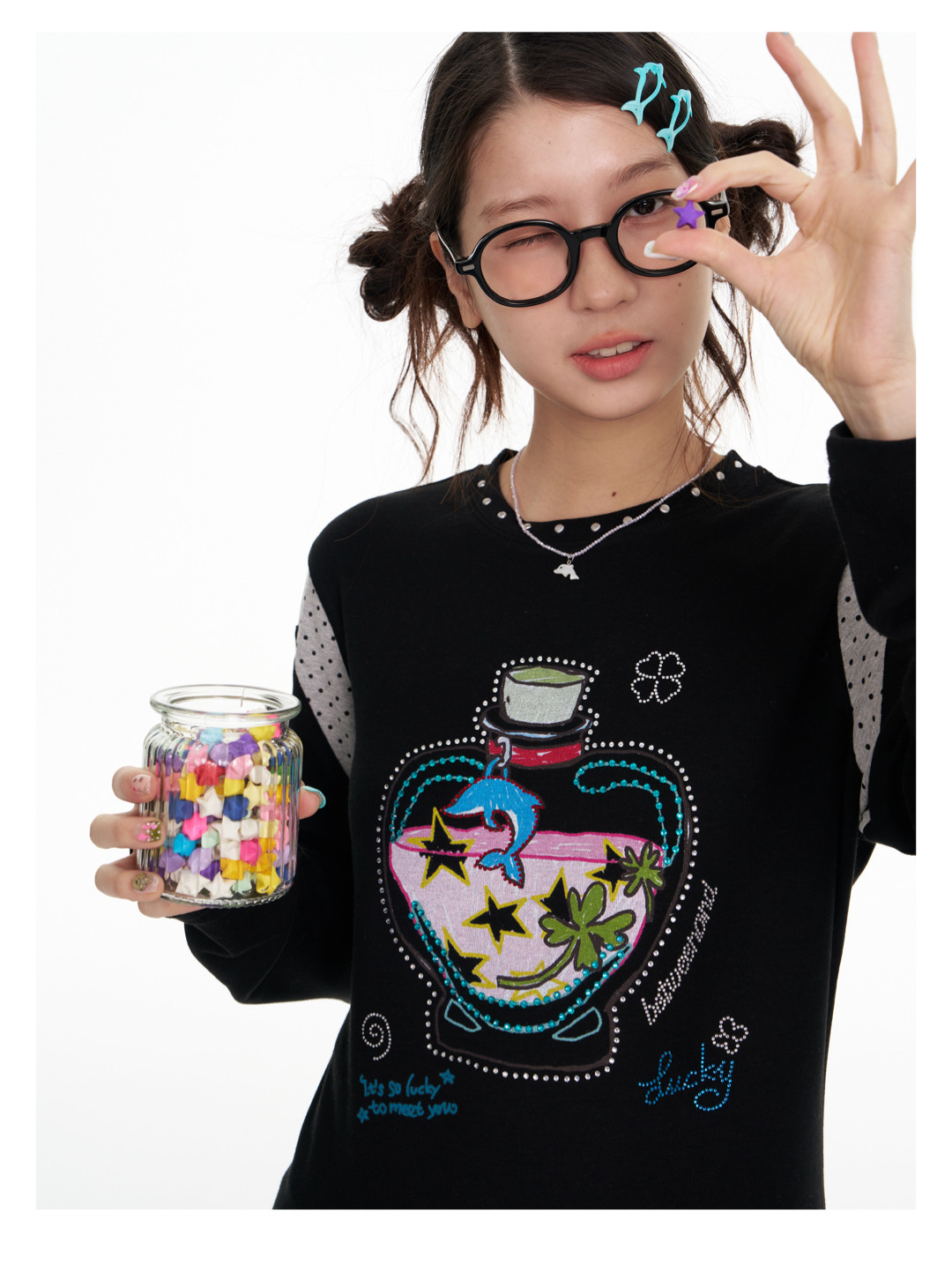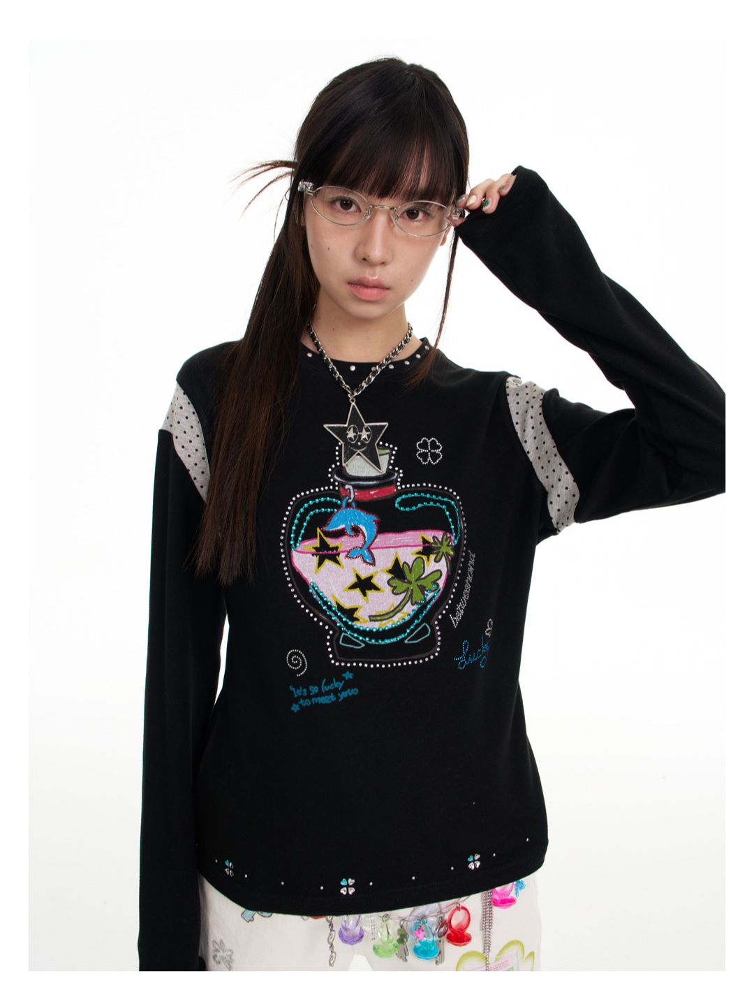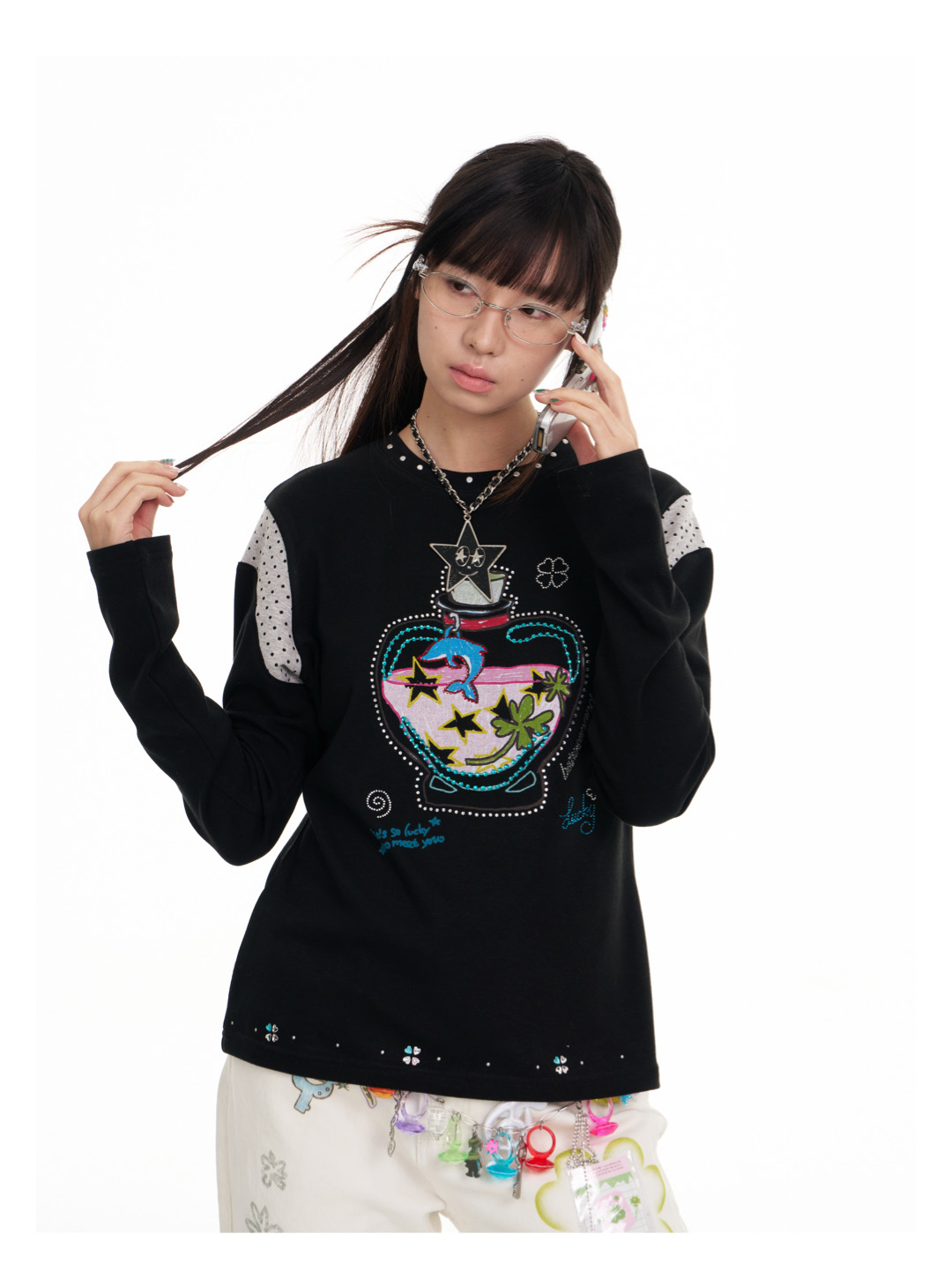 Black dolphin “lucky bottle” rhinestone patchwork long-sleeve tee