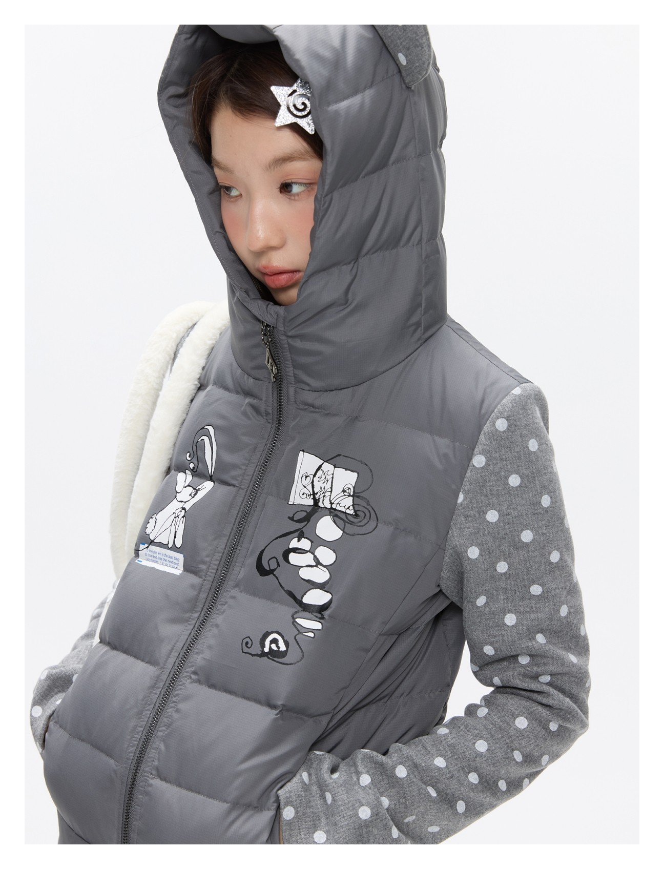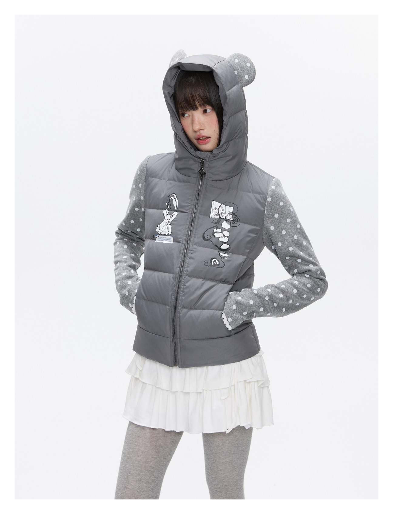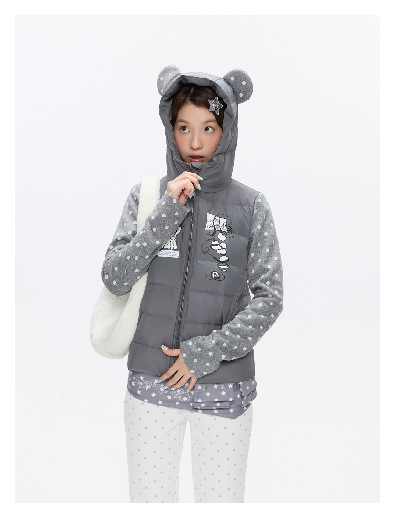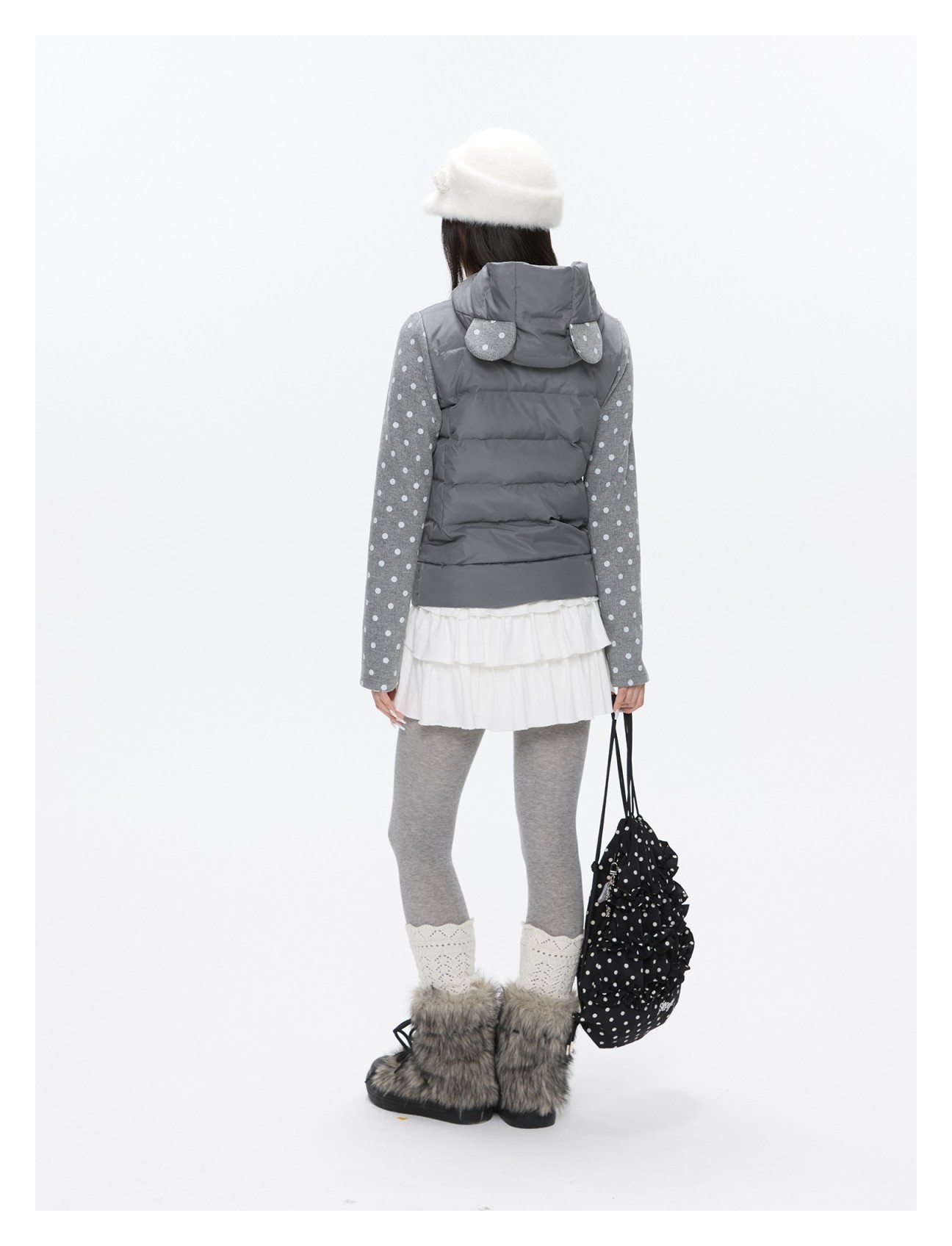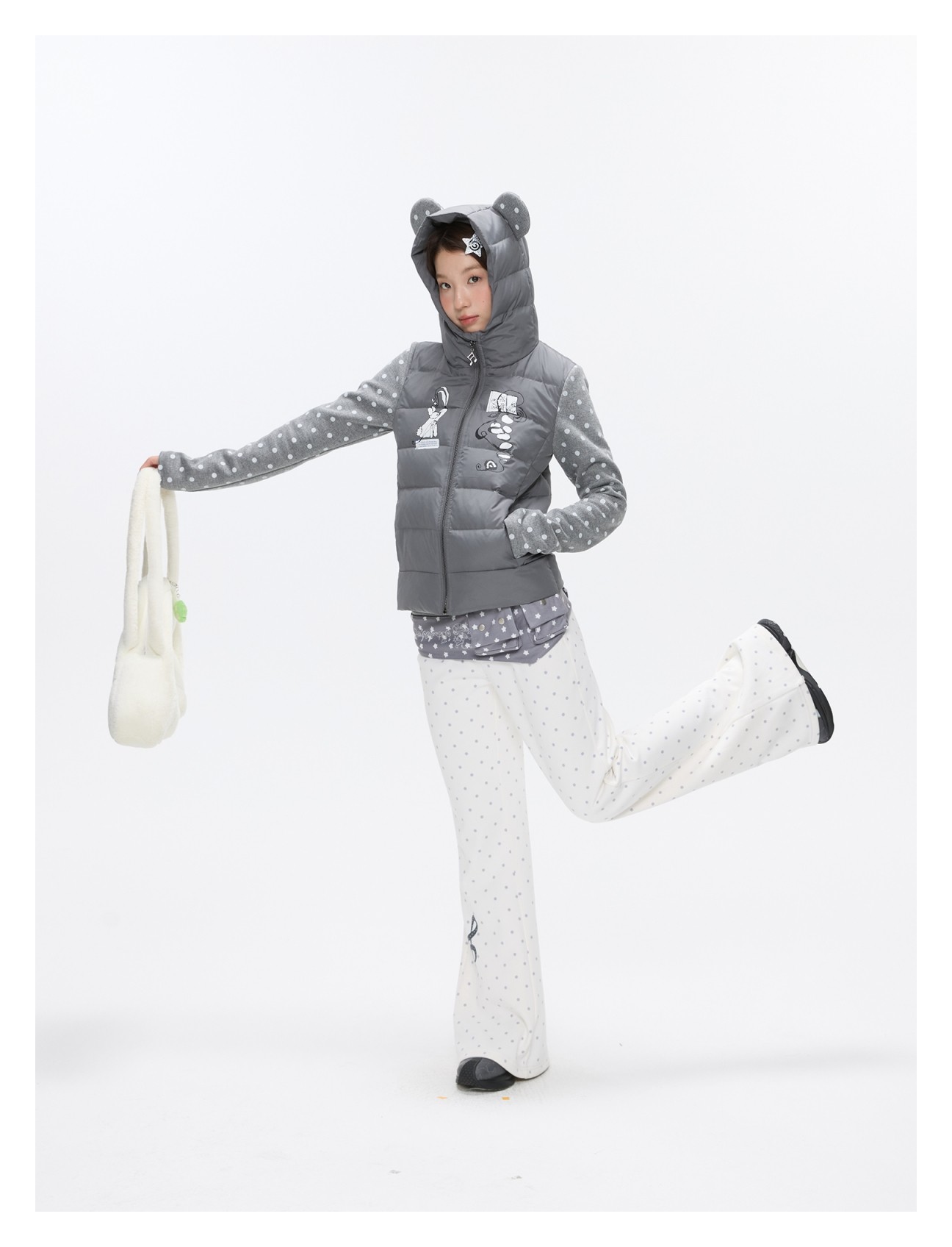 Gray polka-dot lightweight down jacket with bear-ear hood Lookbook