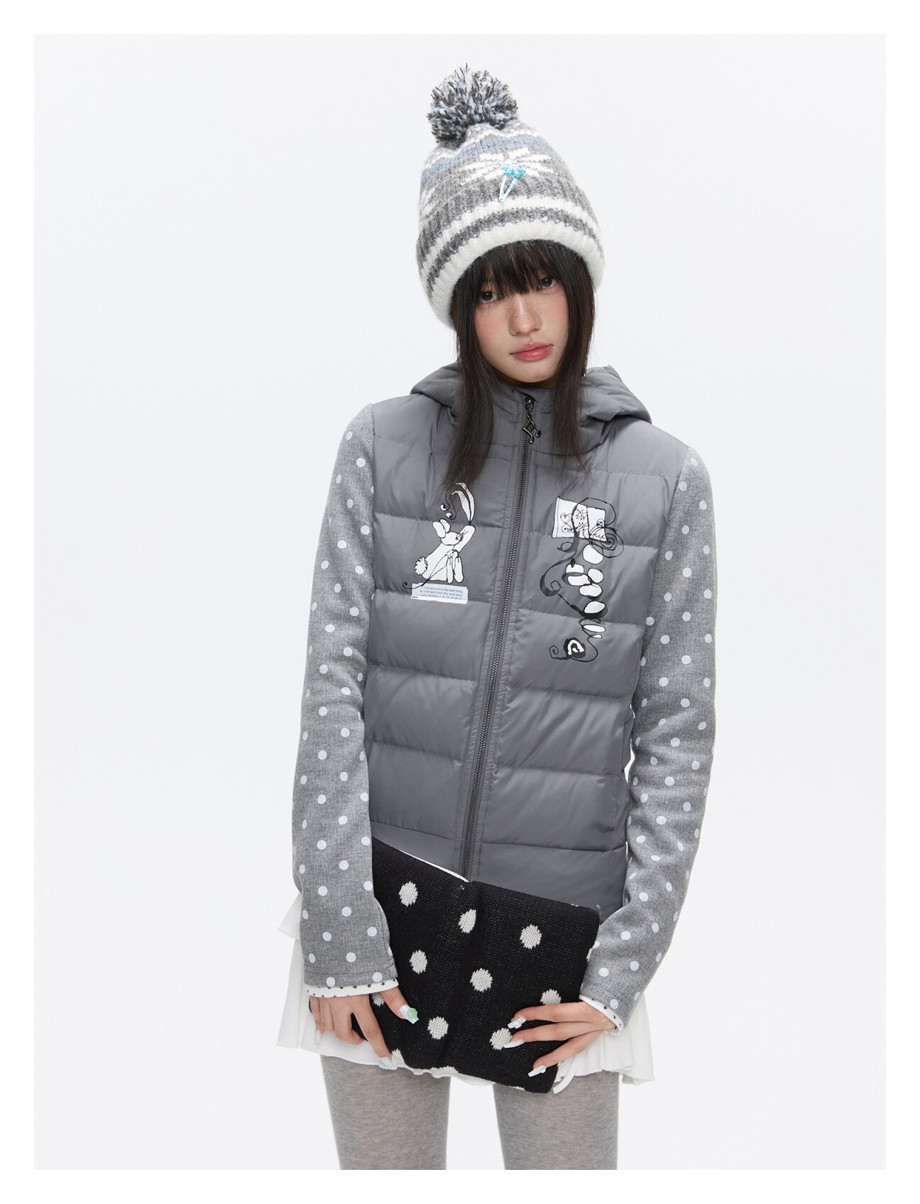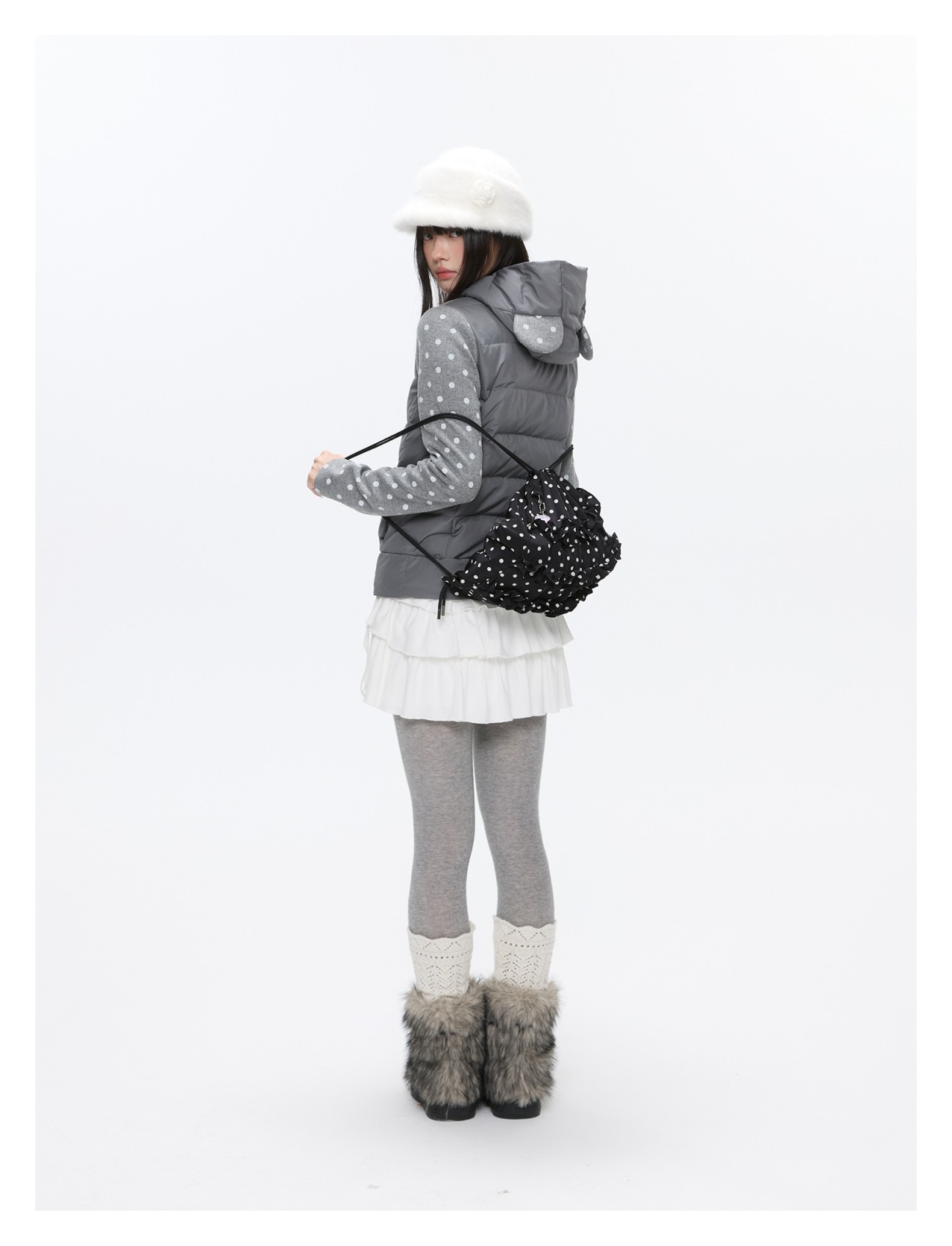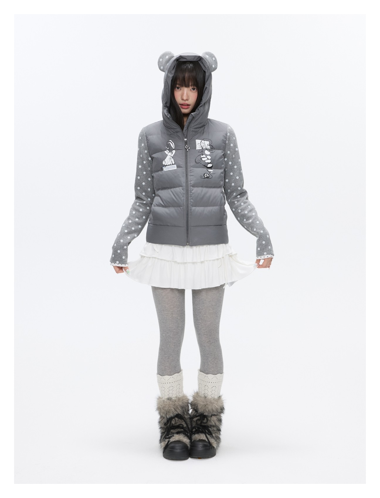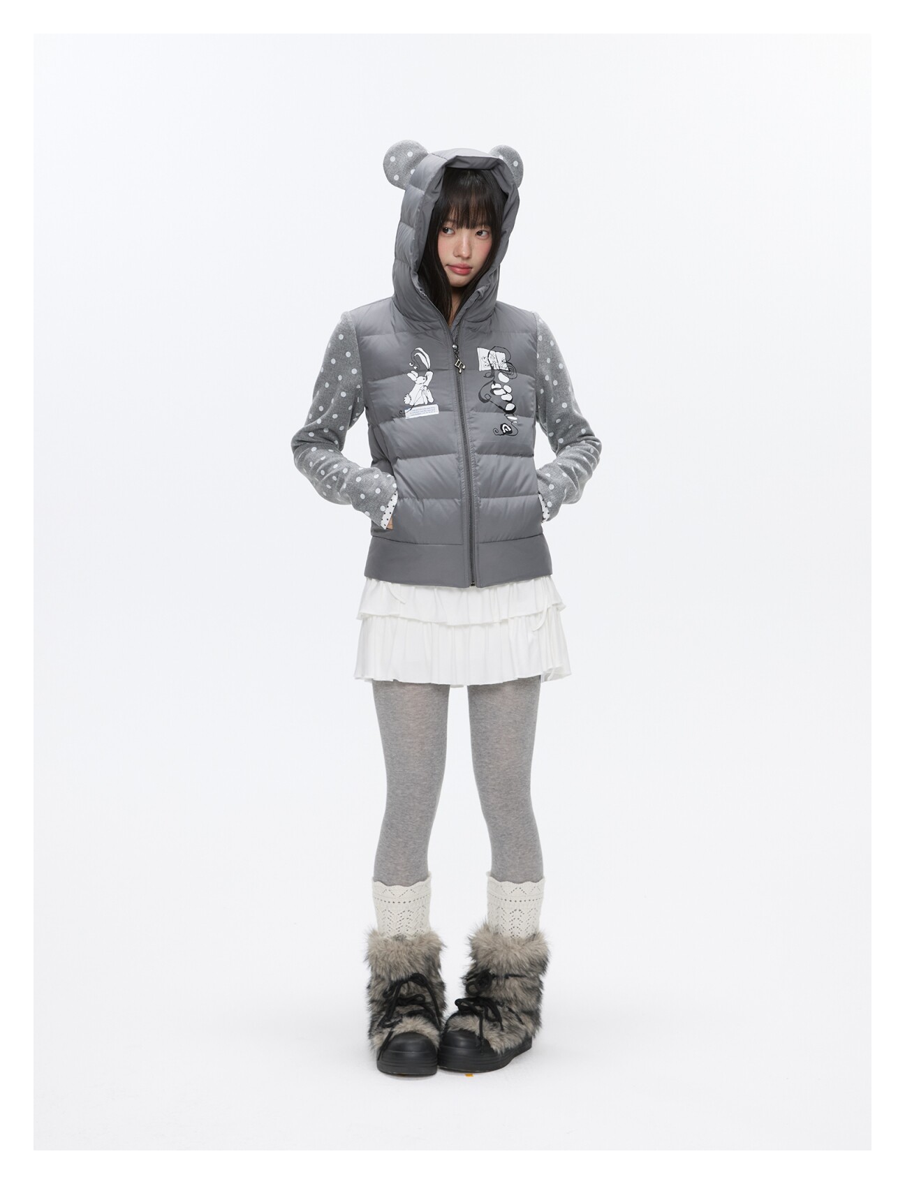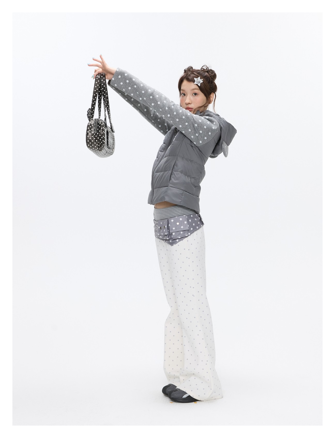 Gray polka-dot lightweight down jacket with bear-ear hood Lookbook