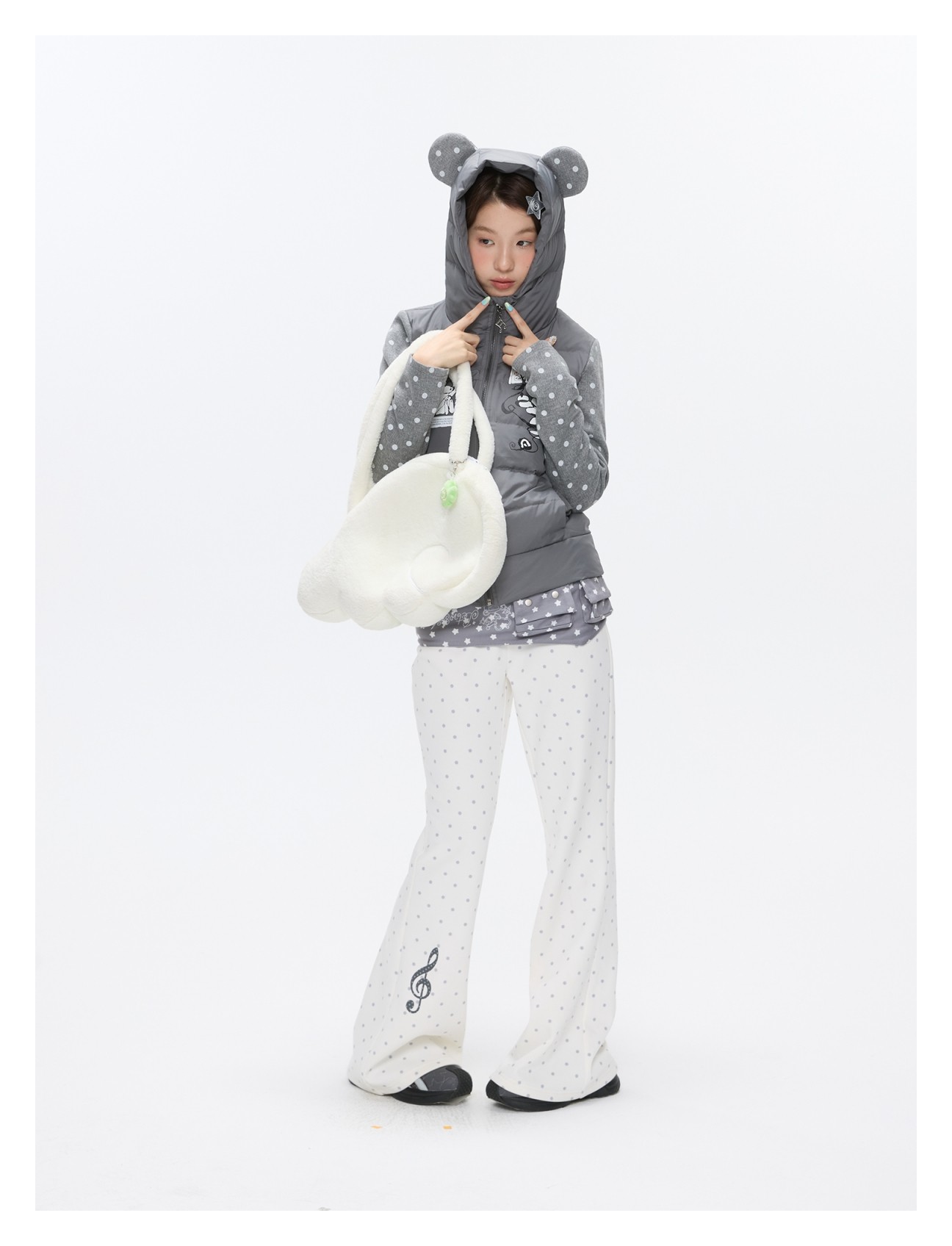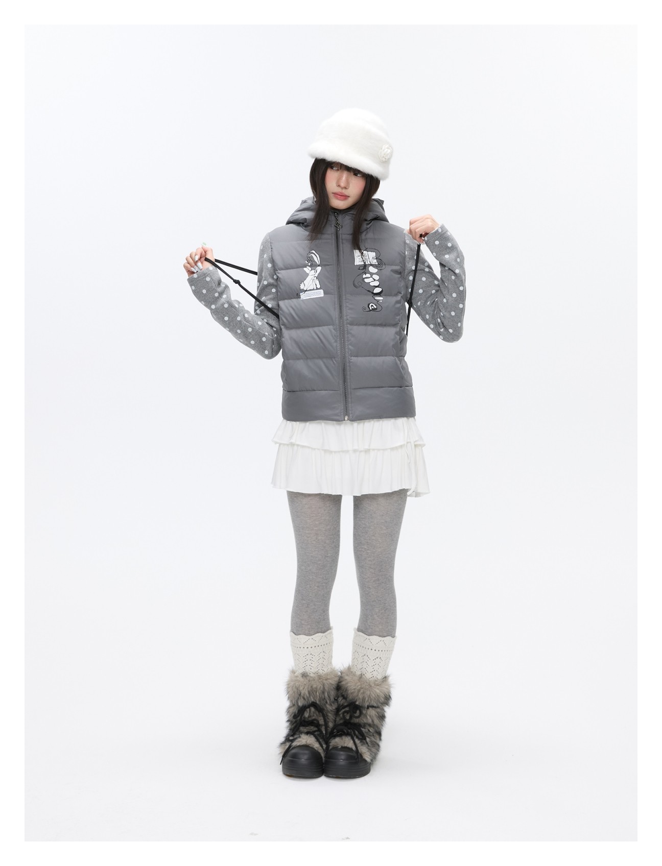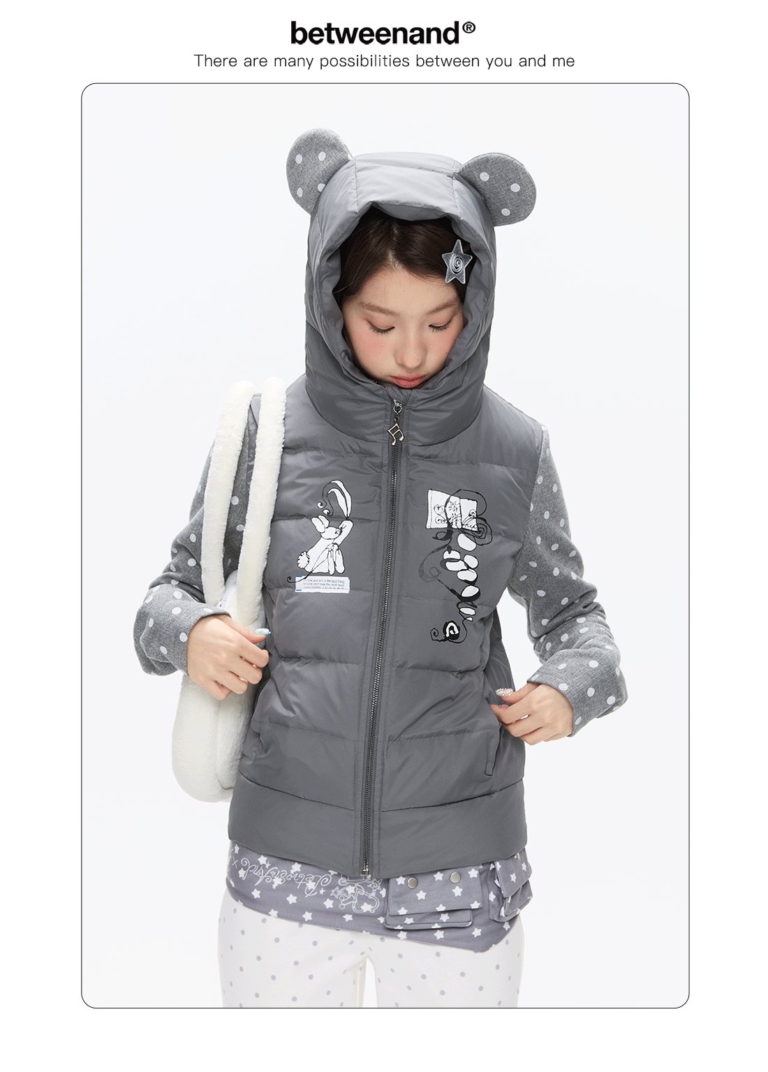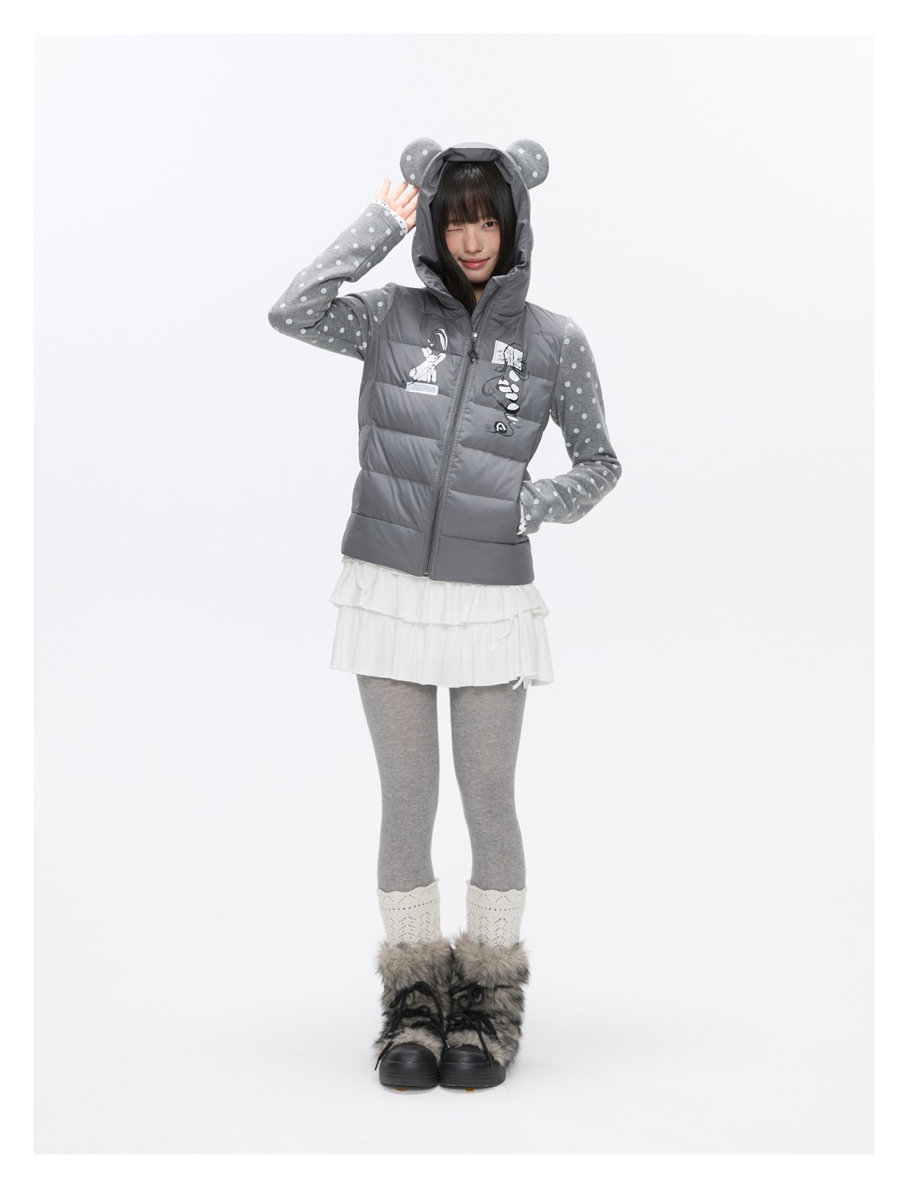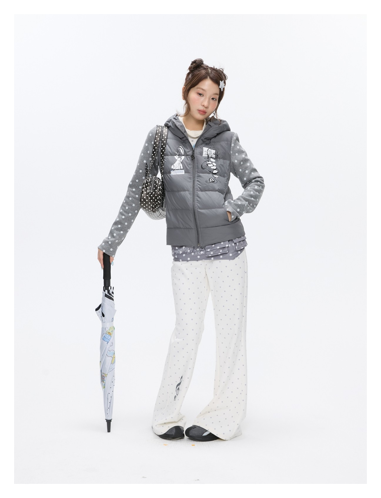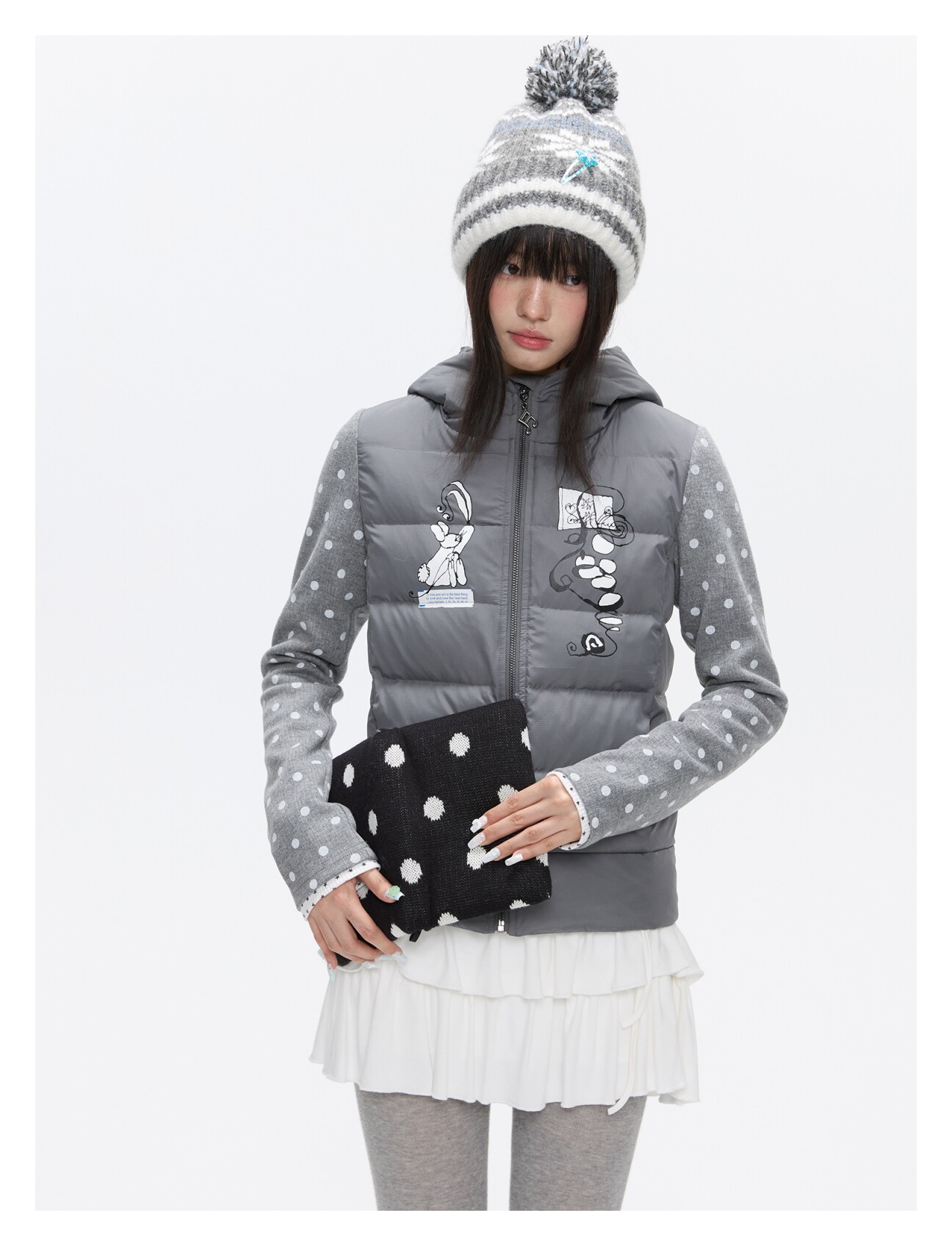 Gray polka-dot lightweight down jacket with bear-ear hood Lookbook