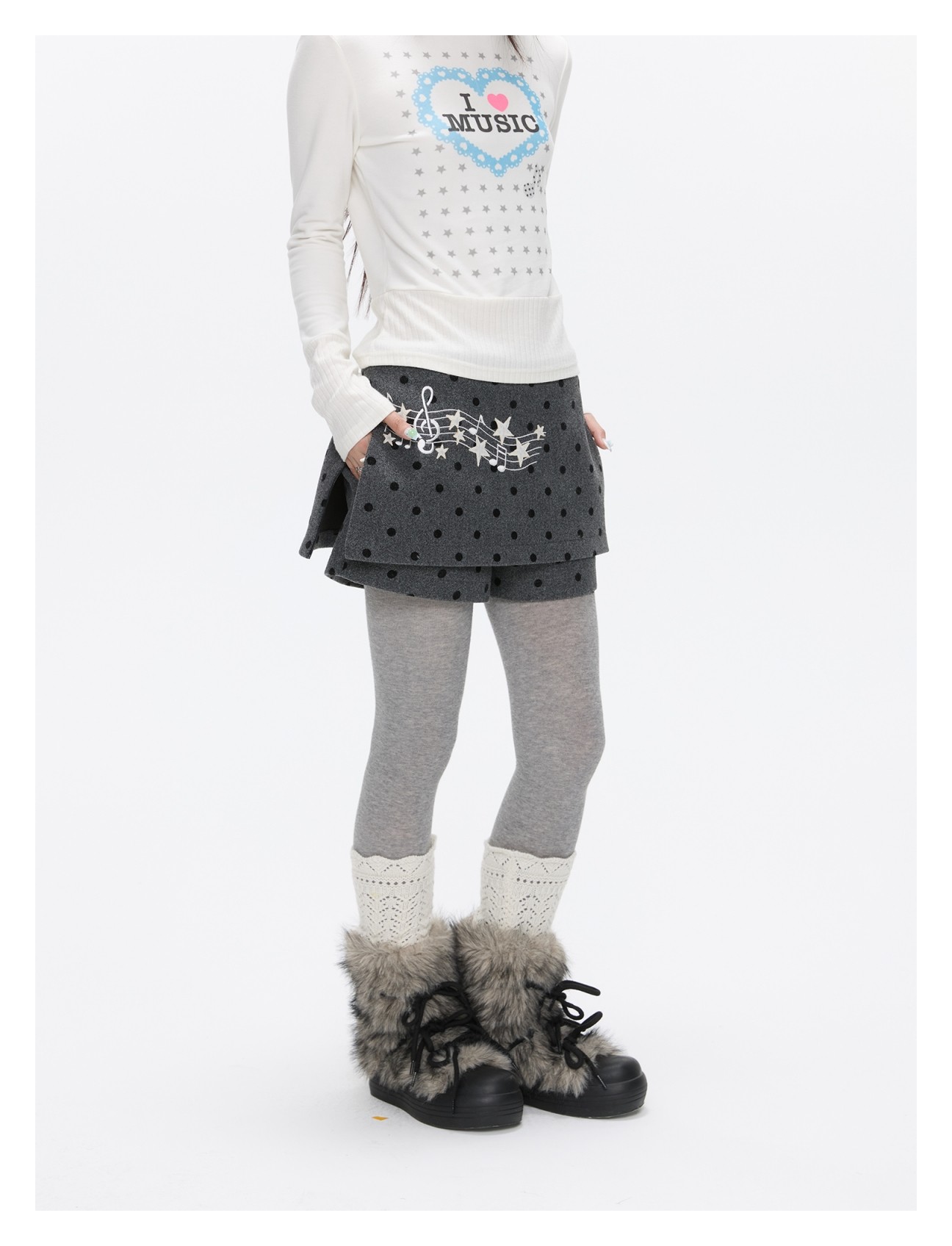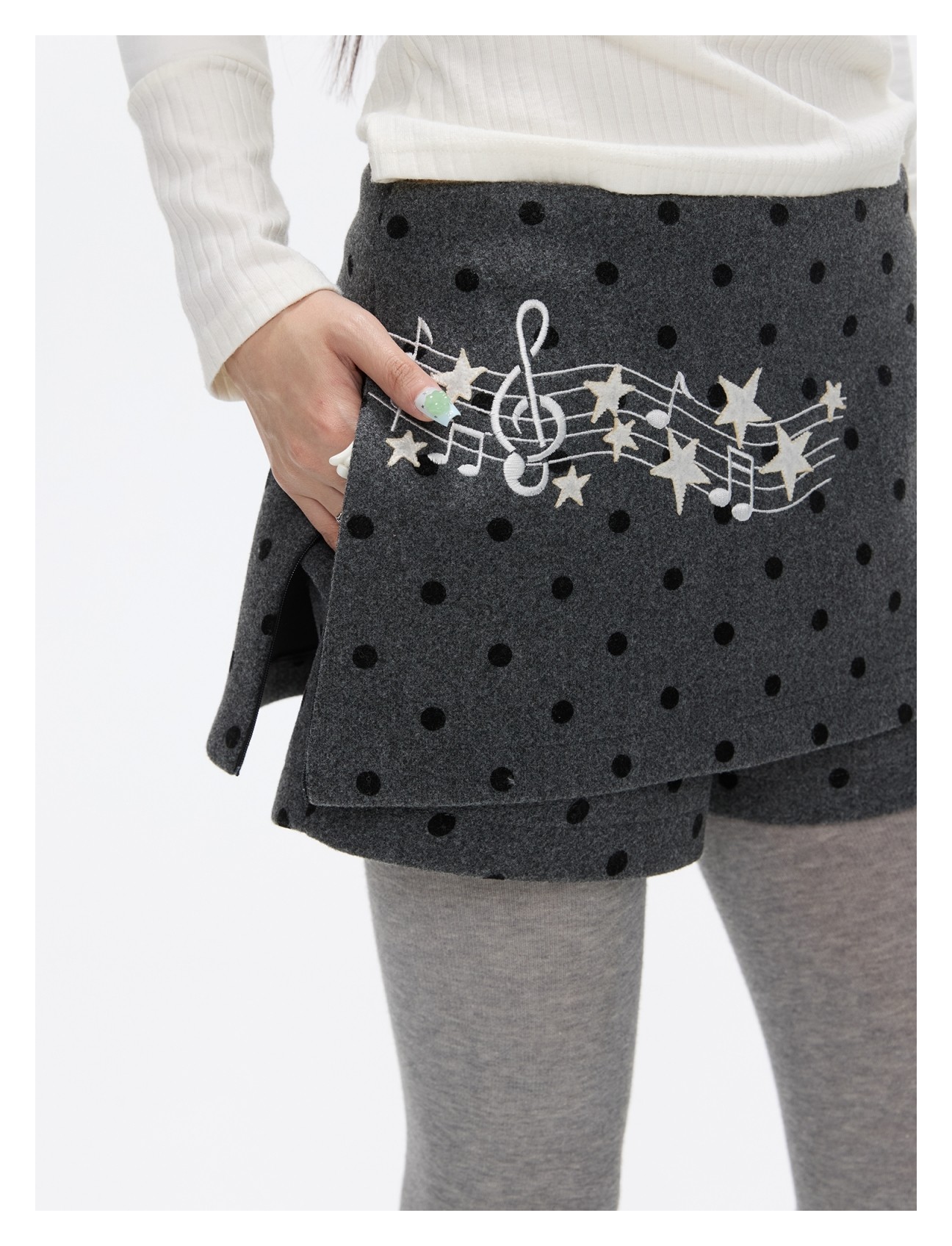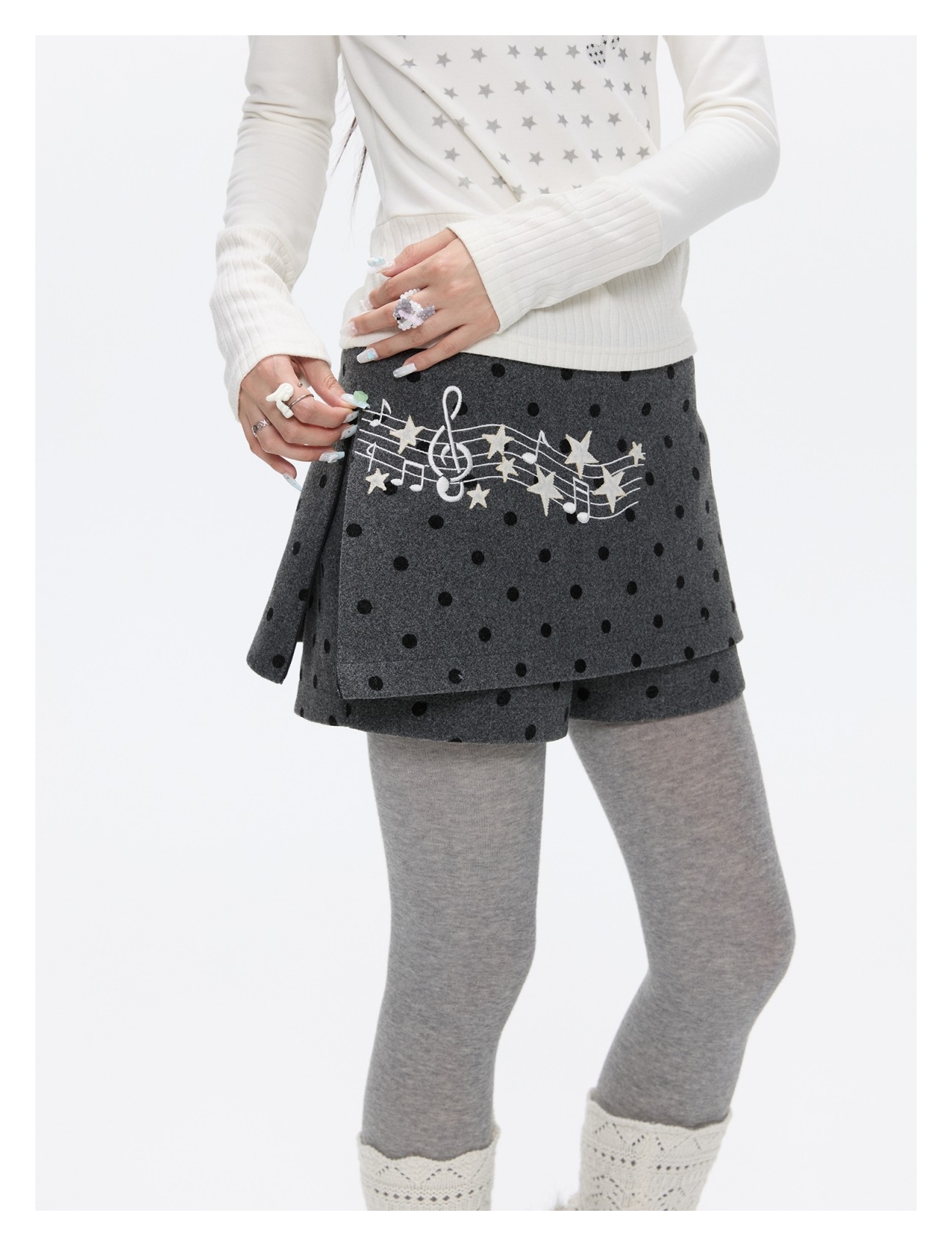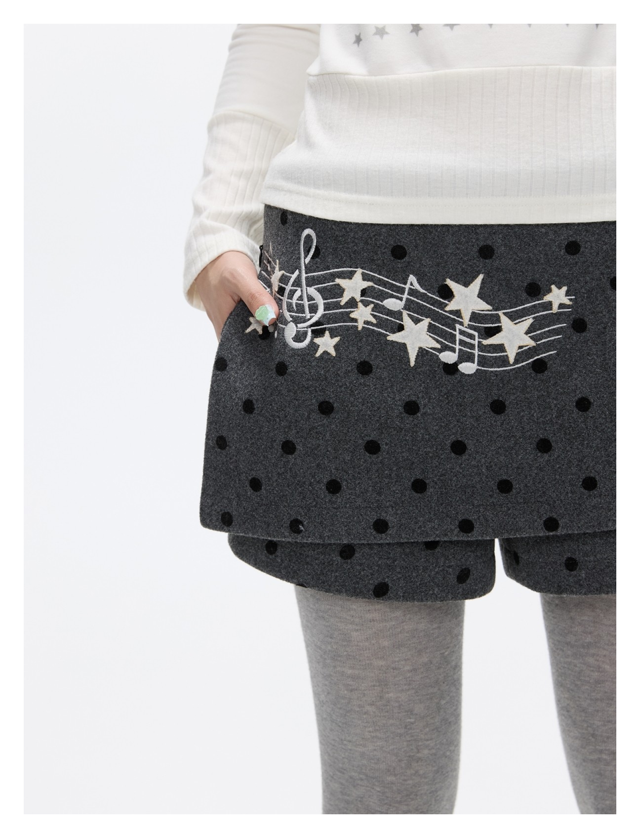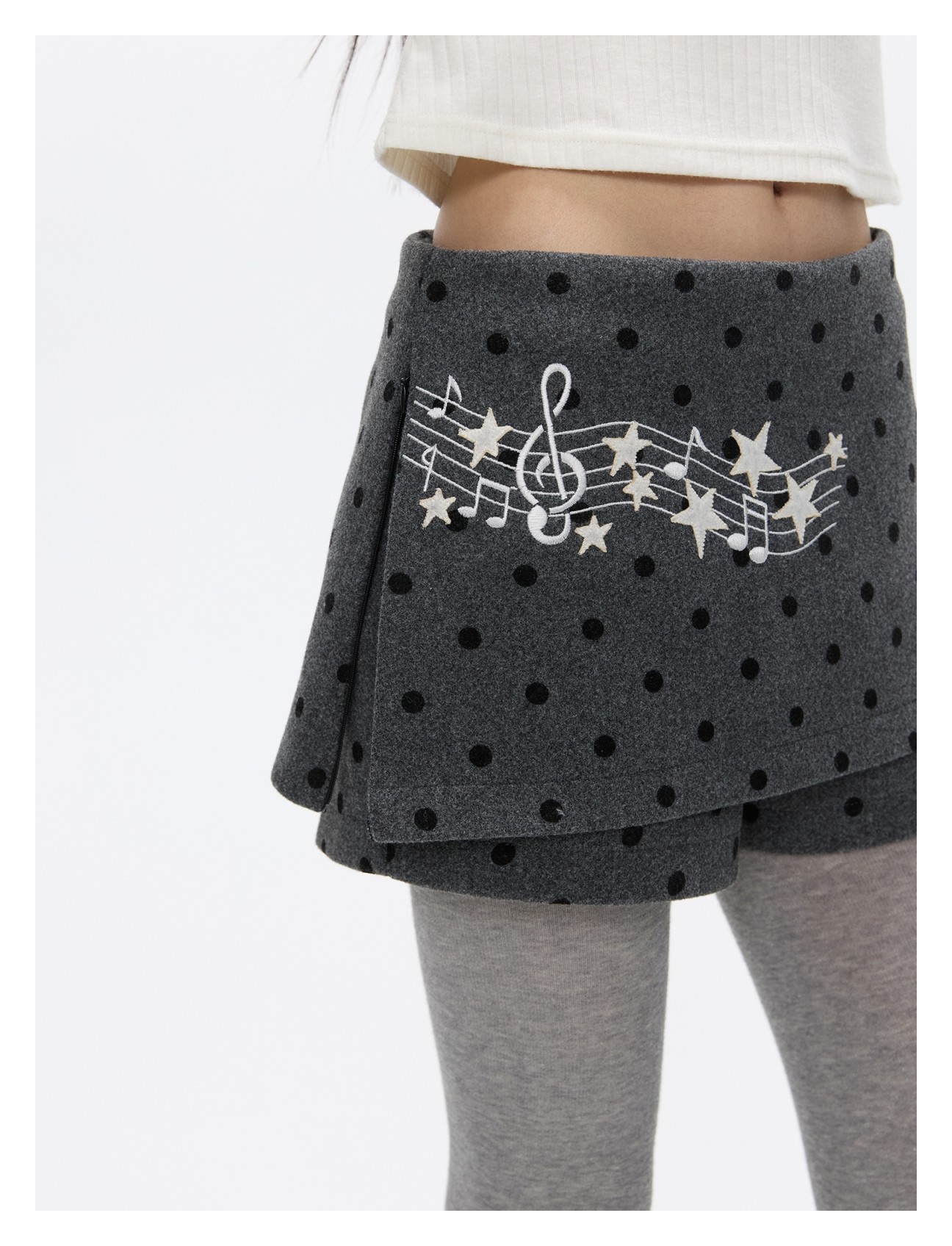 Grey wool skort with music-note polka-dot design Lookbook