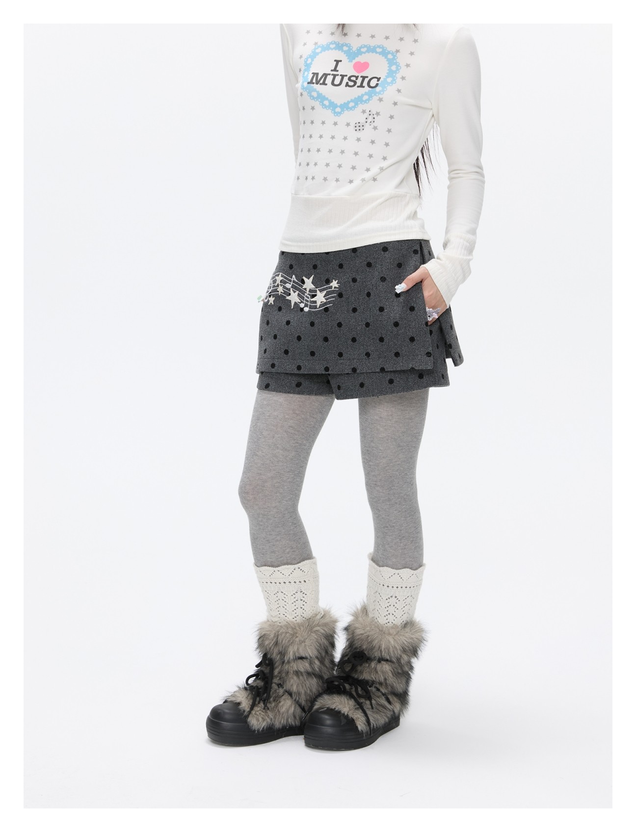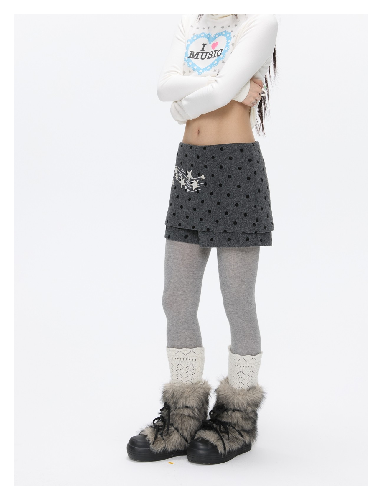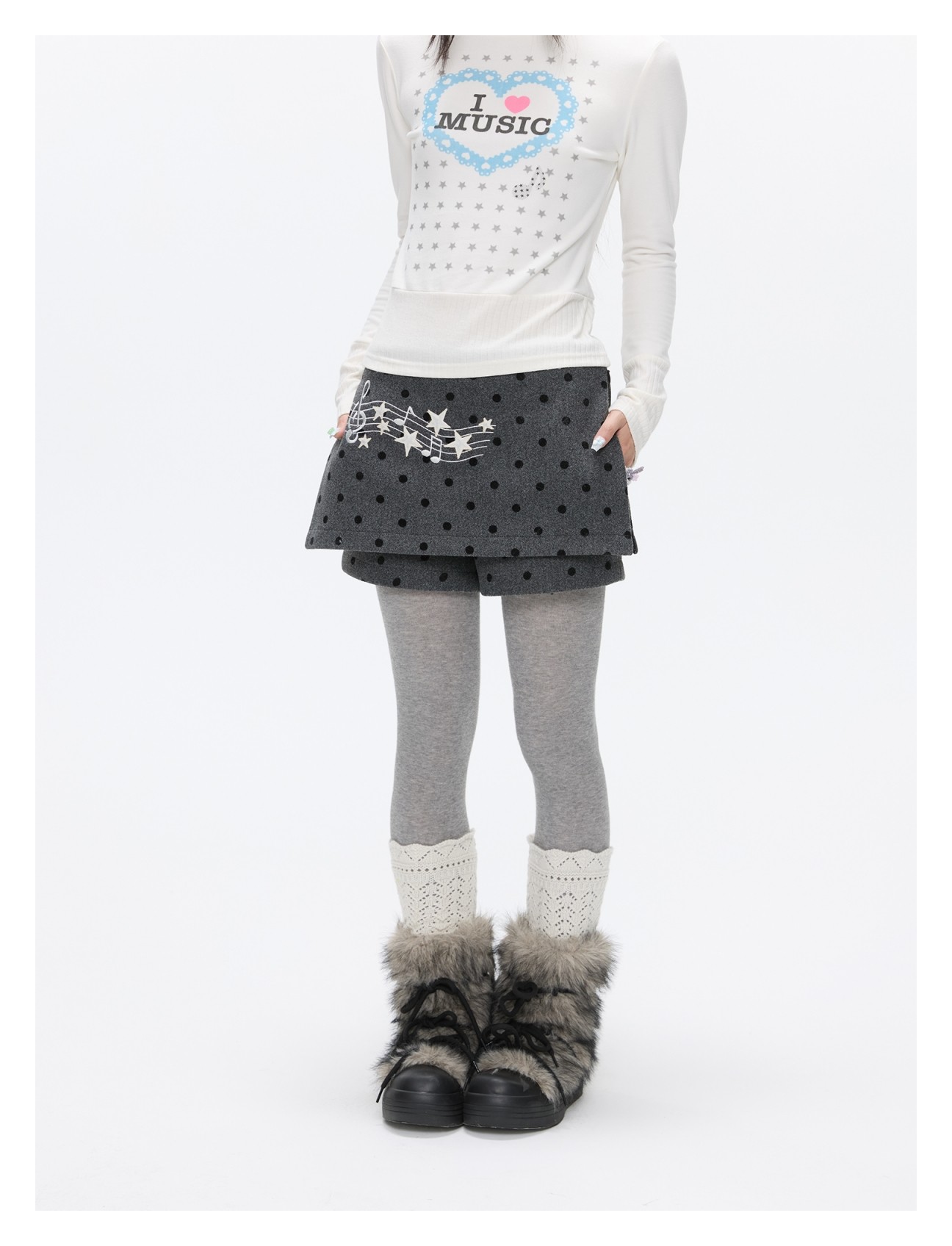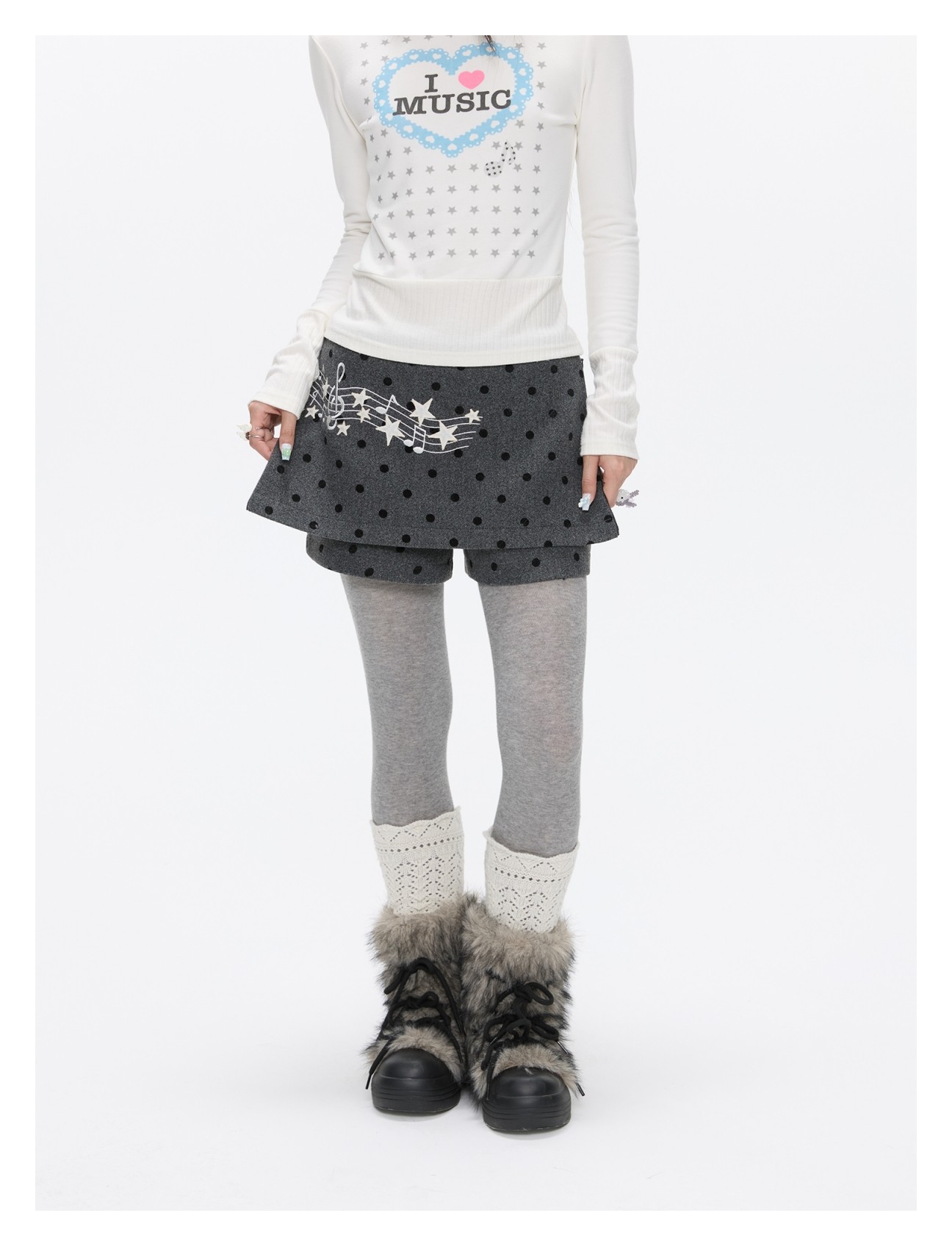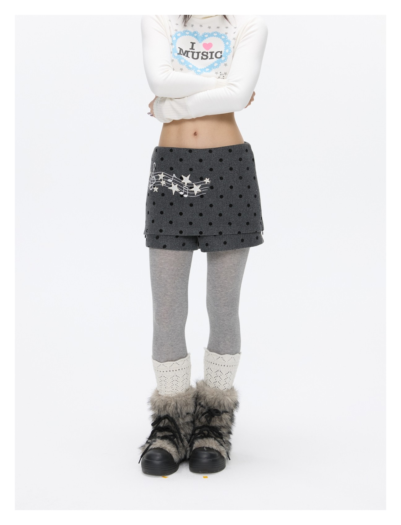 Grey wool skort with music-note polka-dot design Lookbook