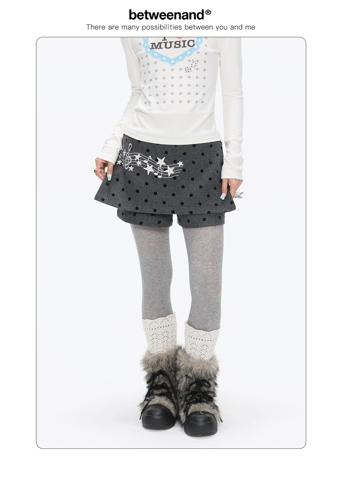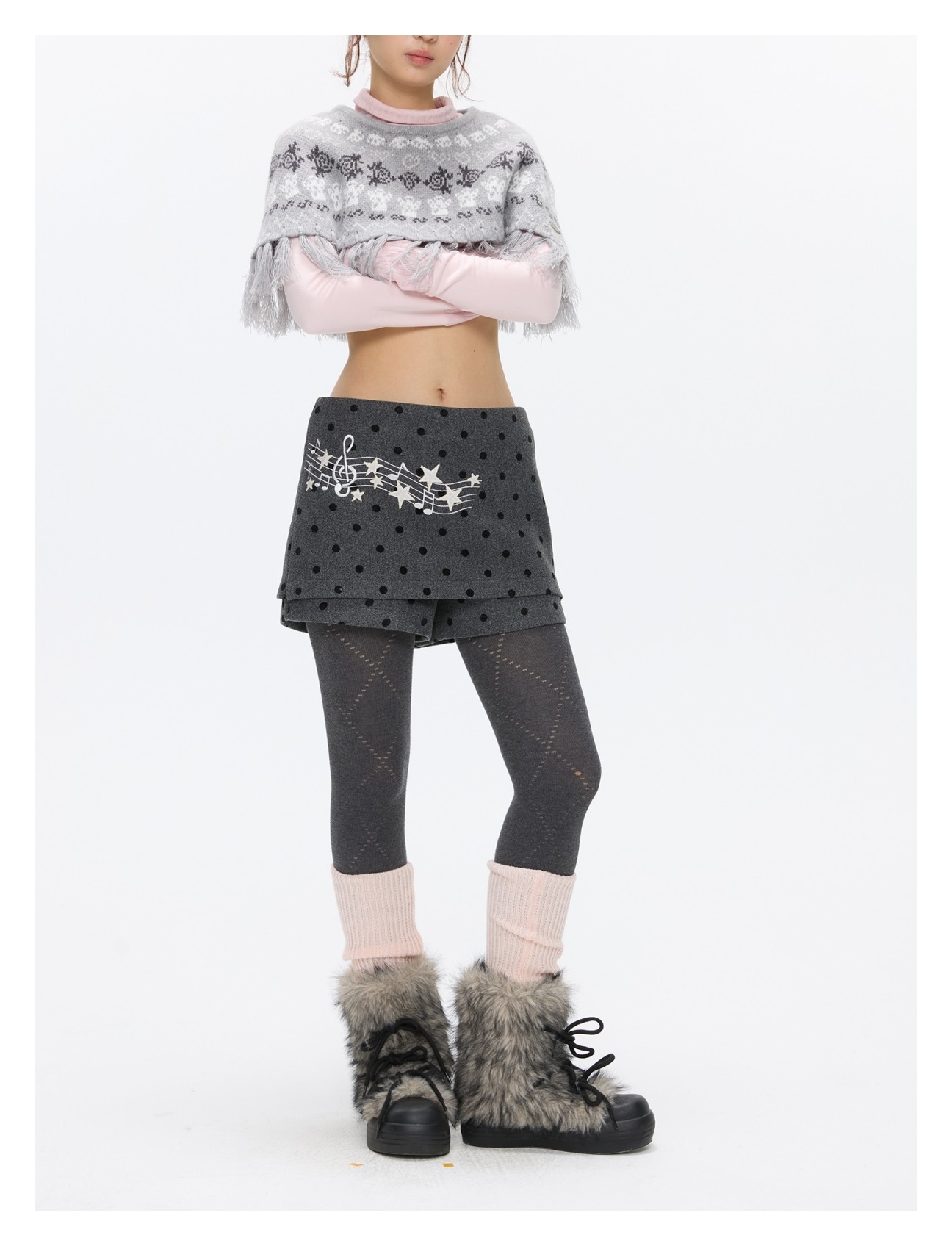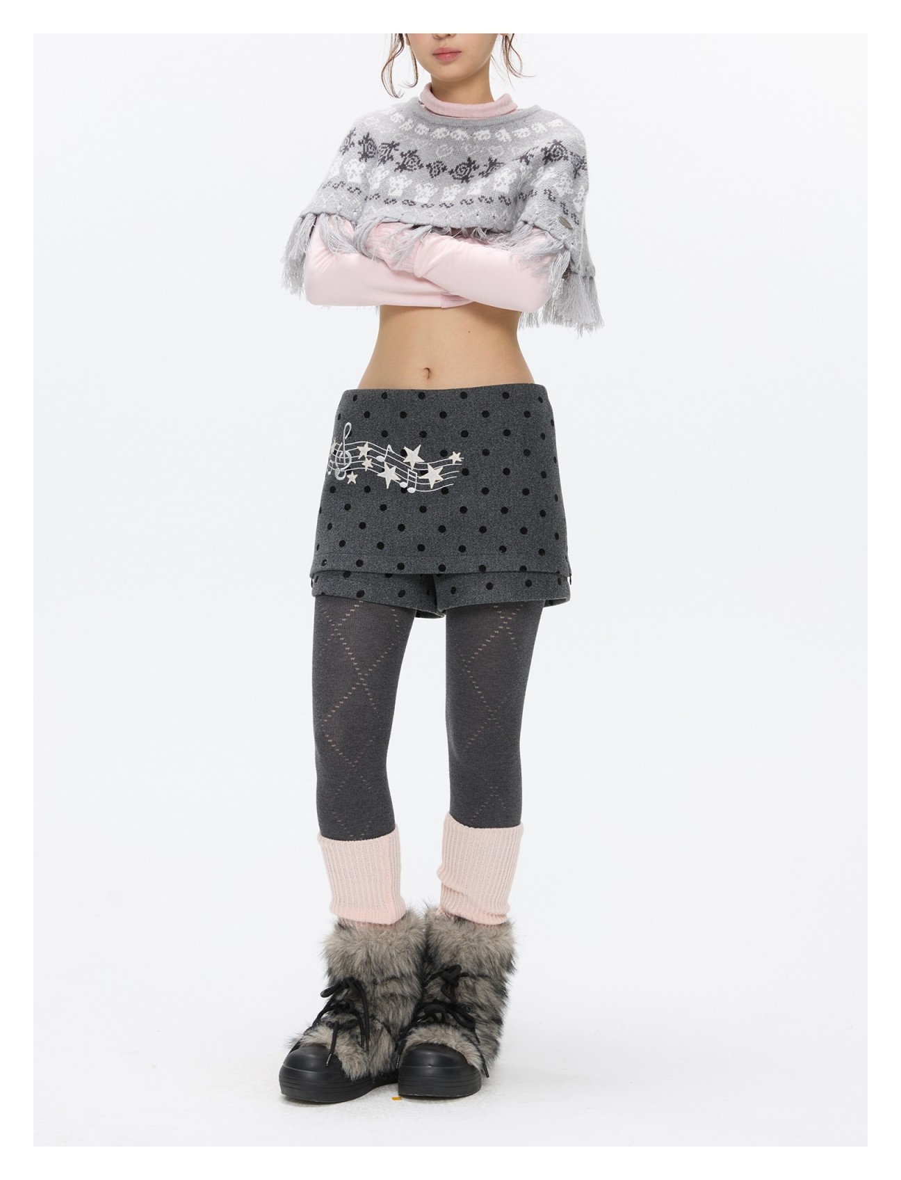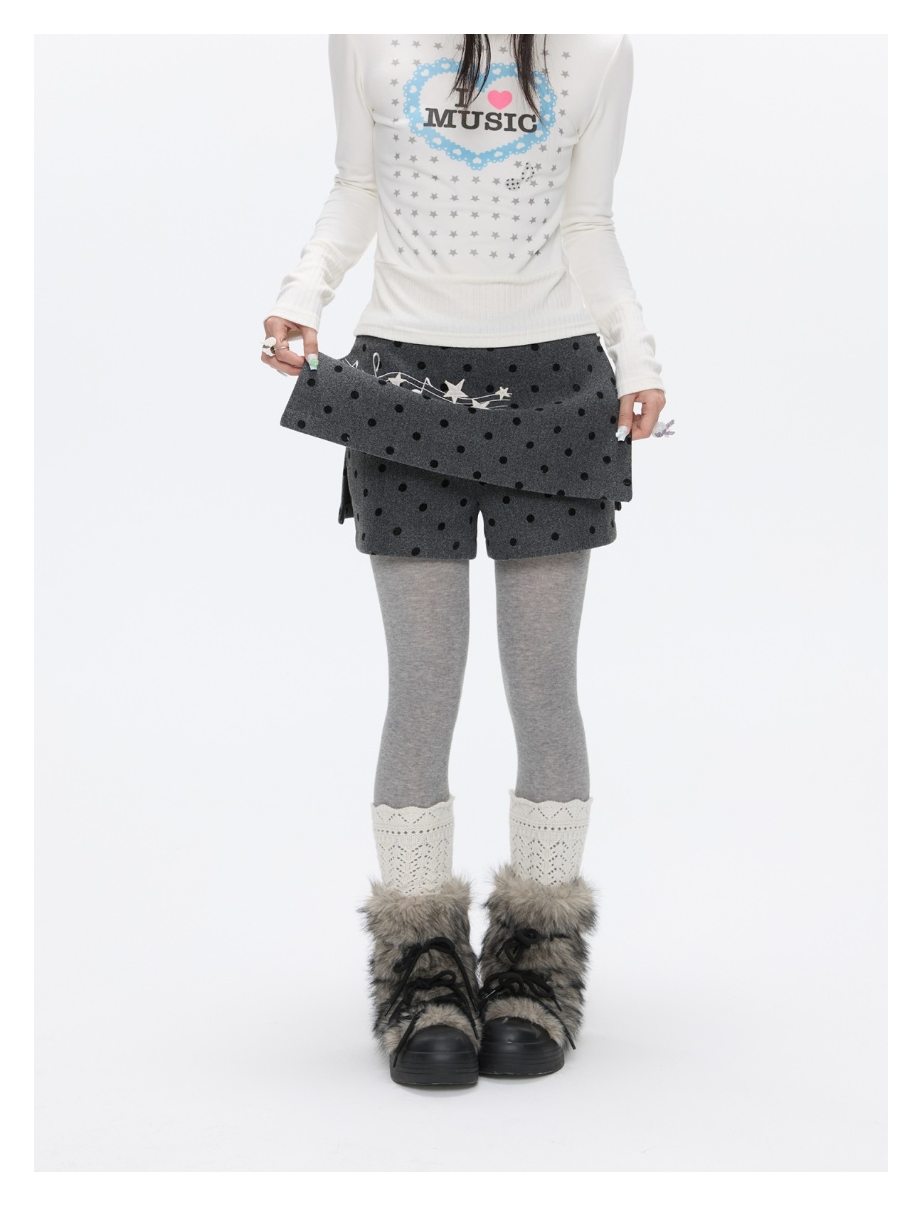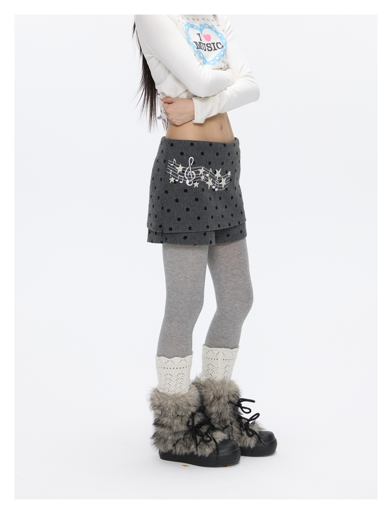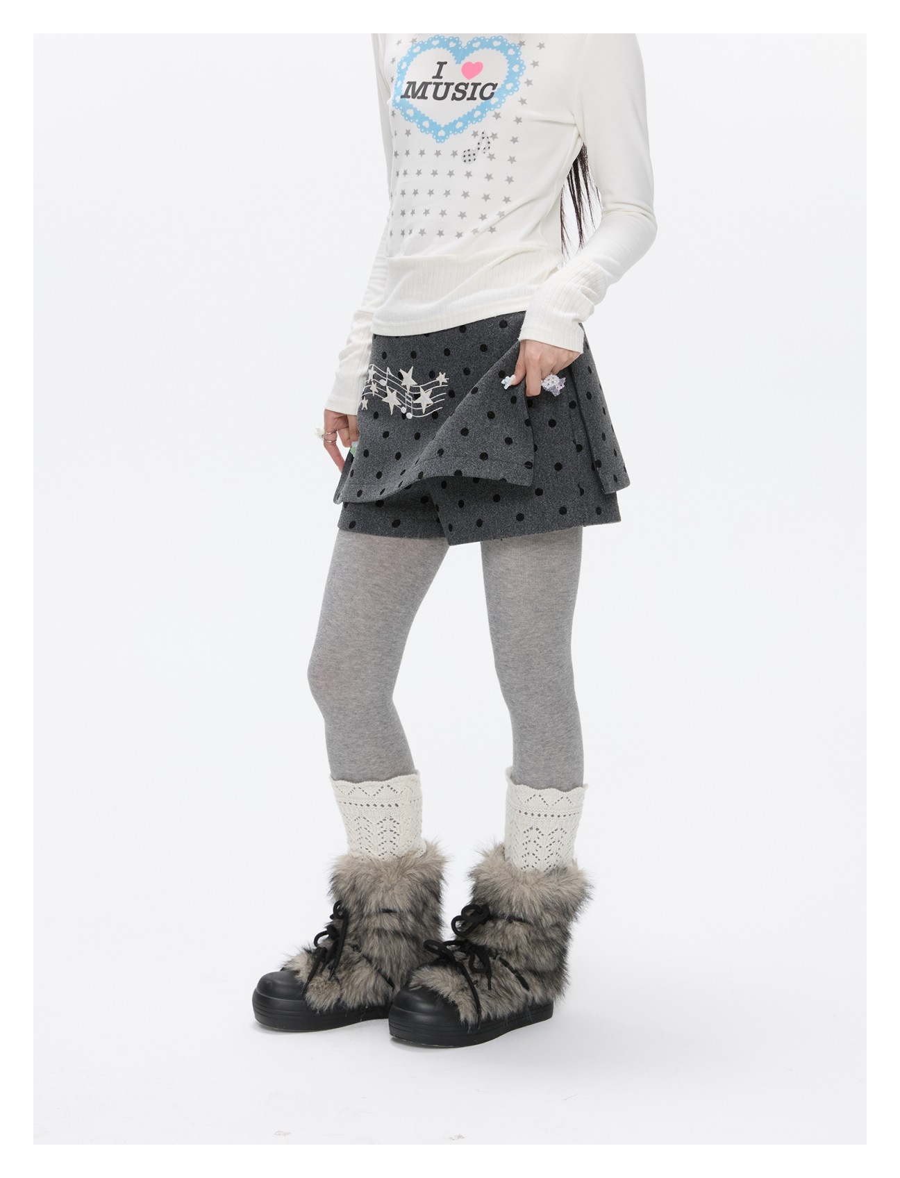 Grey wool skort with music-note polka-dot design Lookbook