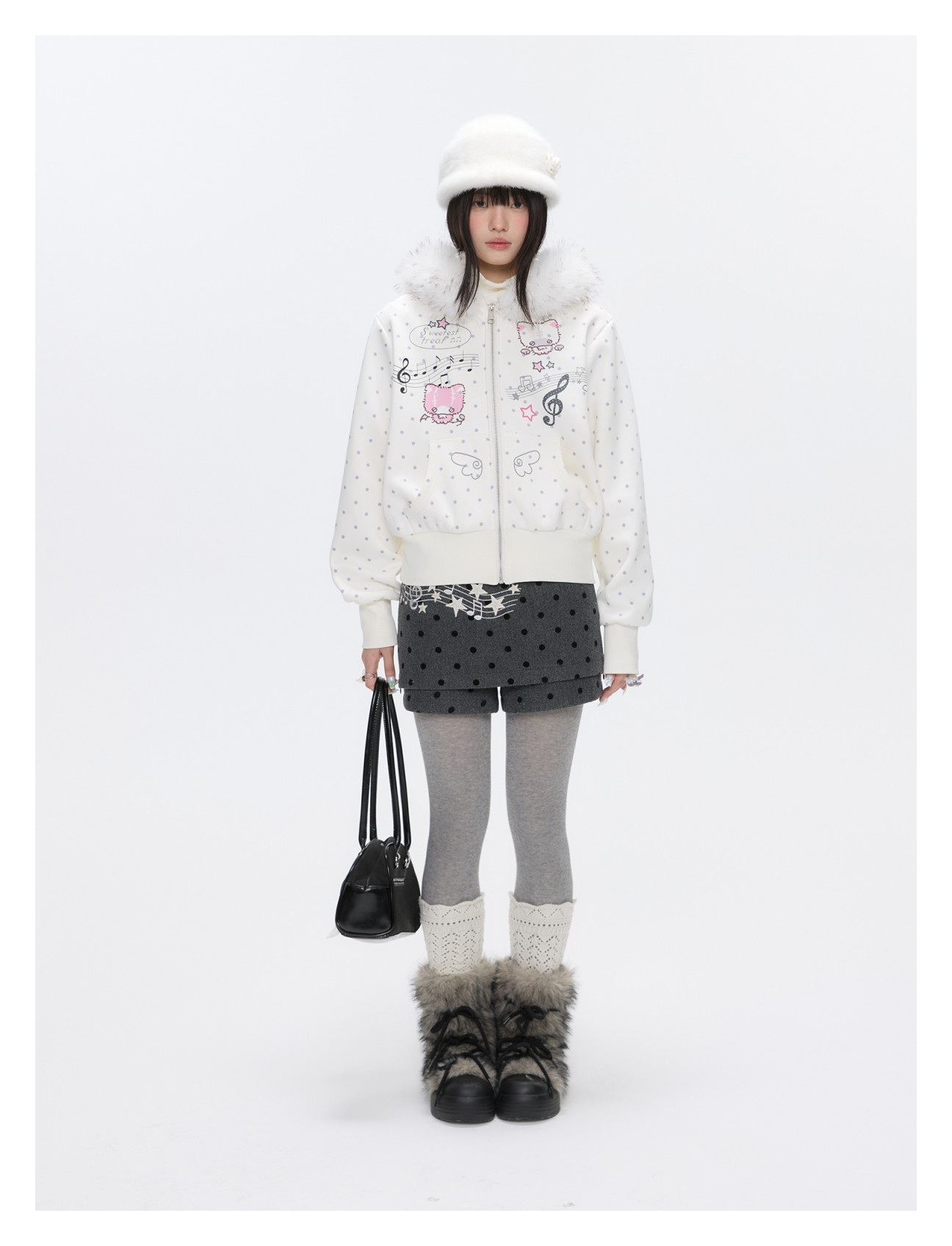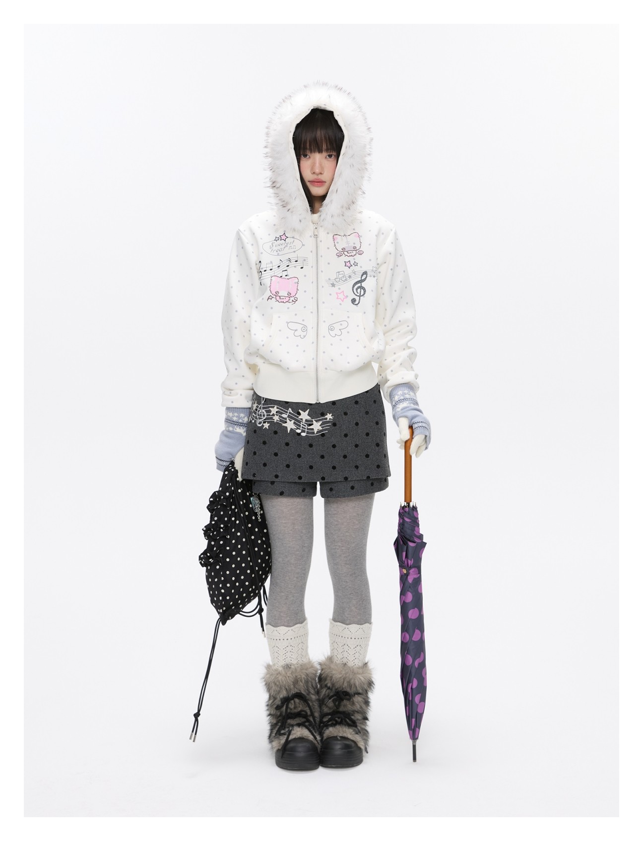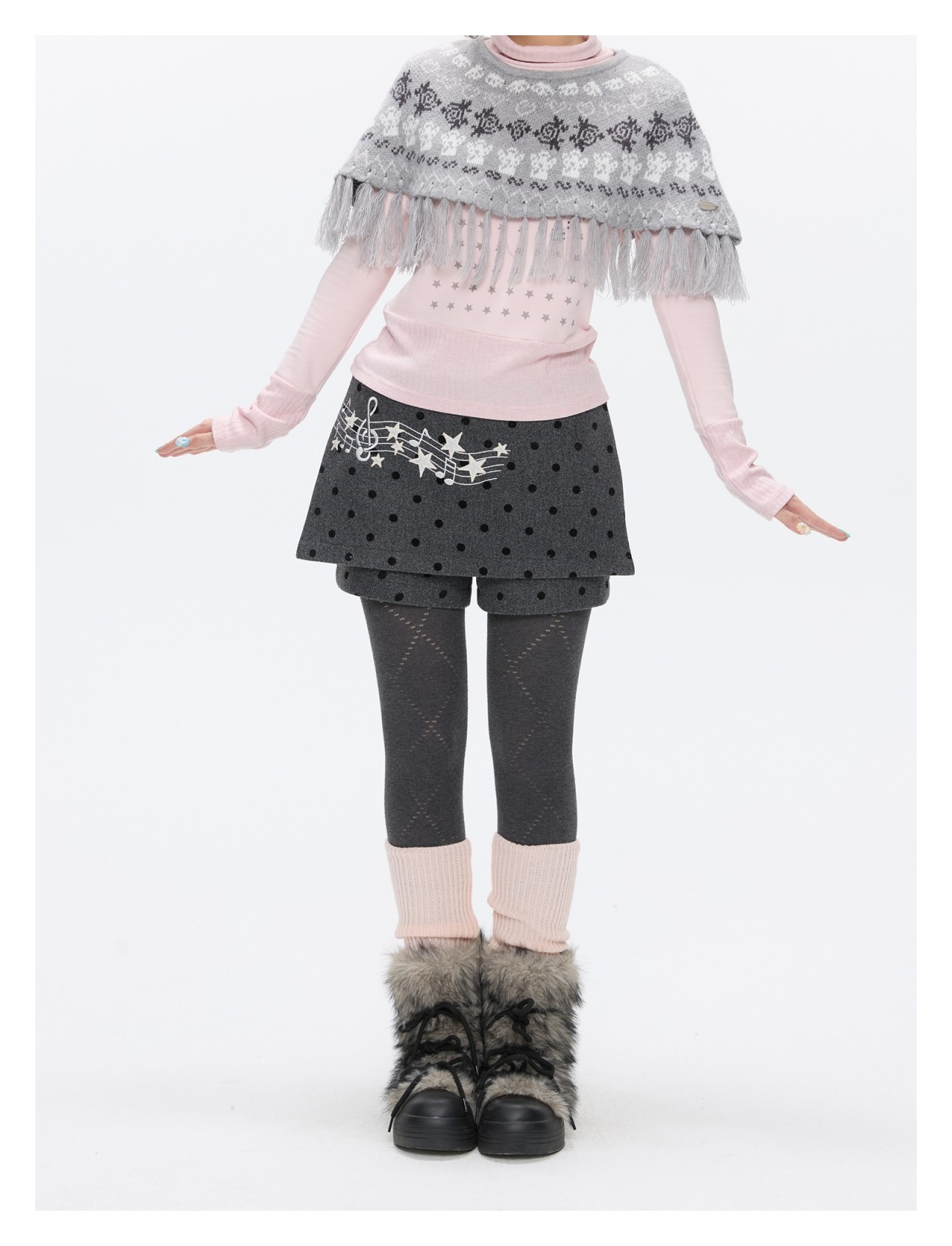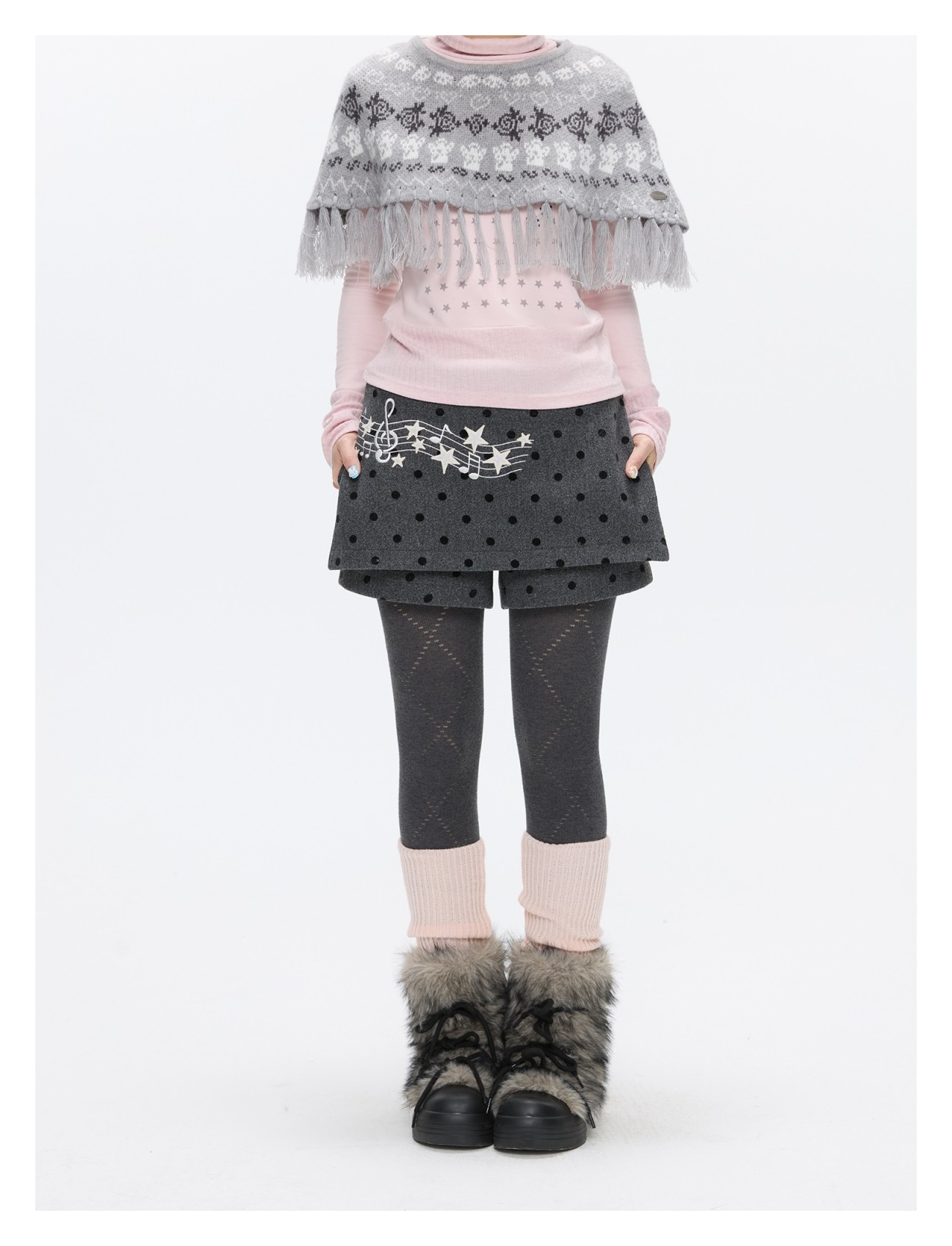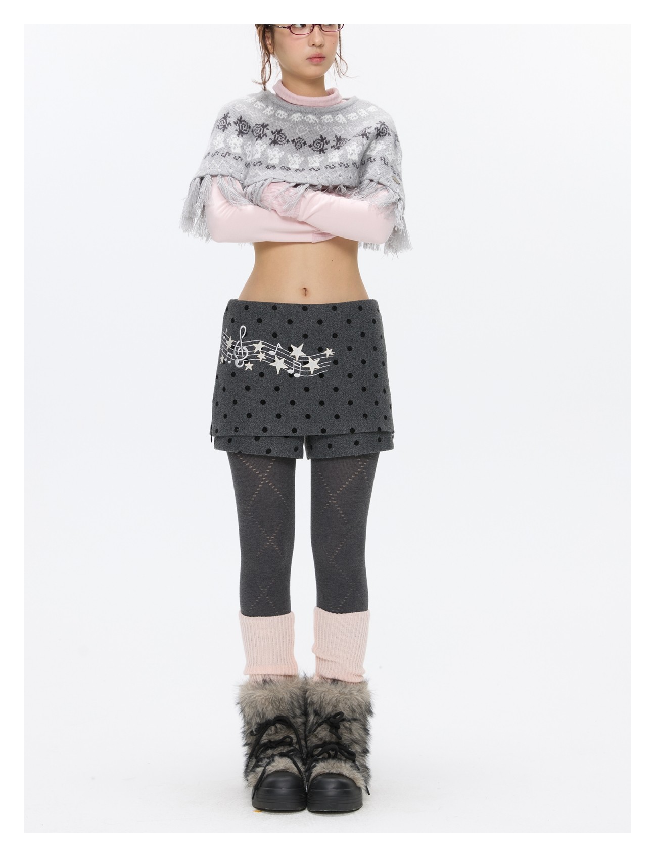 Grey wool skort with music-note polka-dot design Lookbook