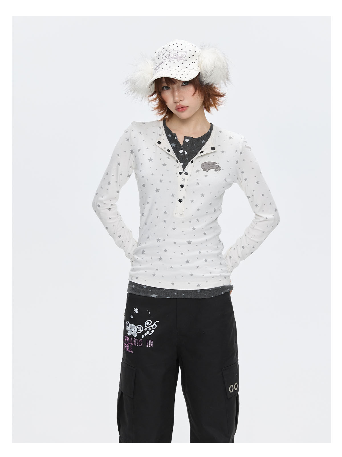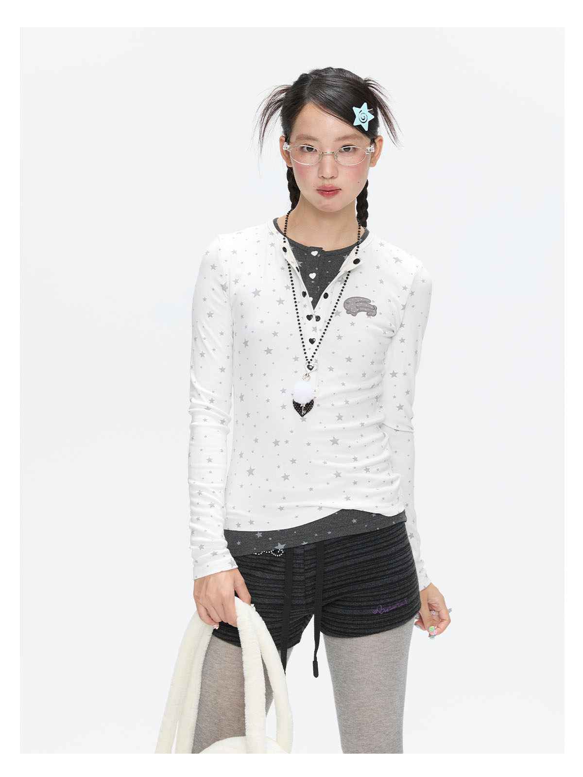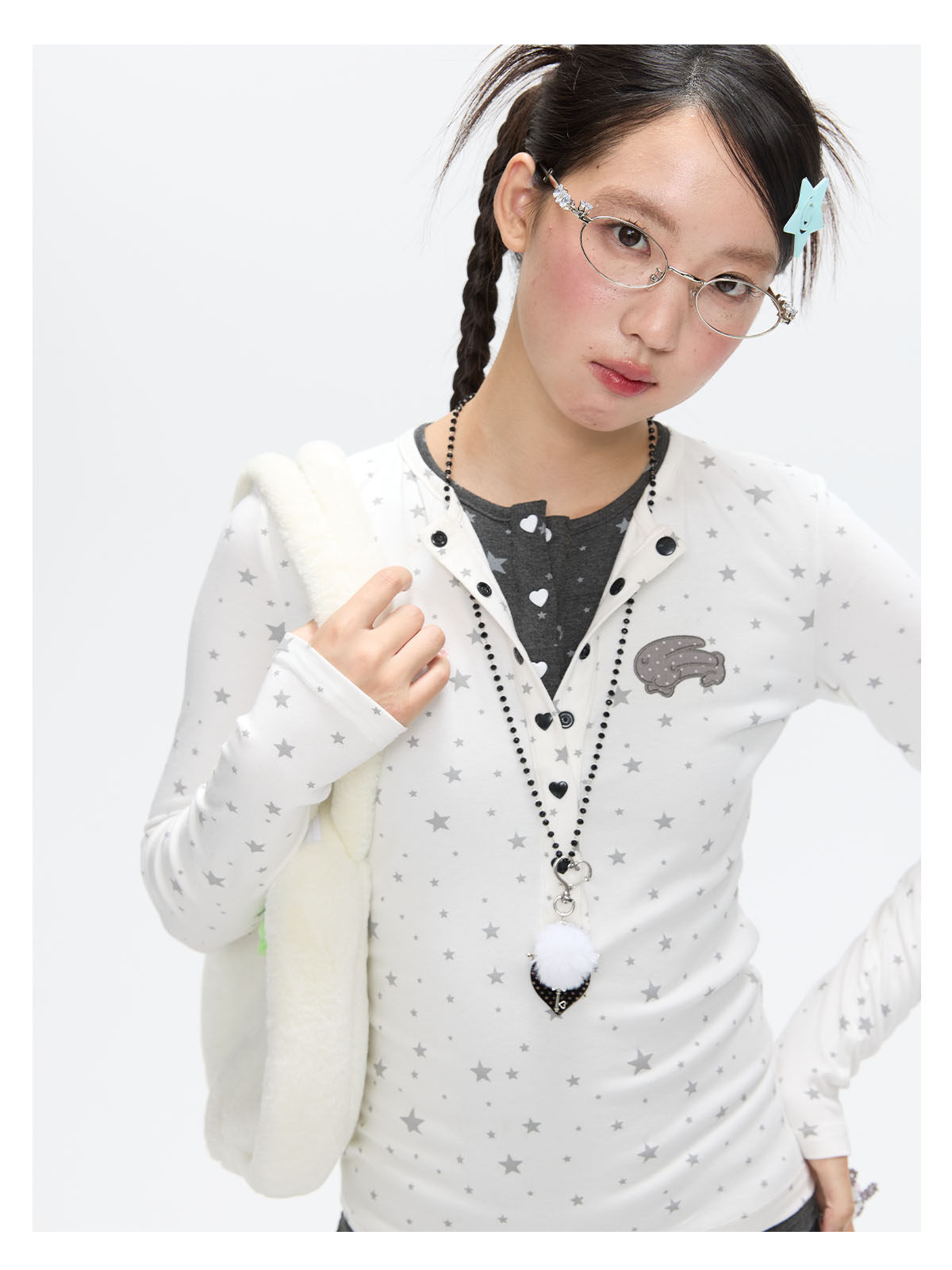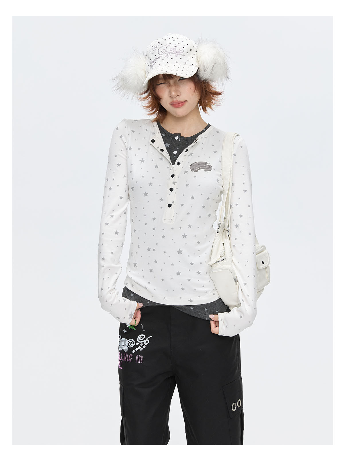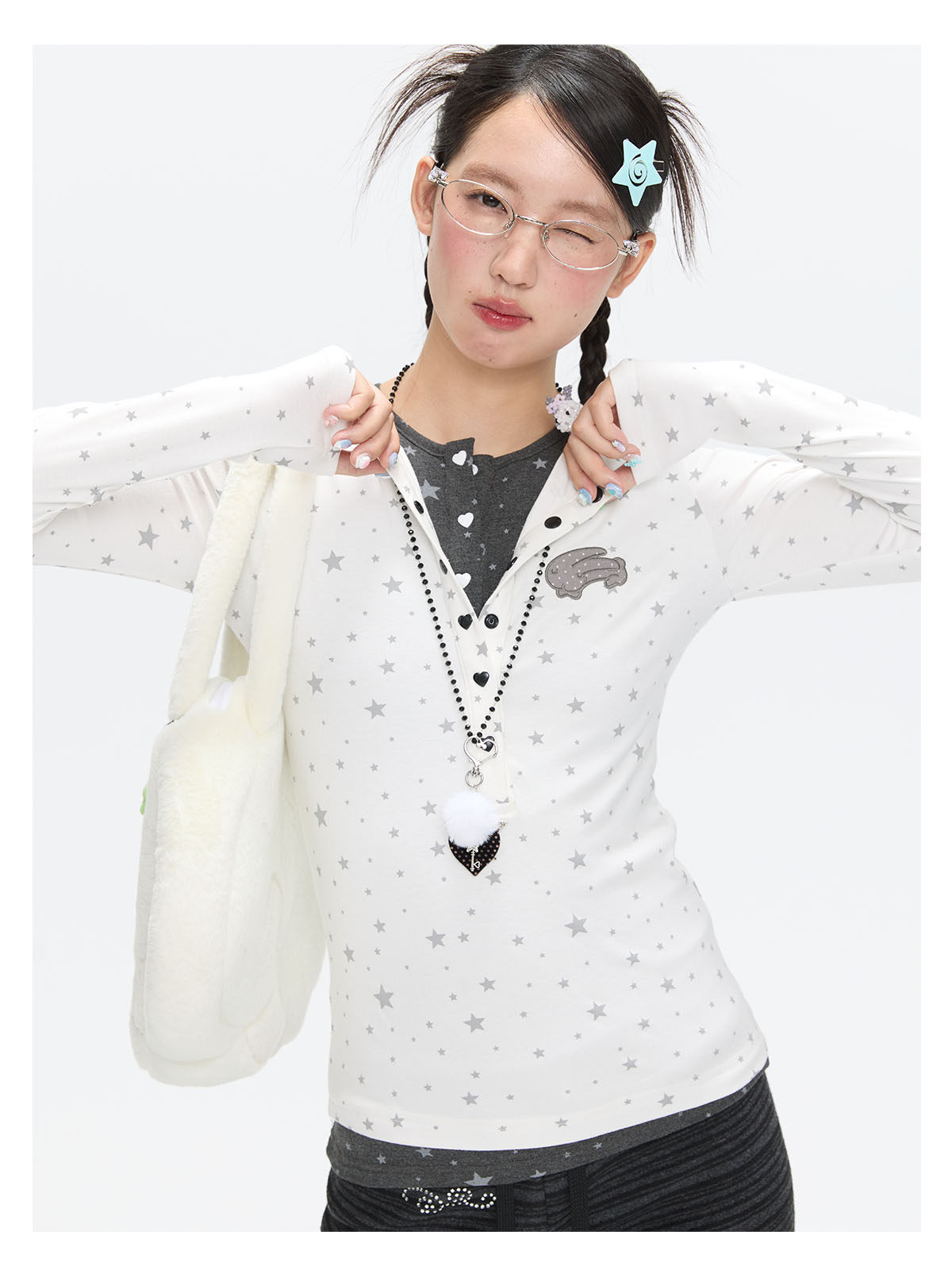 Layered Henley top with grey & white star polka-dot design Lookbook