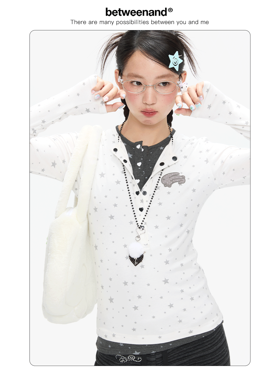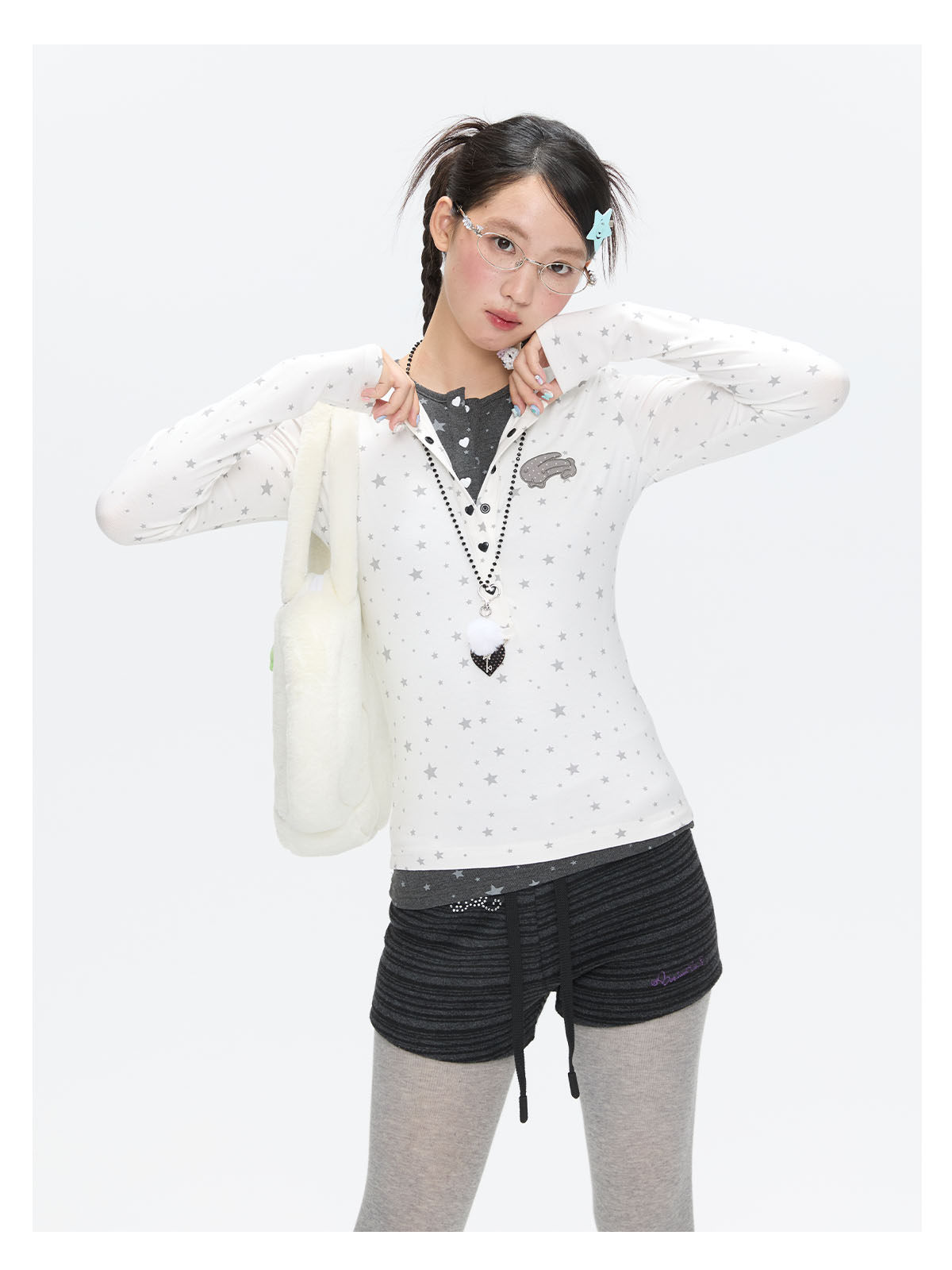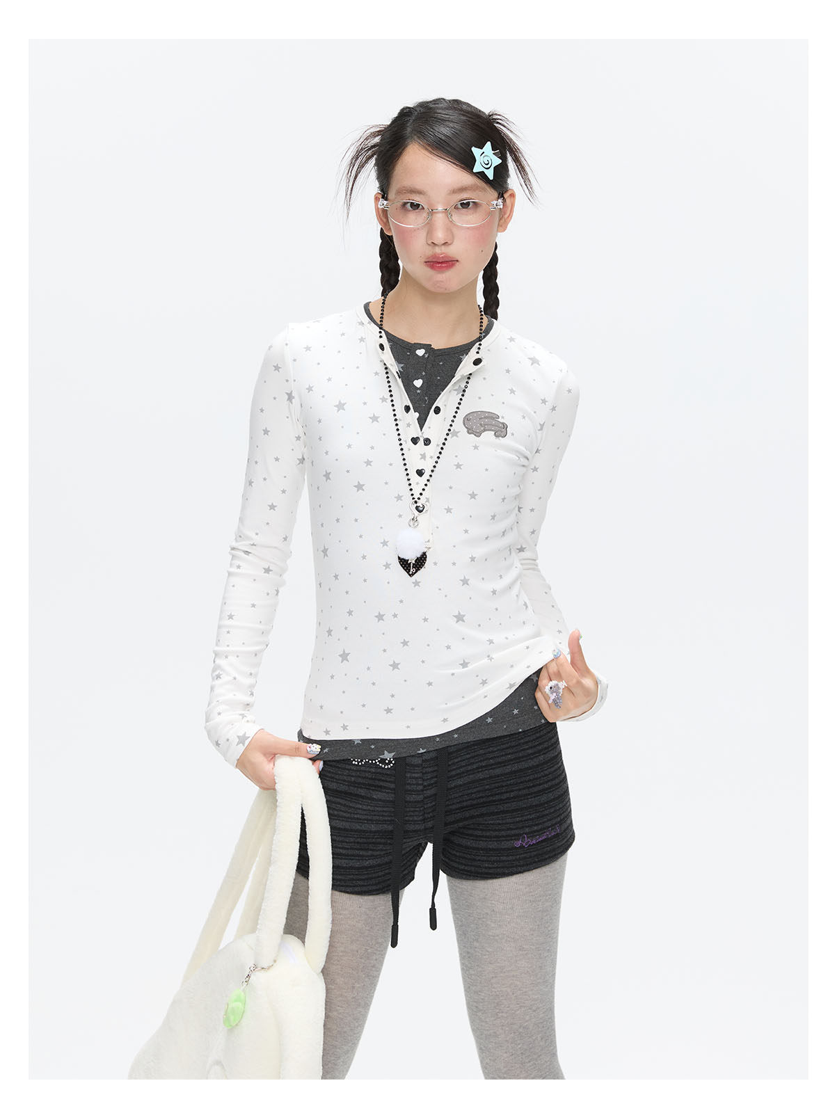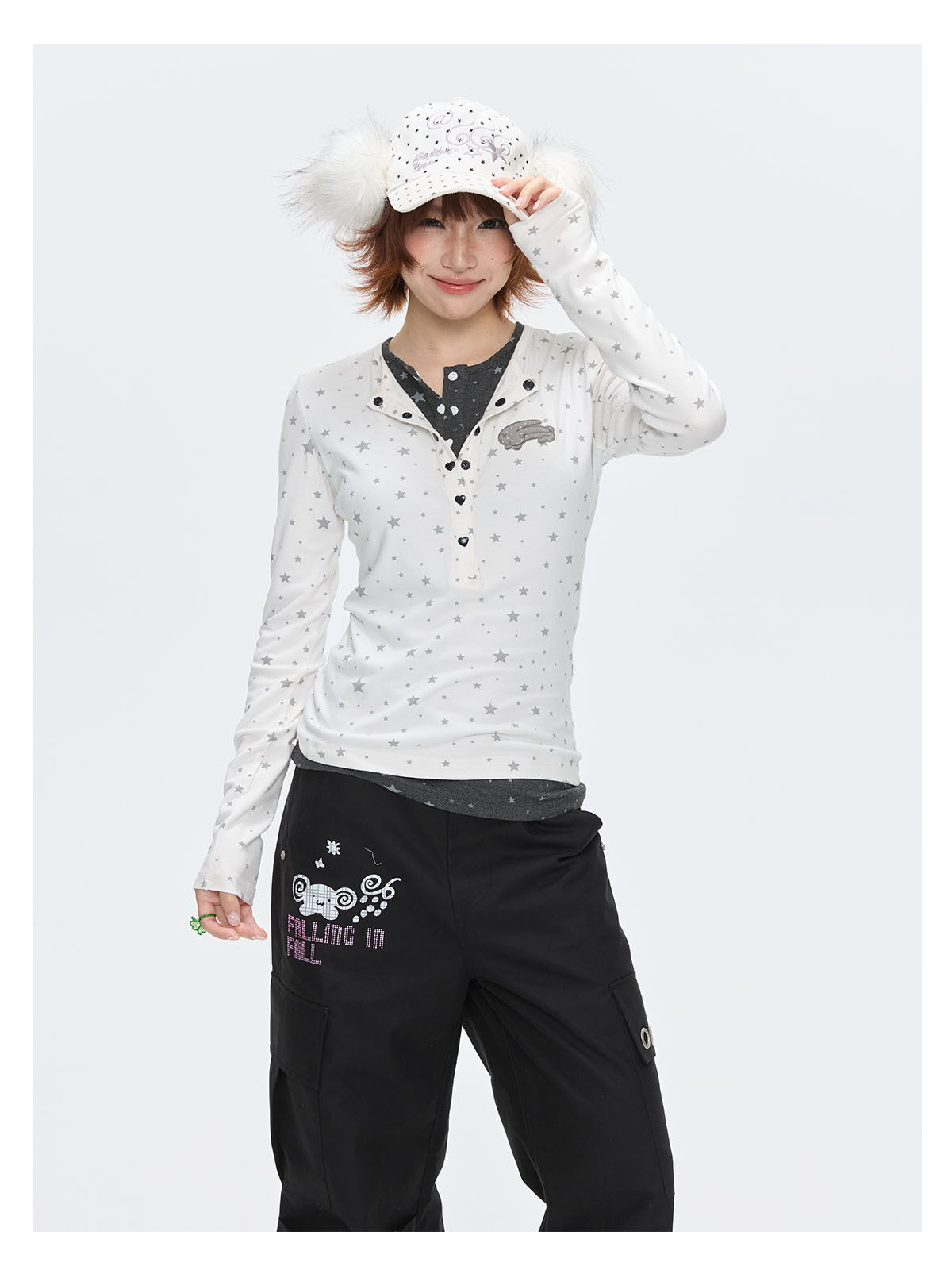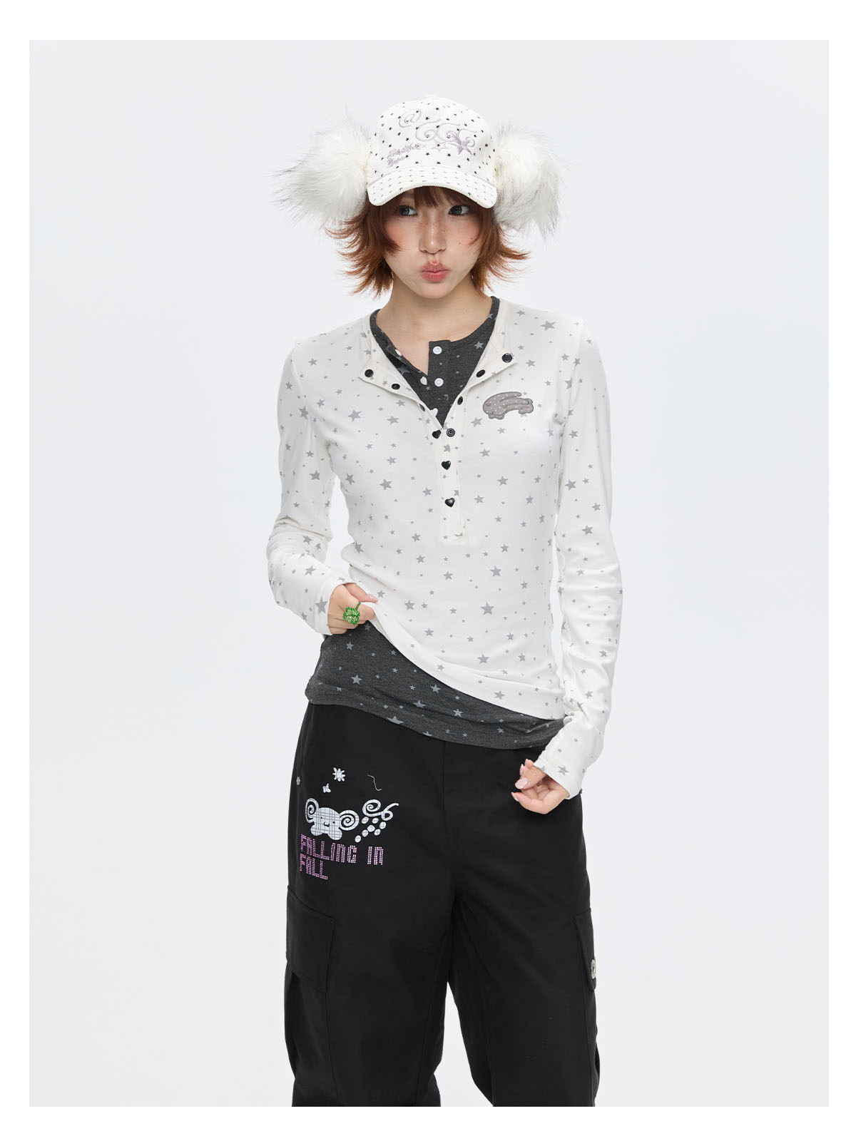 Layered Henley top with grey & white star polka-dot design Lookbook