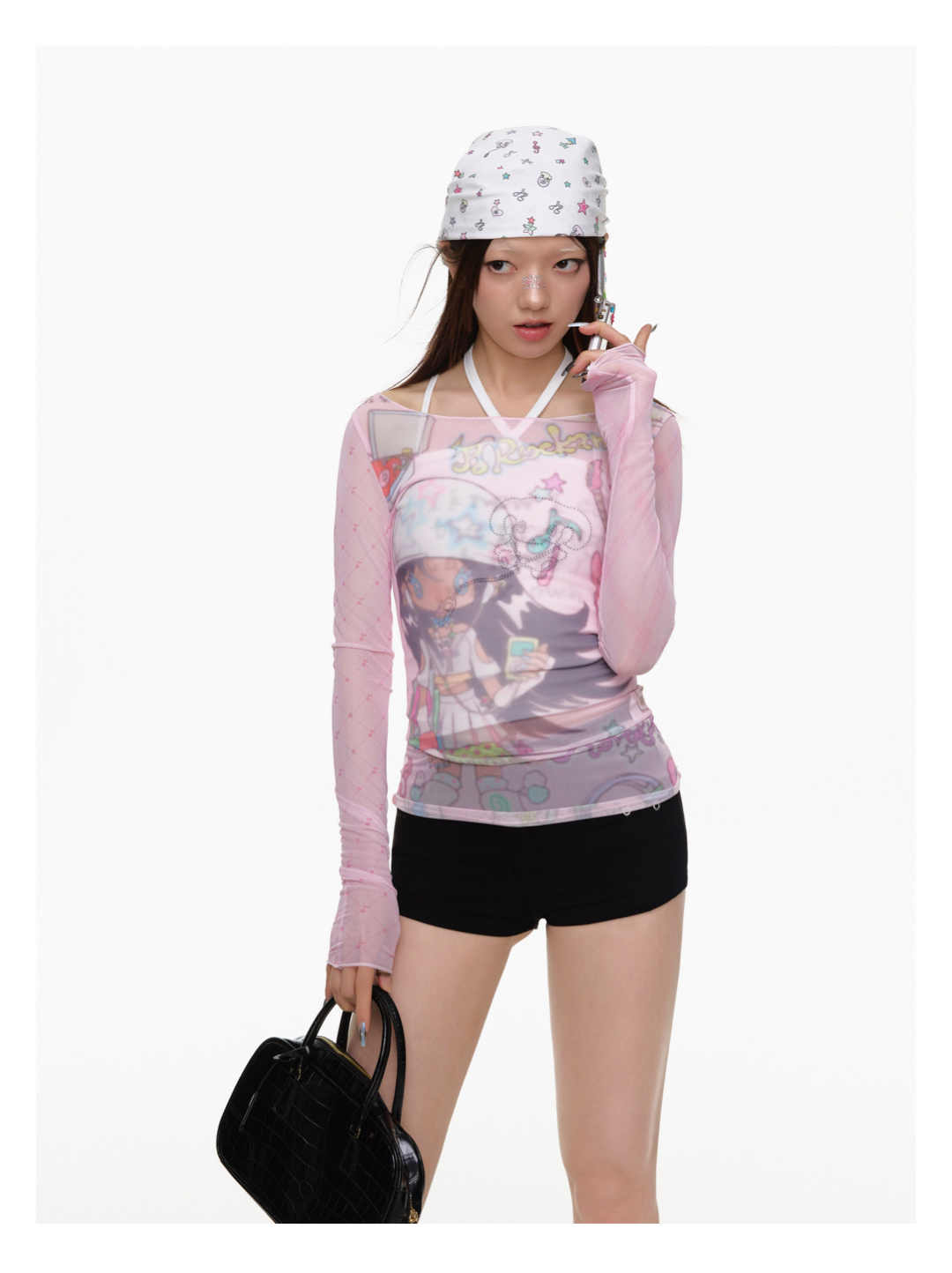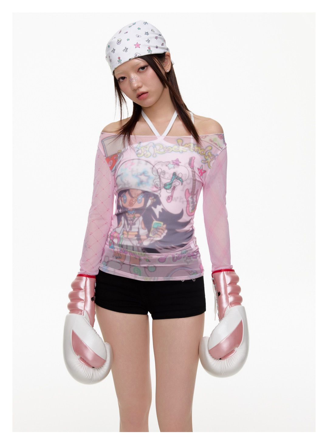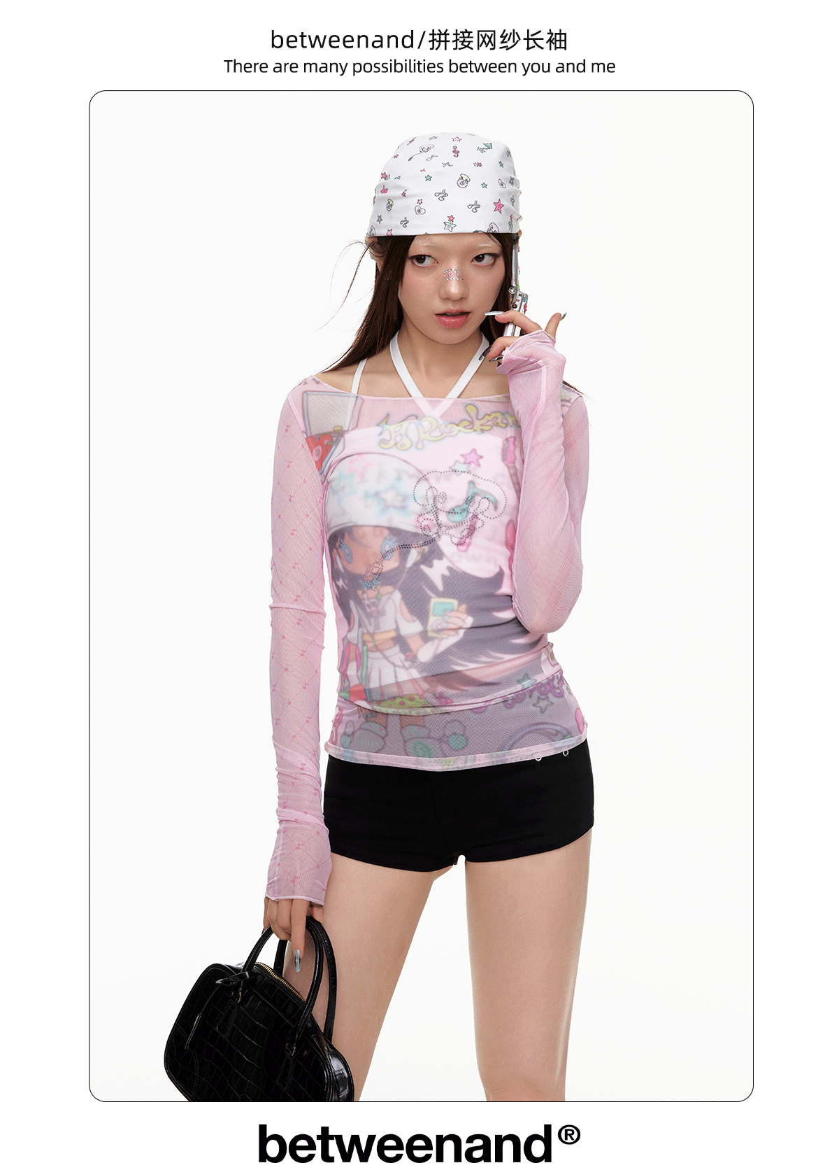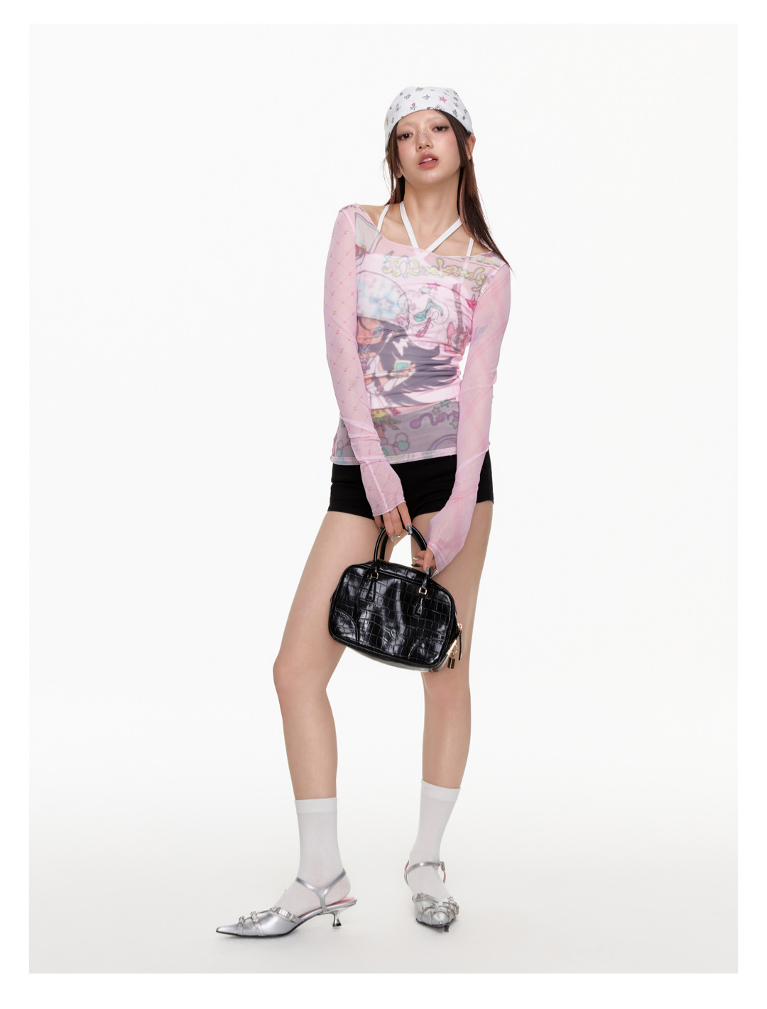 Pink mesh patchwork off shoulder top with Y2K design Lookbook