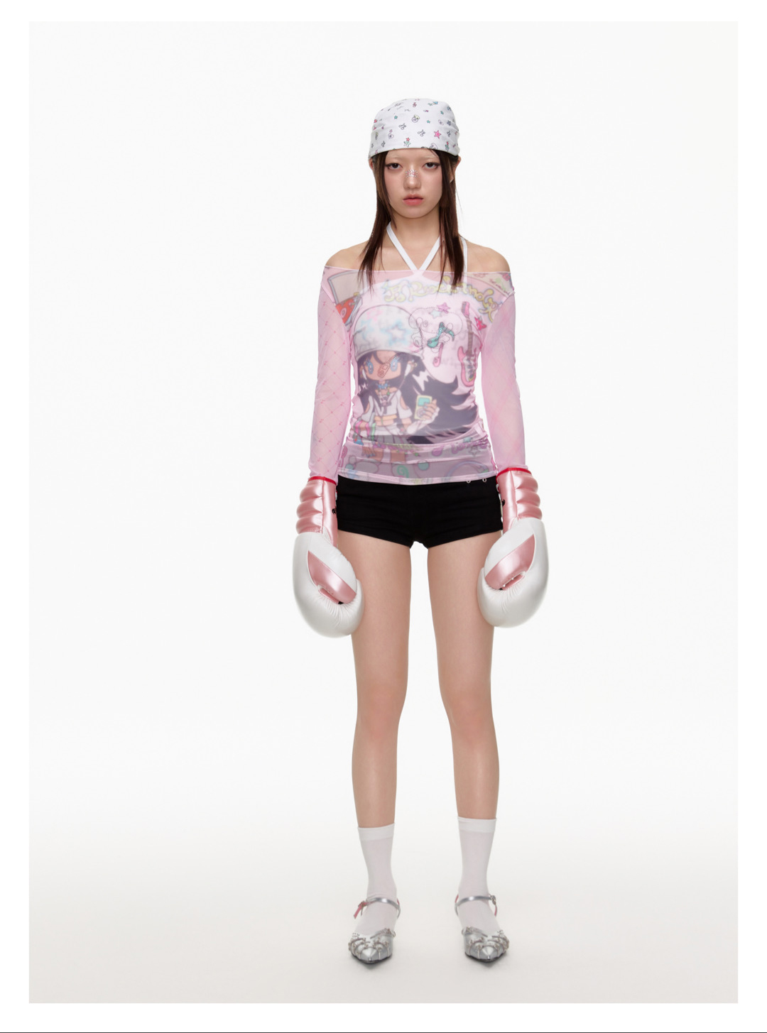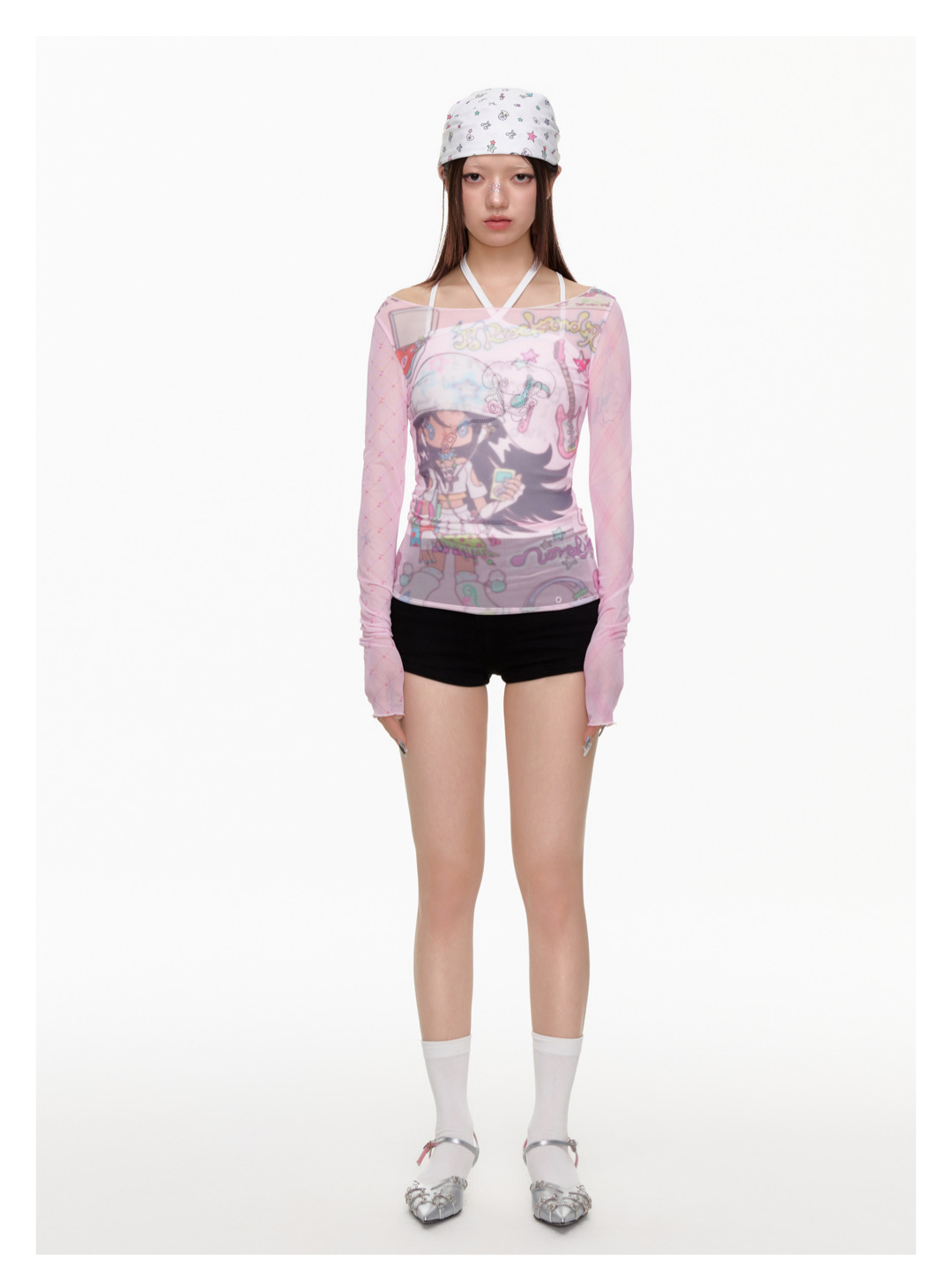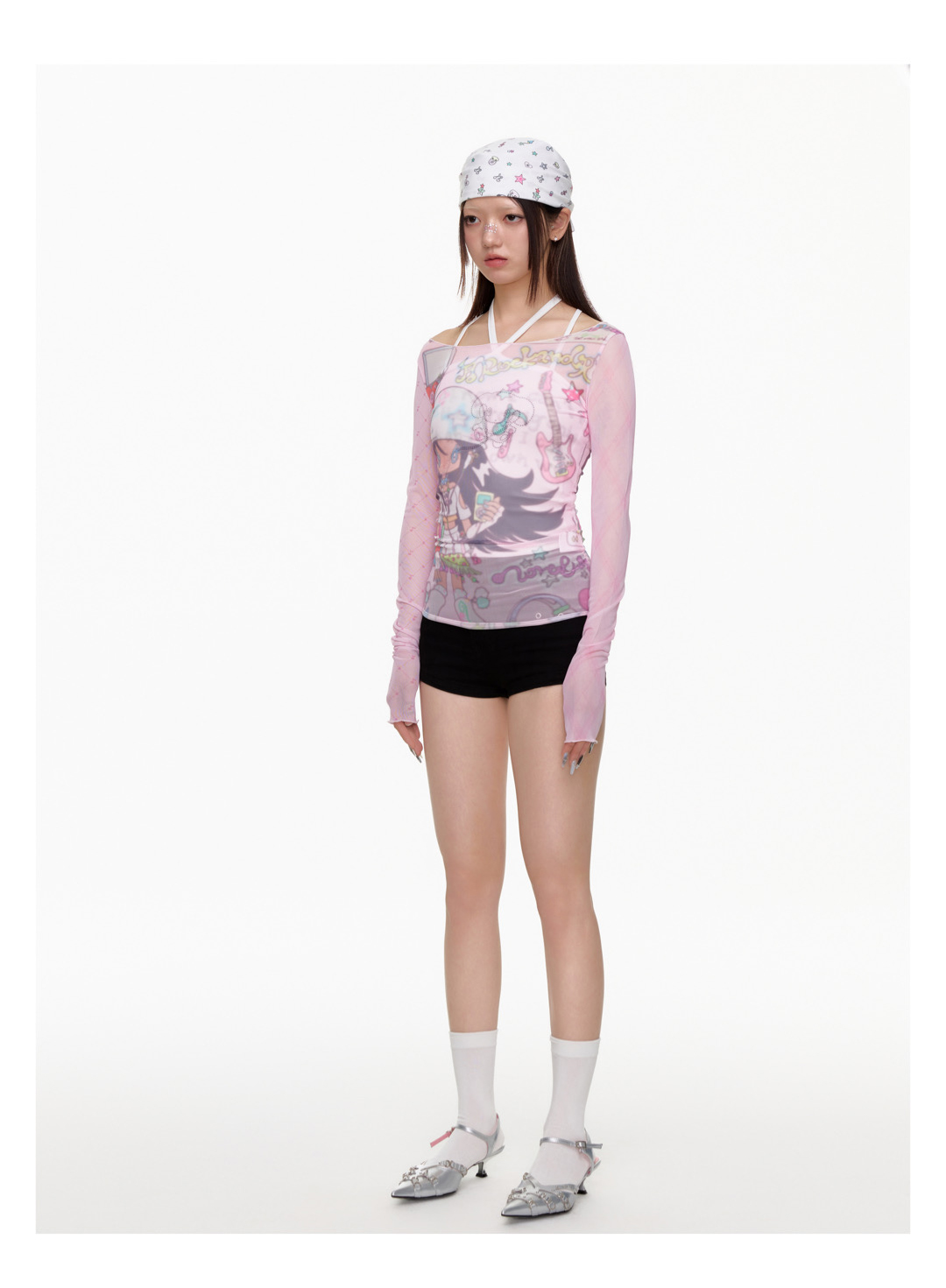 Pink mesh patchwork off shoulder top with Y2K design Lookbook