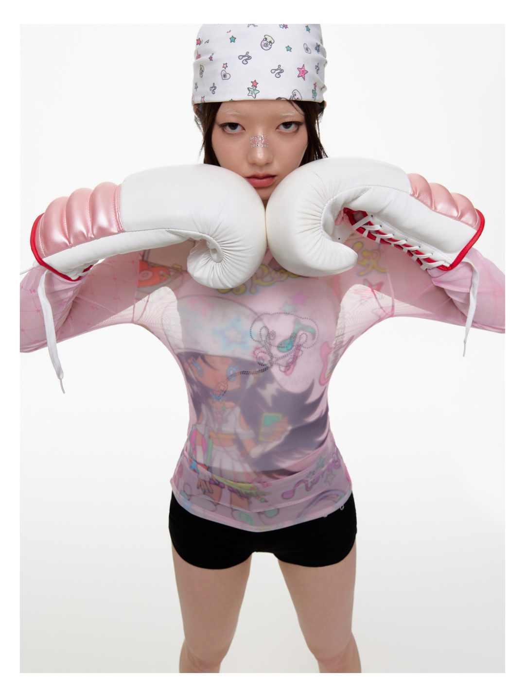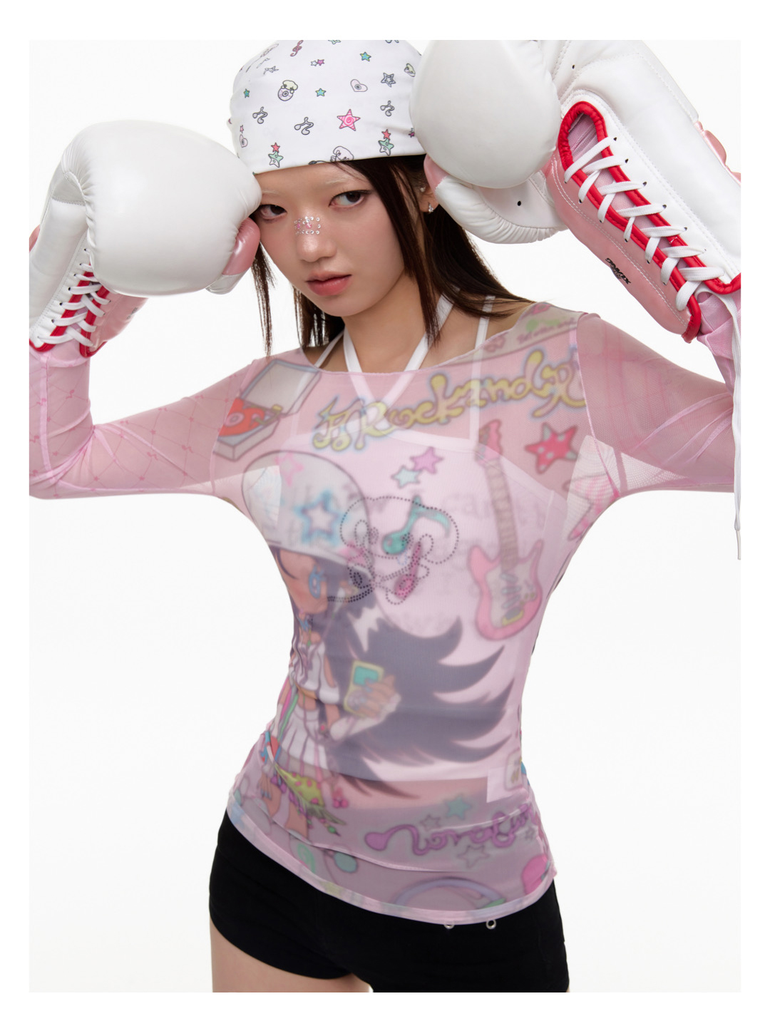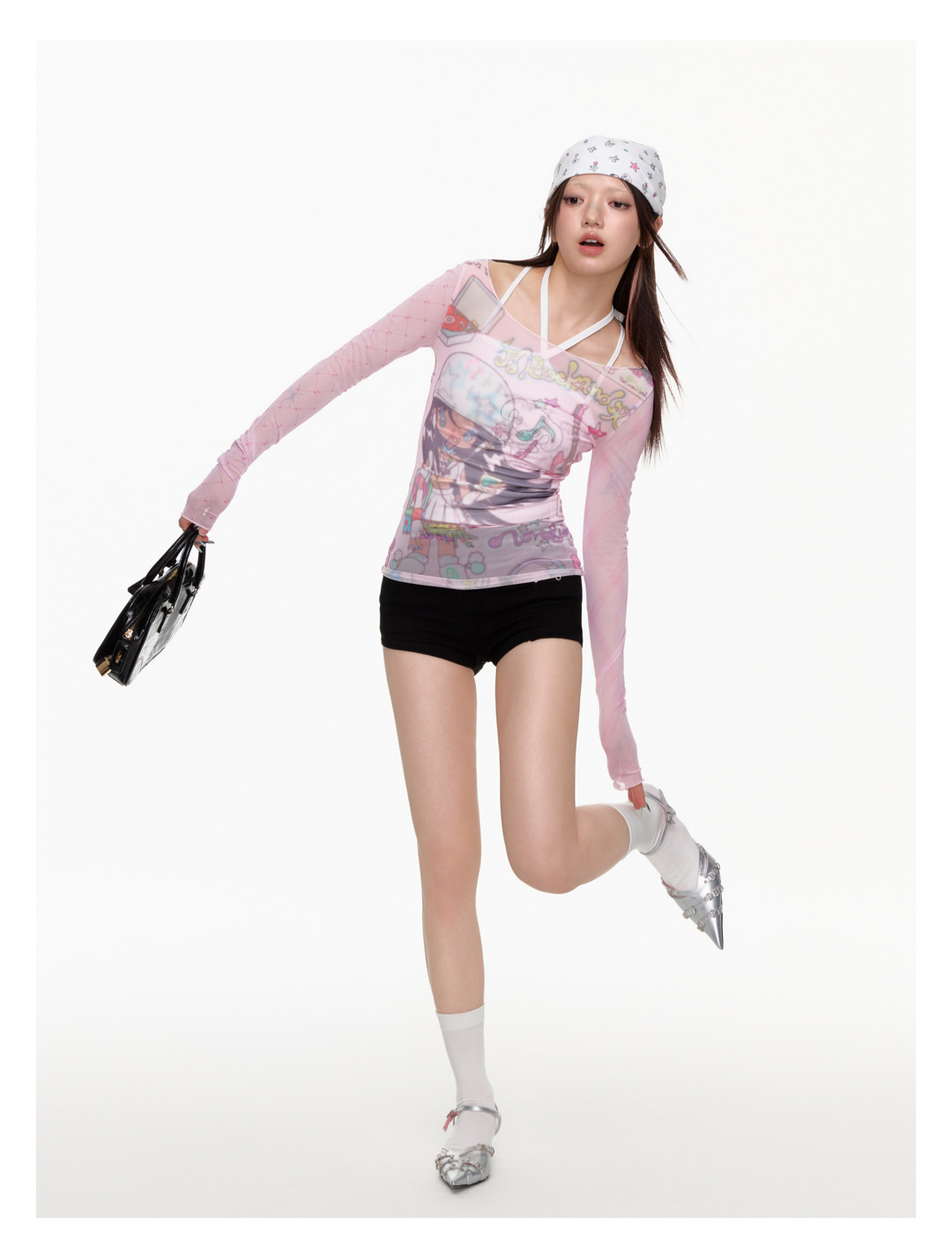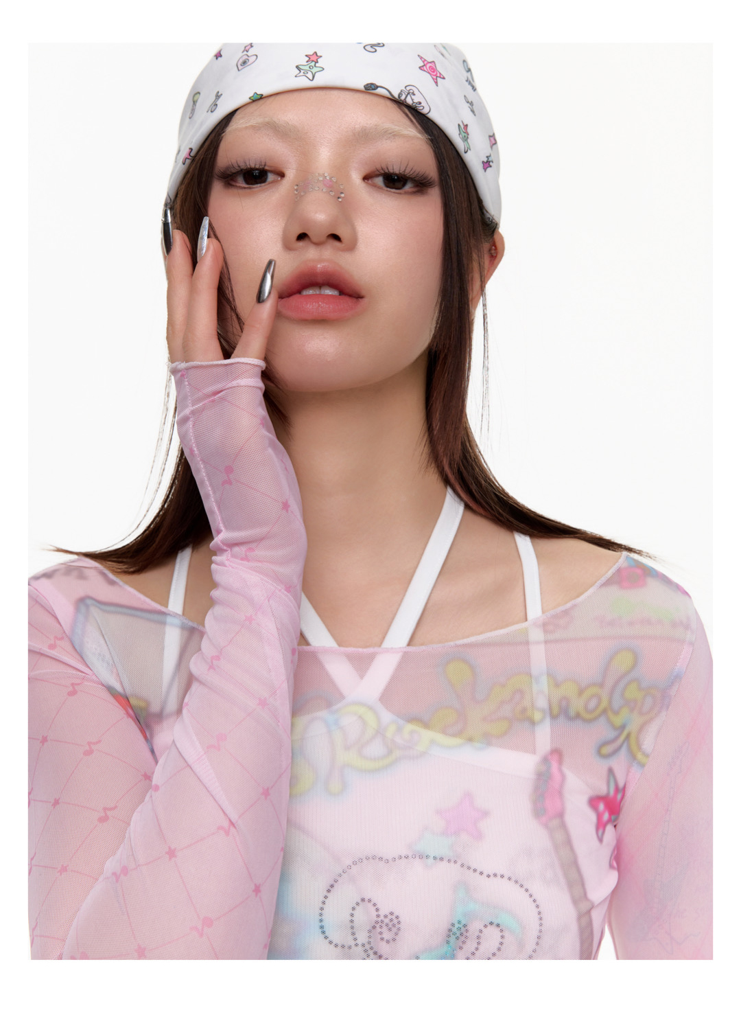 Pink mesh patchwork off shoulder top with Y2K design Lookbook
