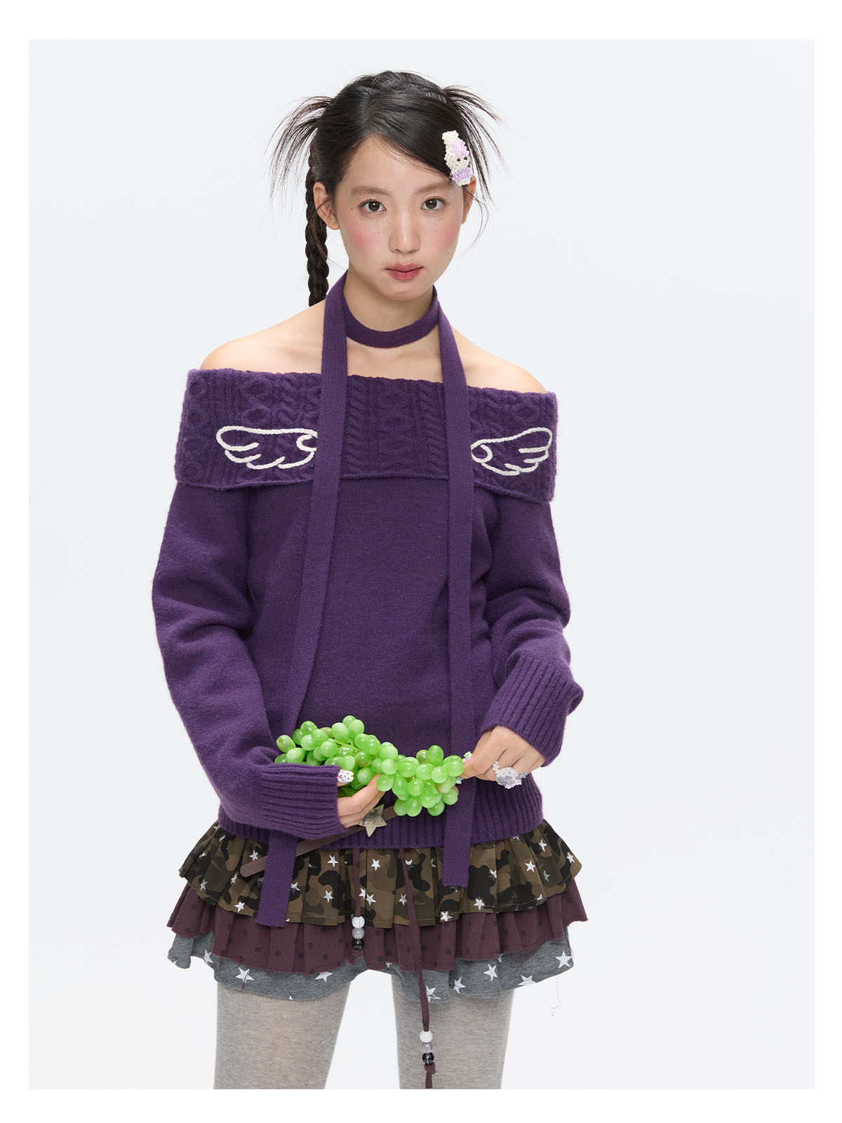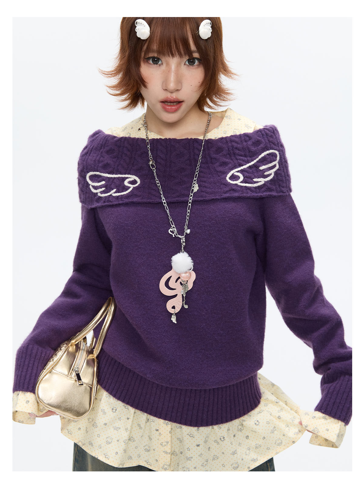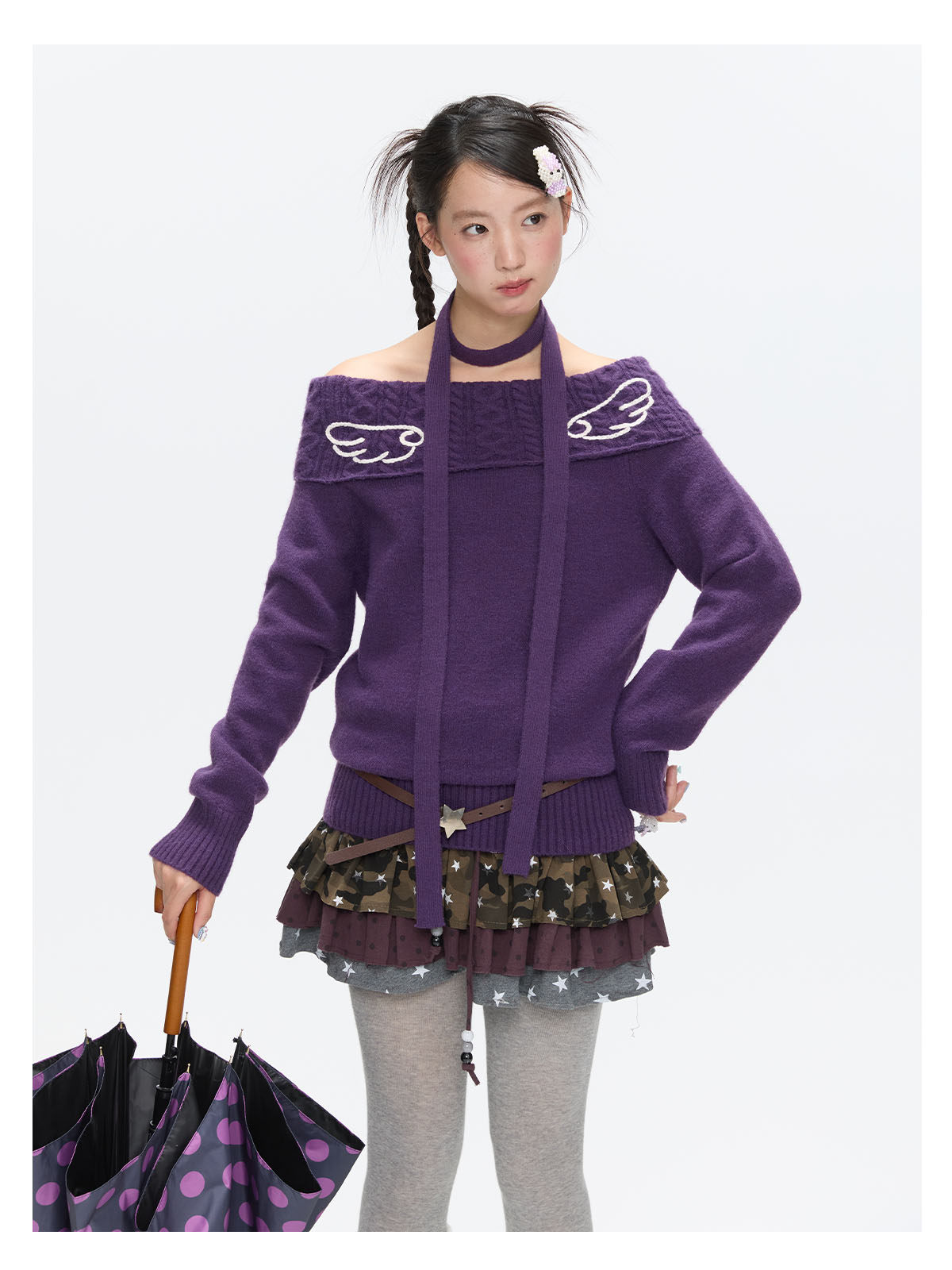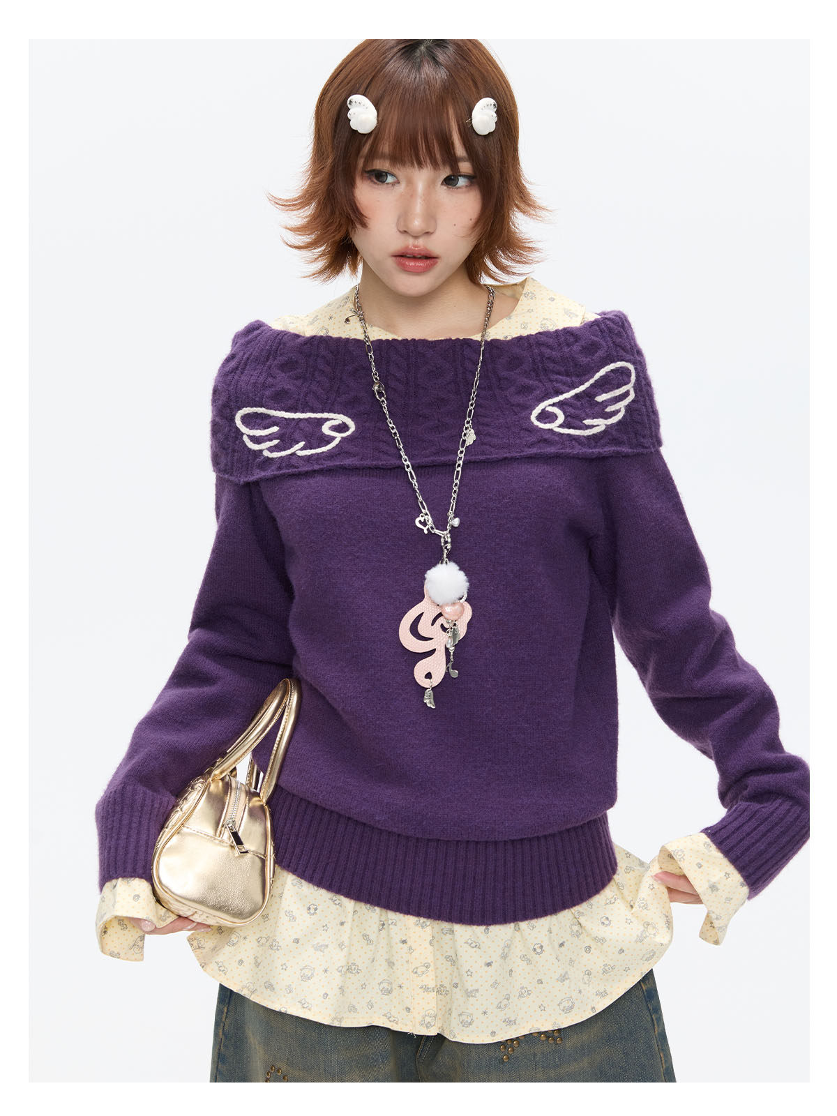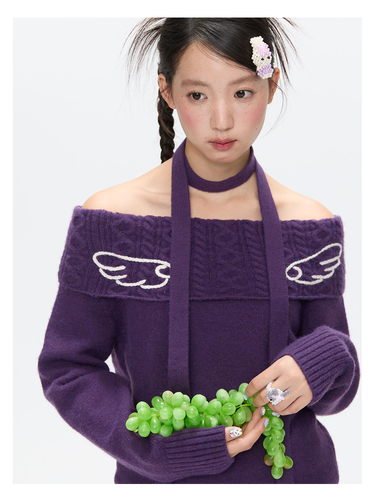 Purple off-shoulder crochet sweater with angel-wing detail Lookbook