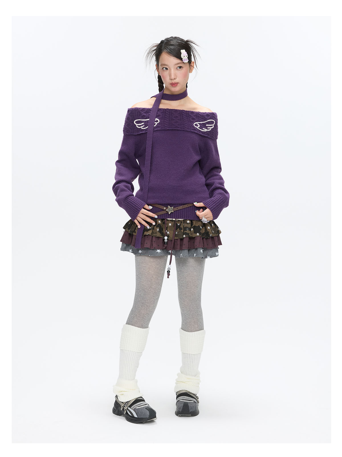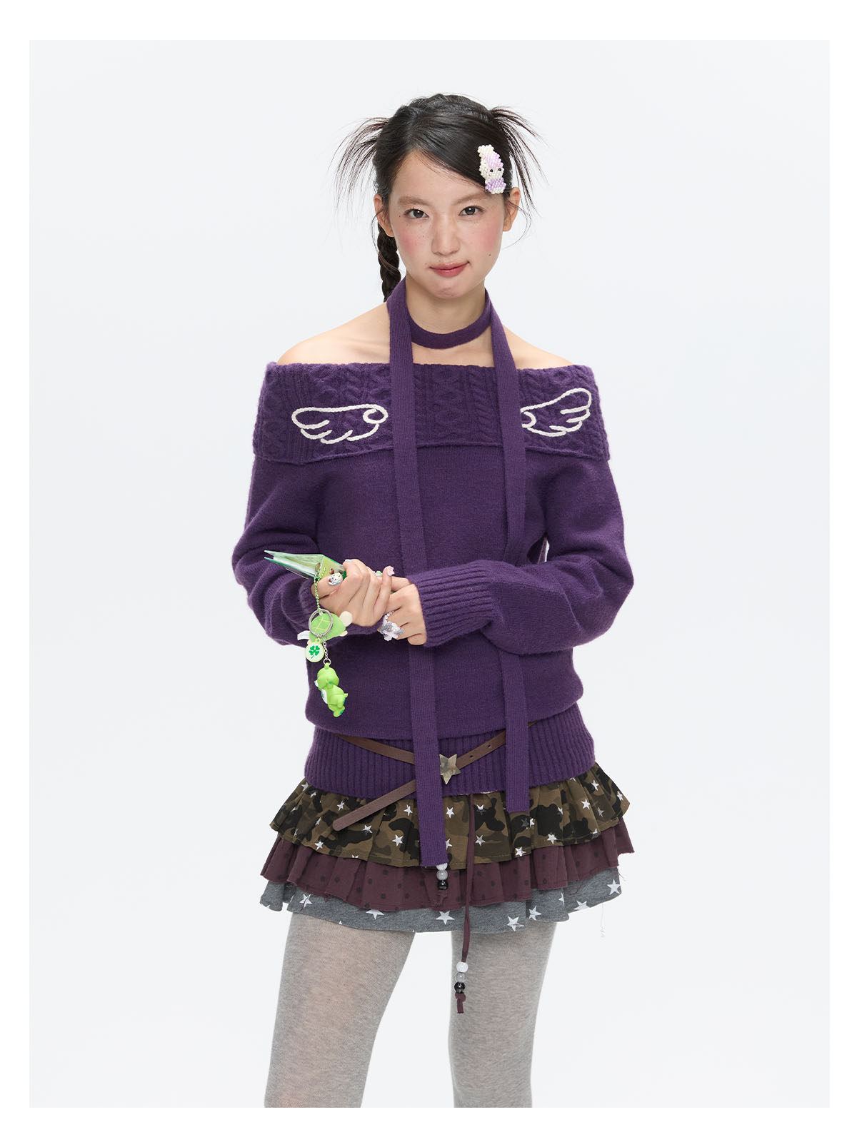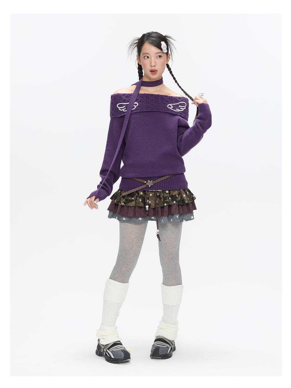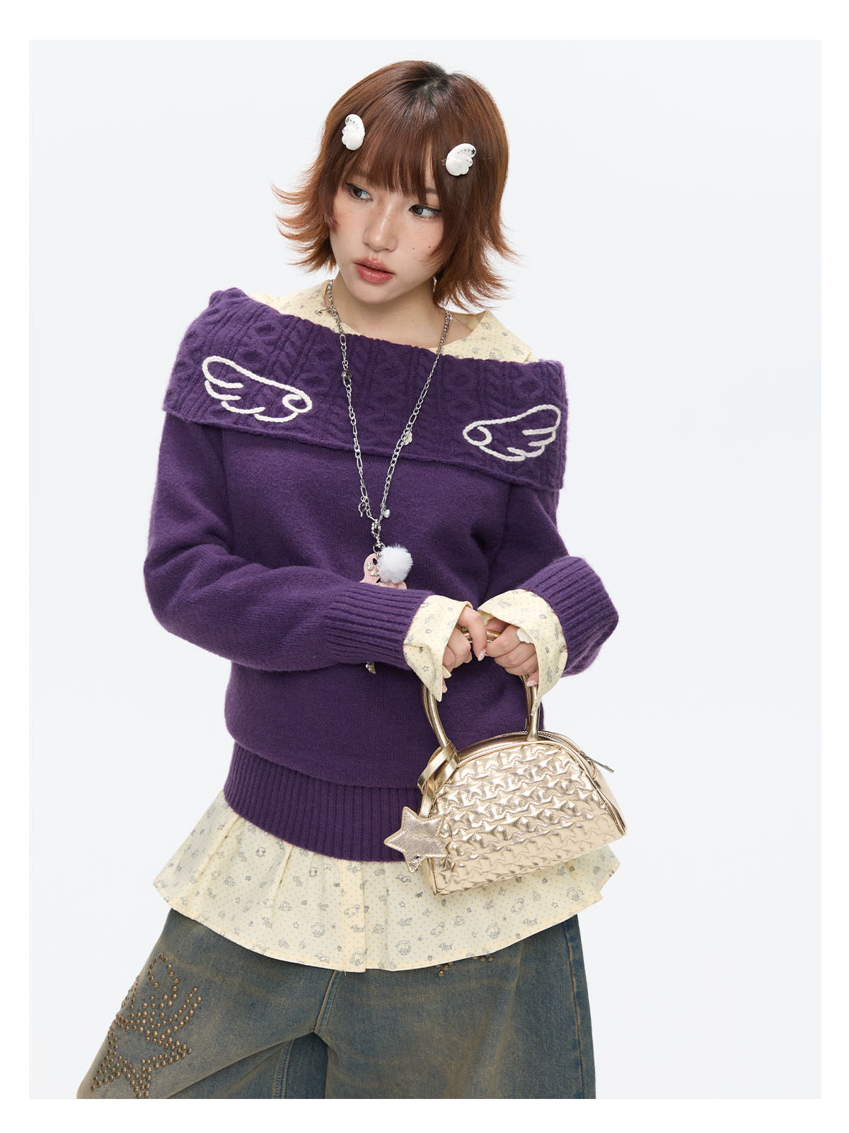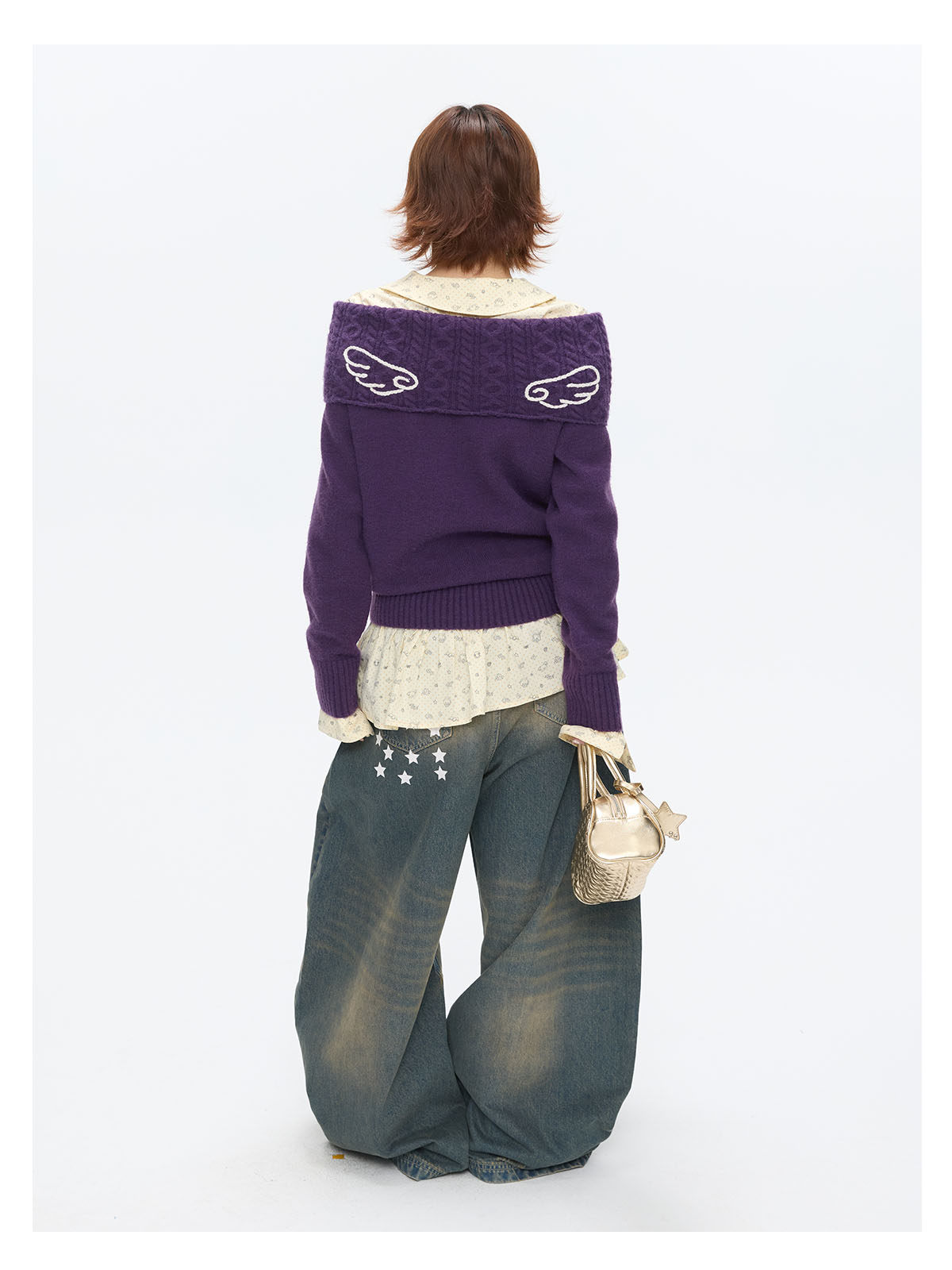 Purple off-shoulder crochet sweater with angel-wing detail Lookbook