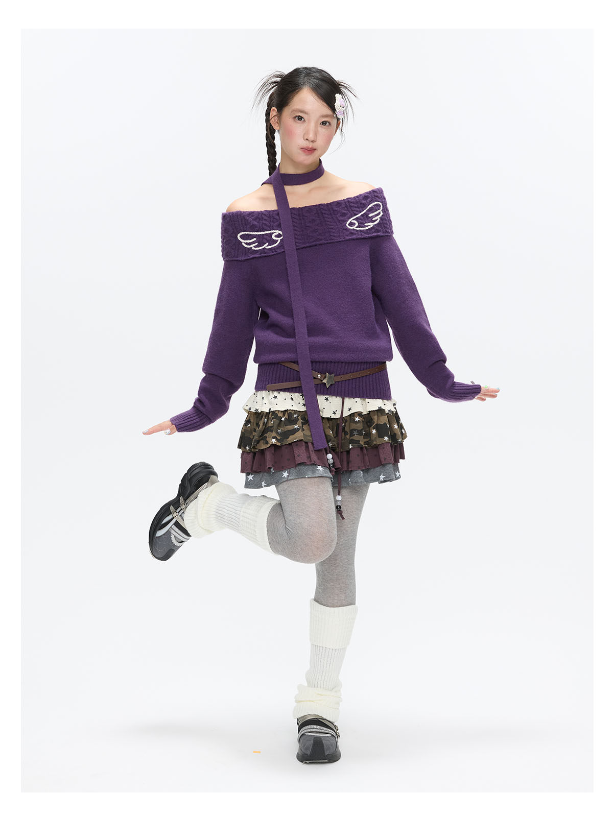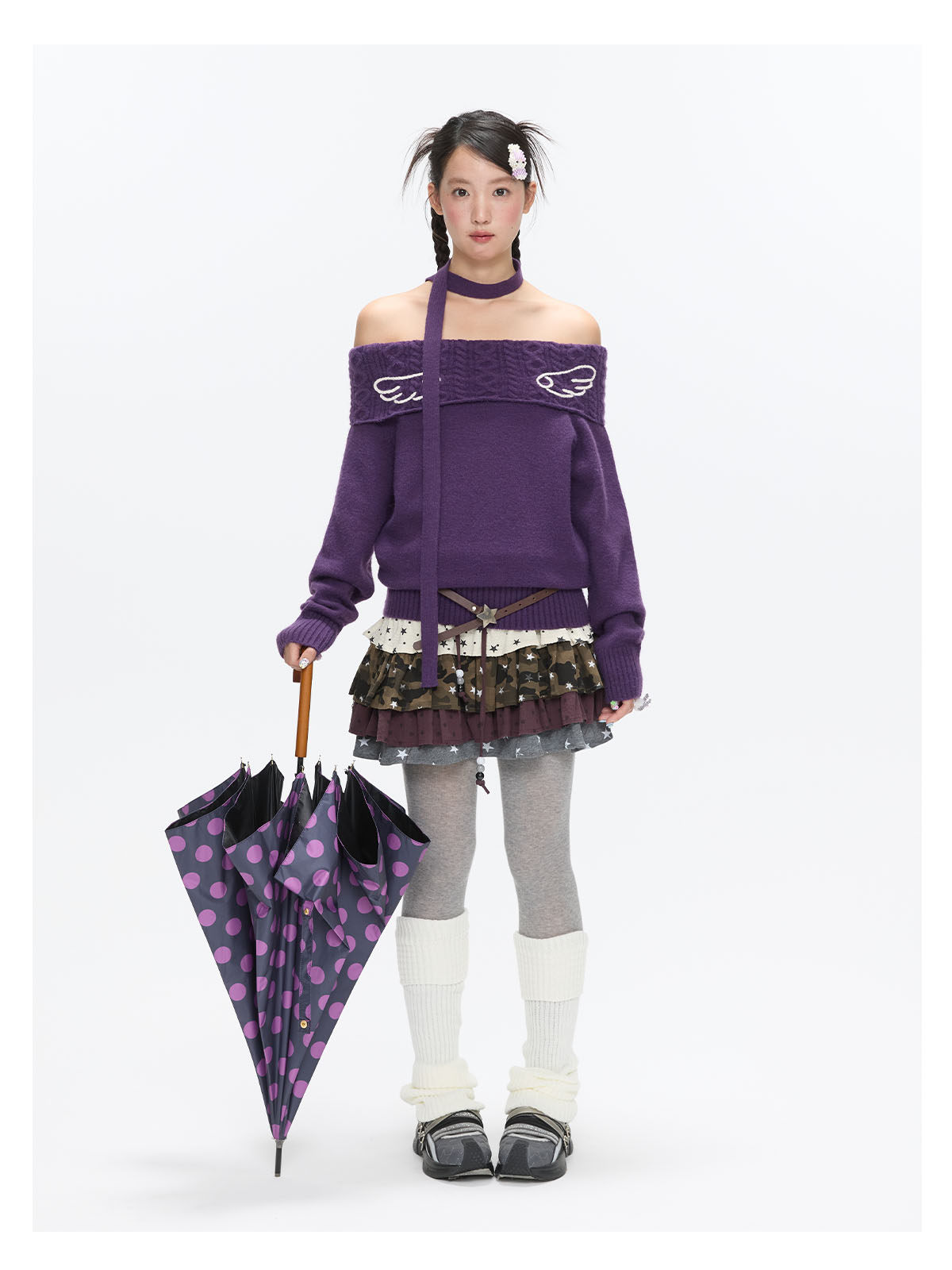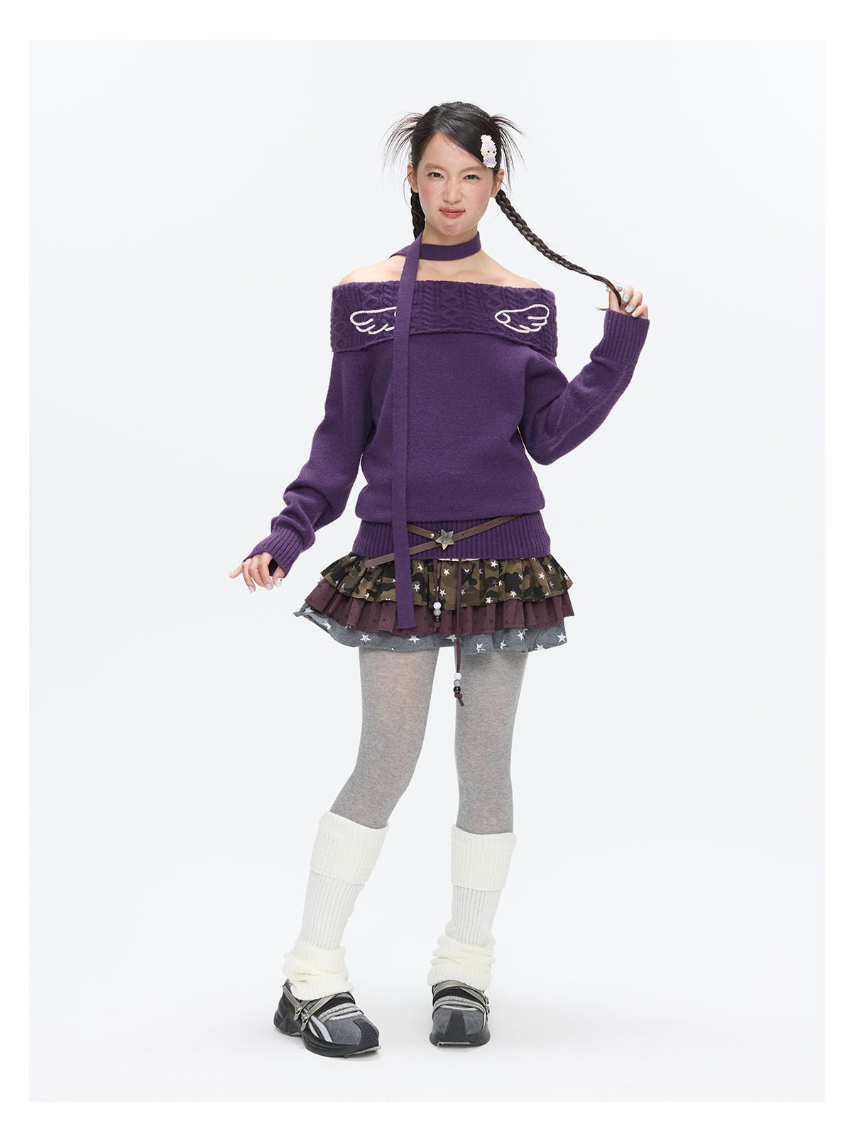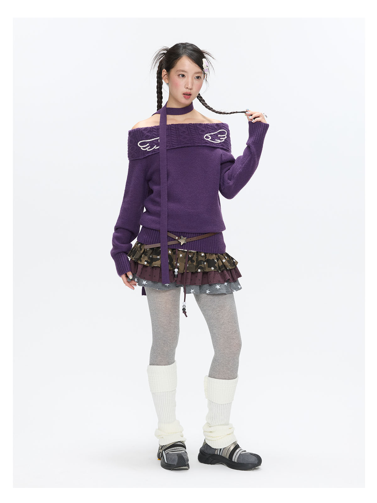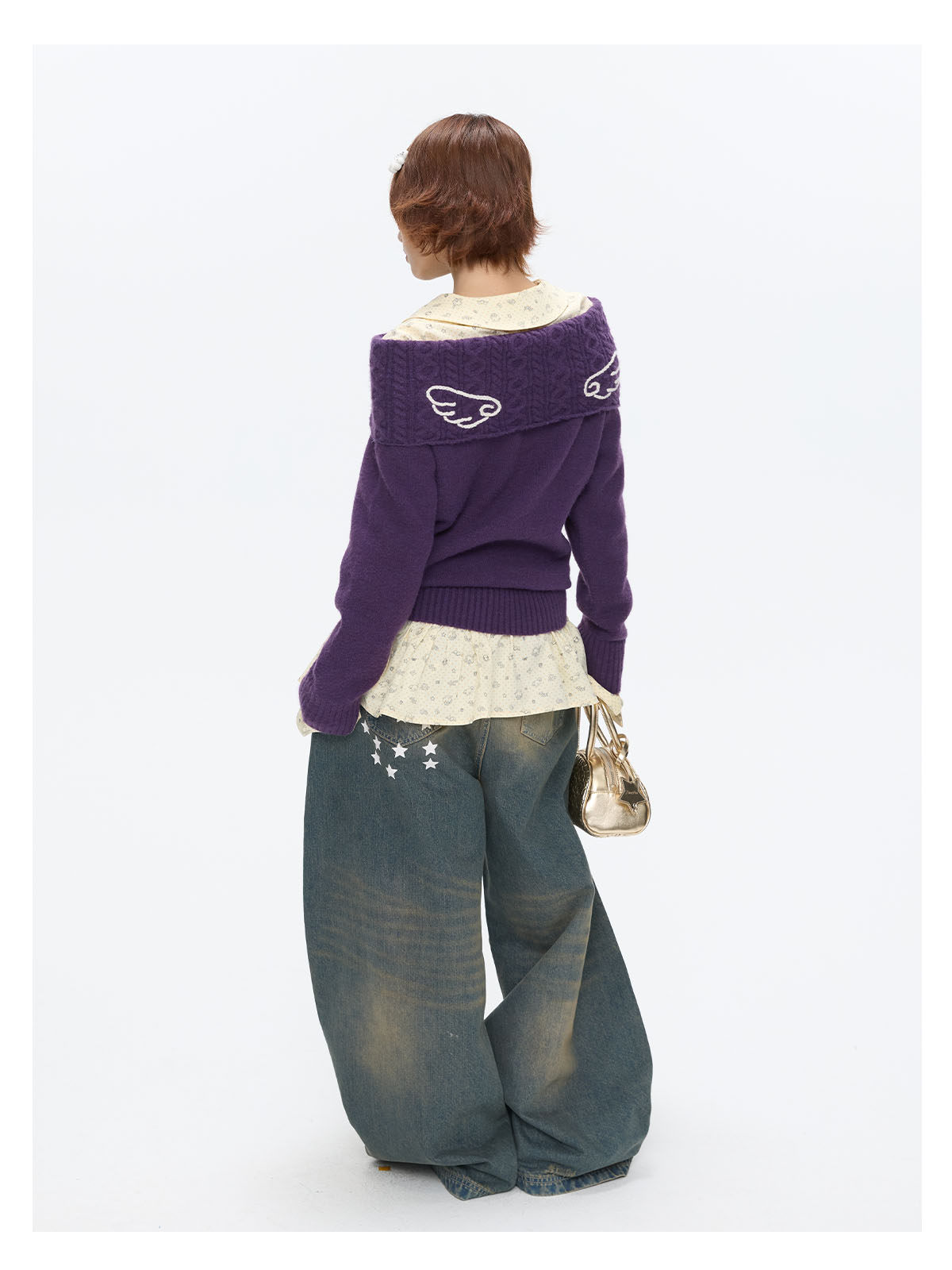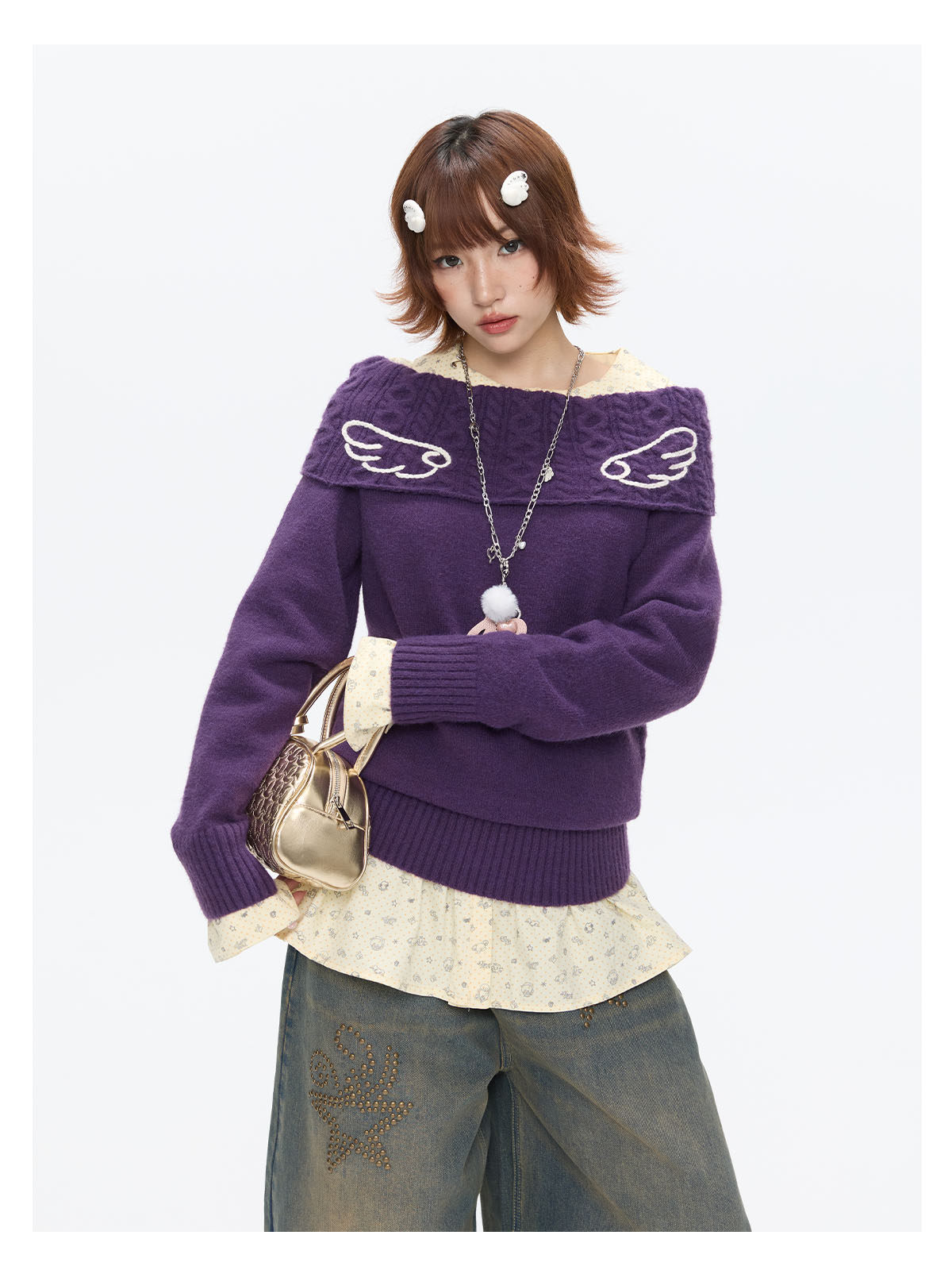 Purple off-shoulder crochet sweater with angel-wing detail Lookbook