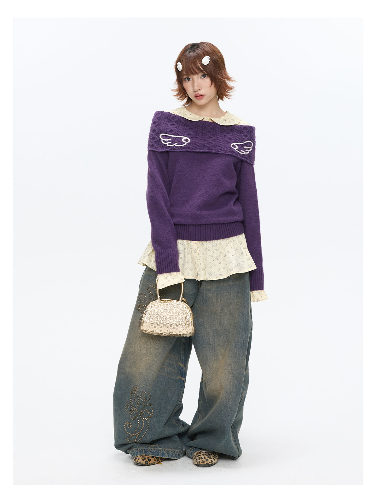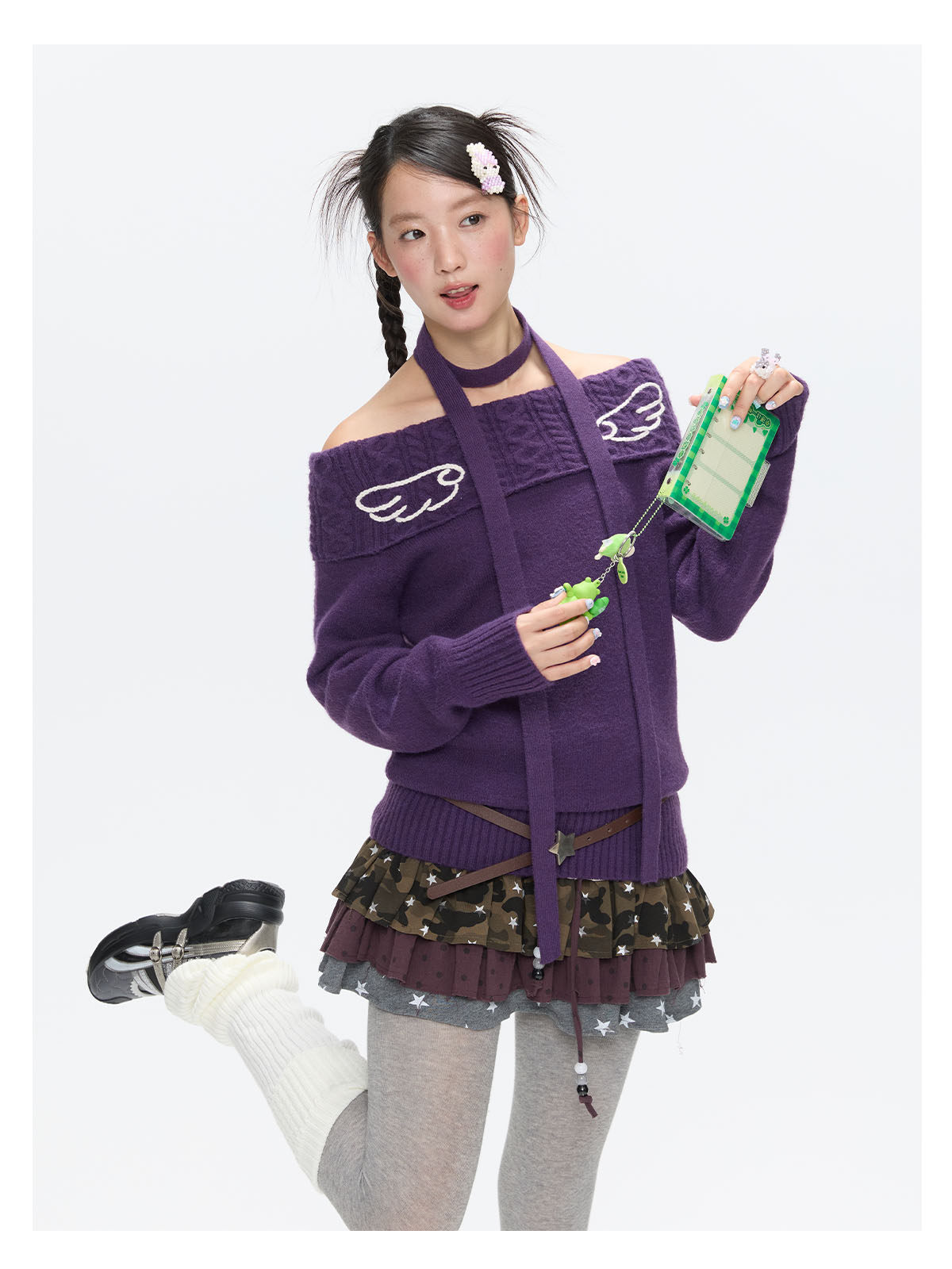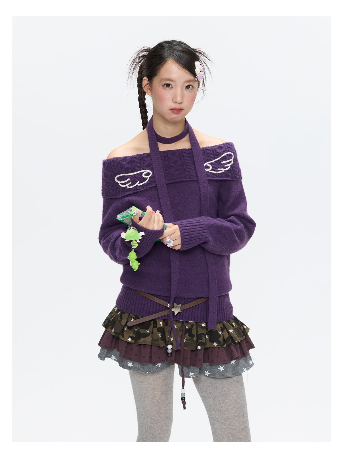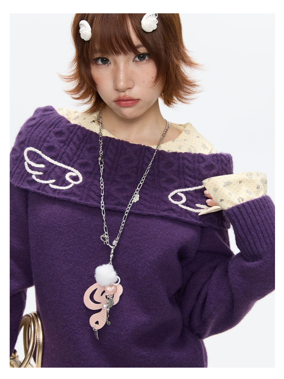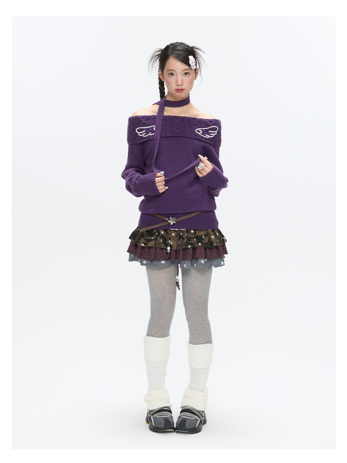 Purple off-shoulder crochet sweater with angel-wing detail Lookbook