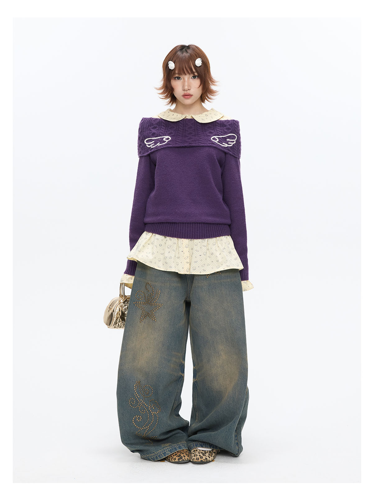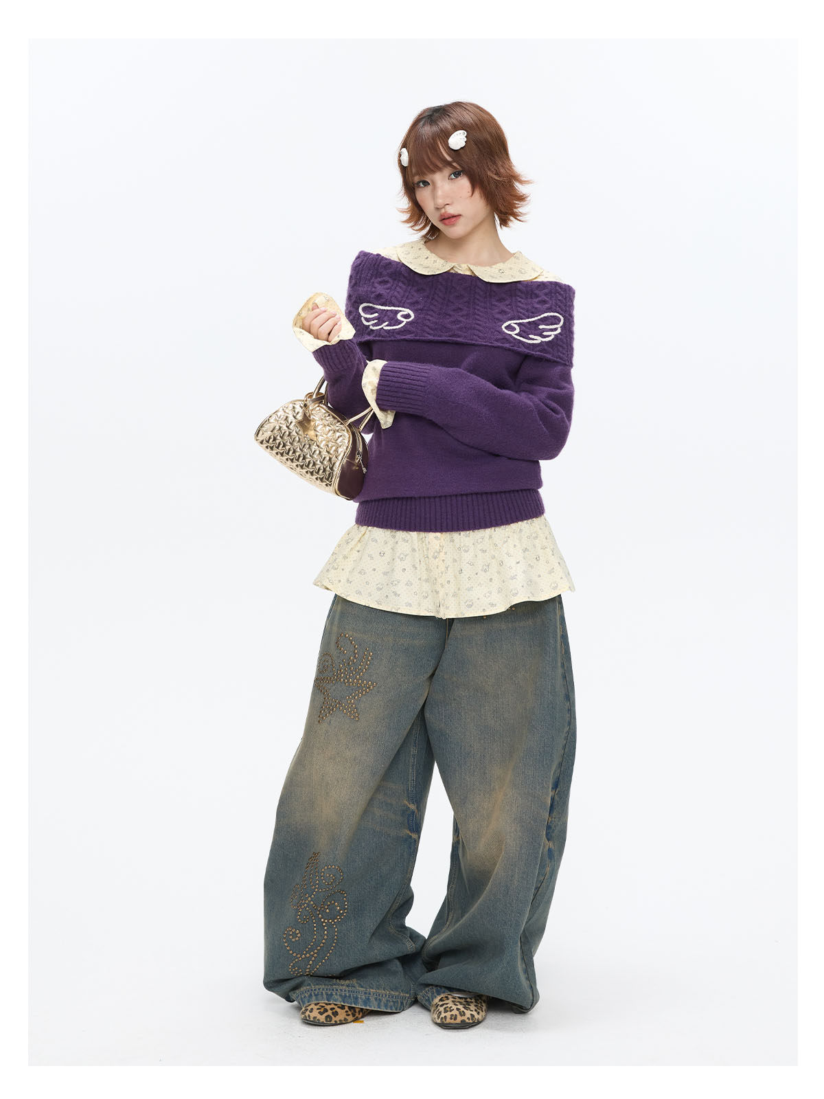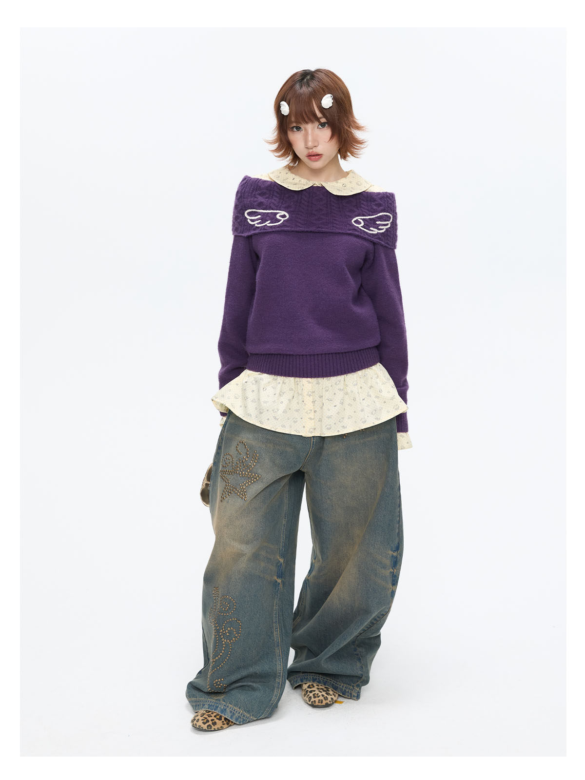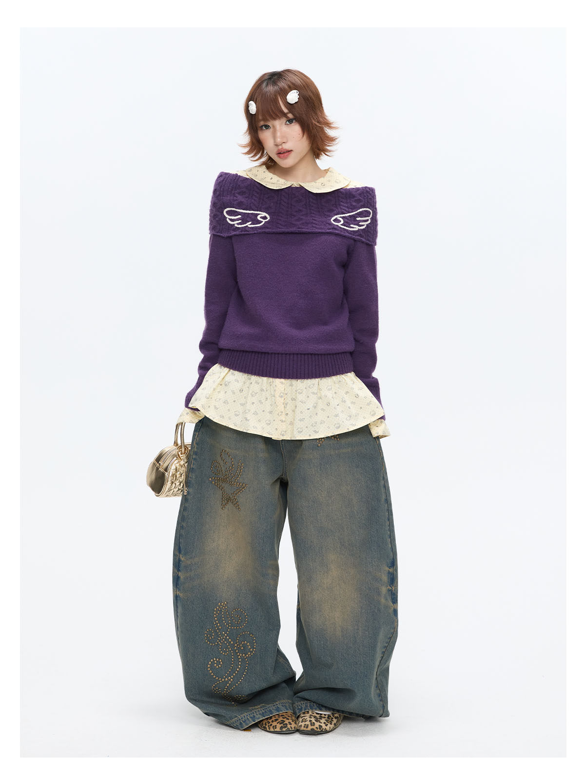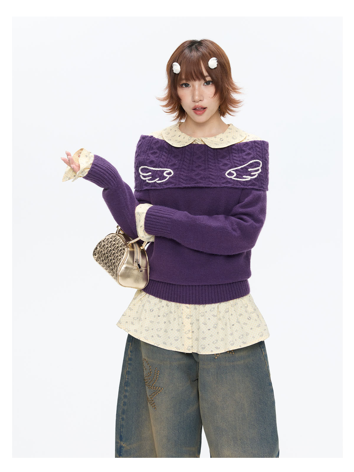 Purple off-shoulder crochet sweater with angel-wing detail Lookbook