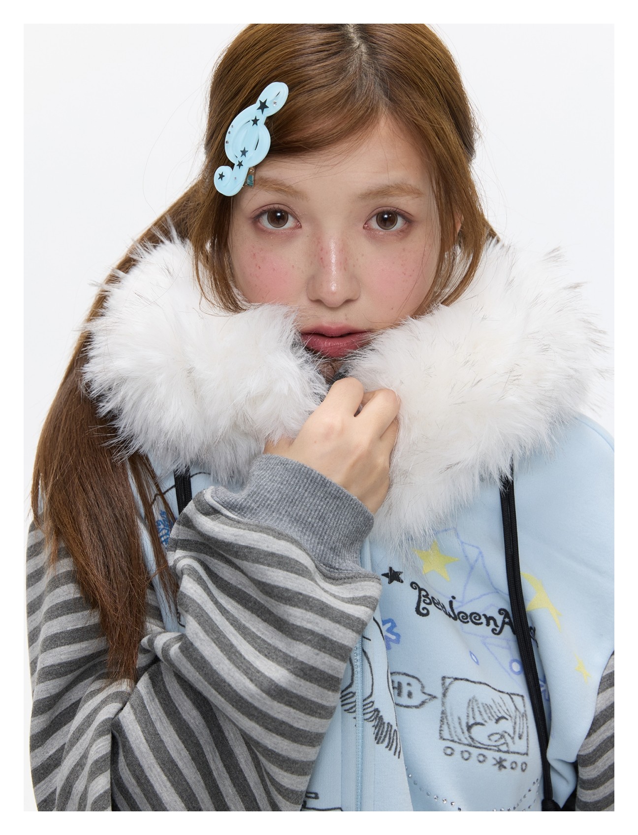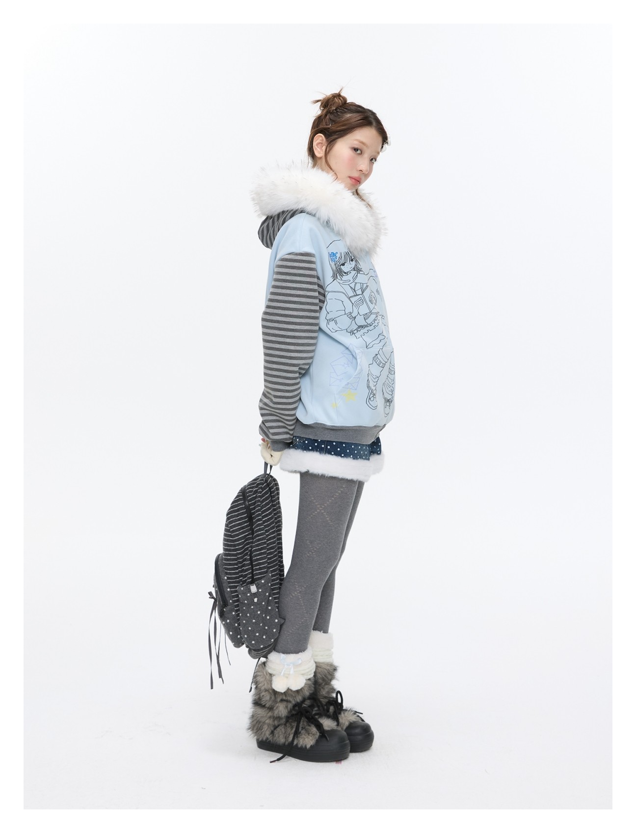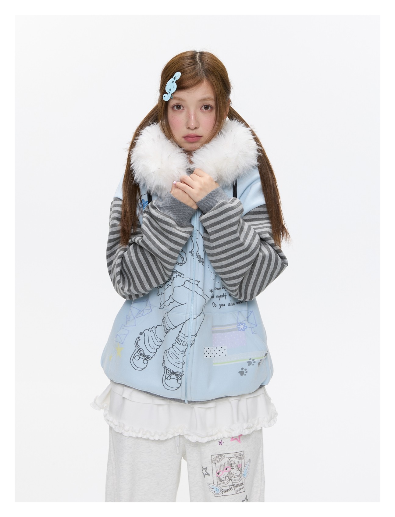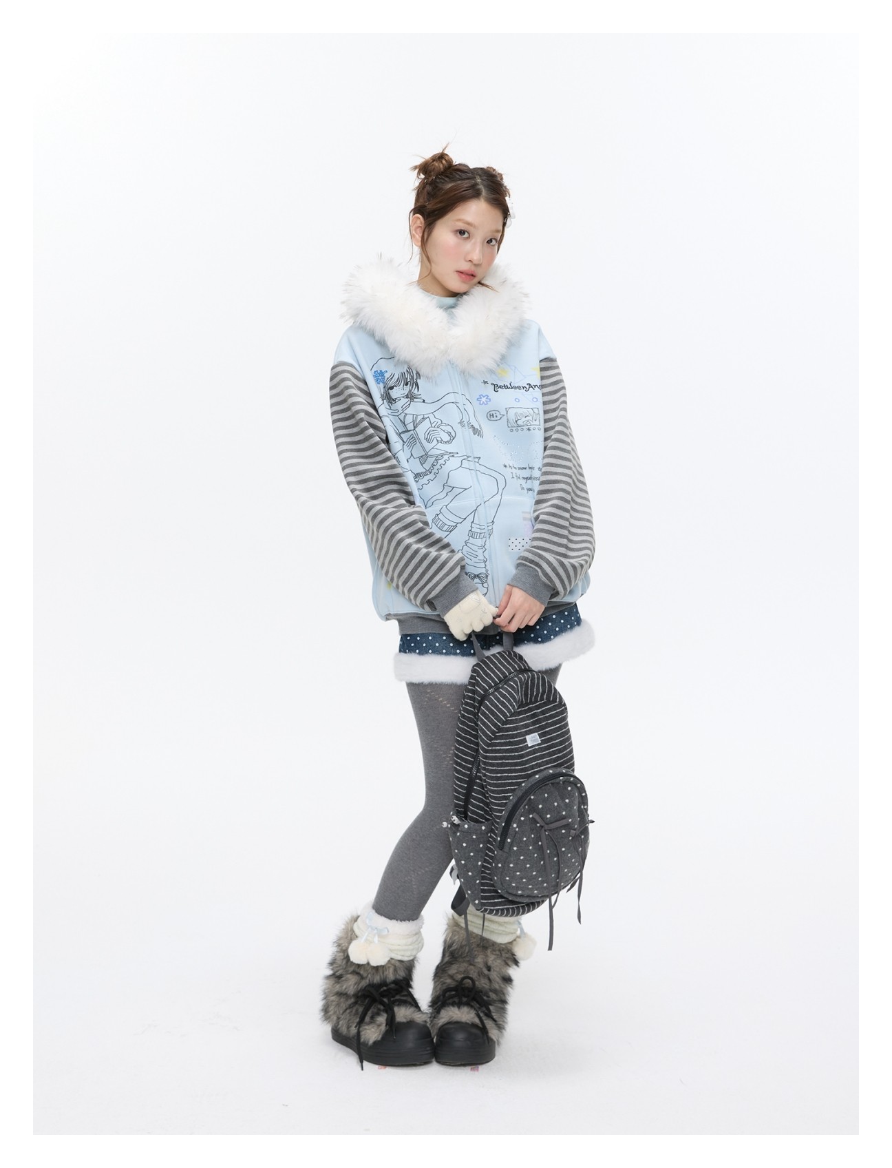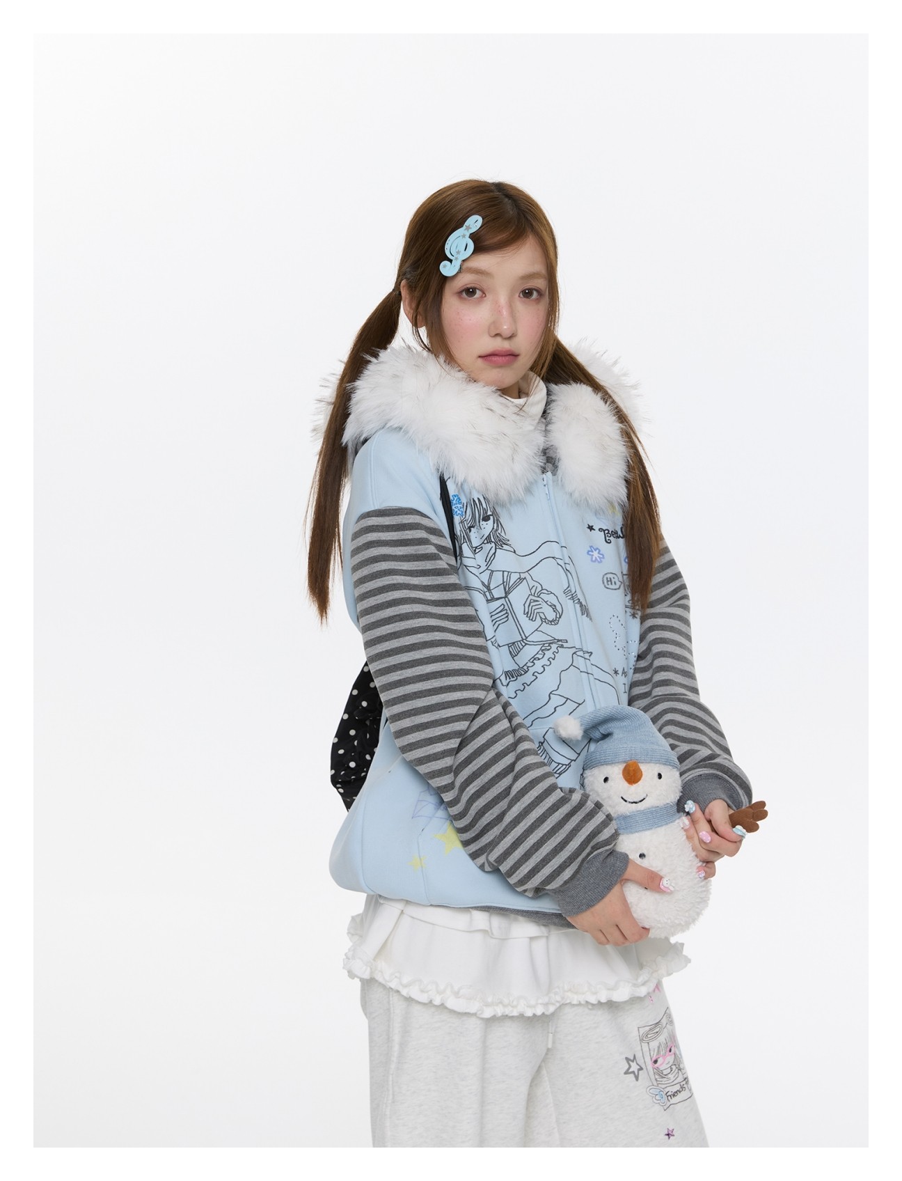 Sea-salt blue striped raglan fleece hoodie with faux fur collar Lookbook