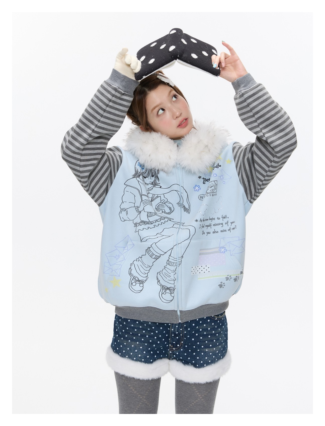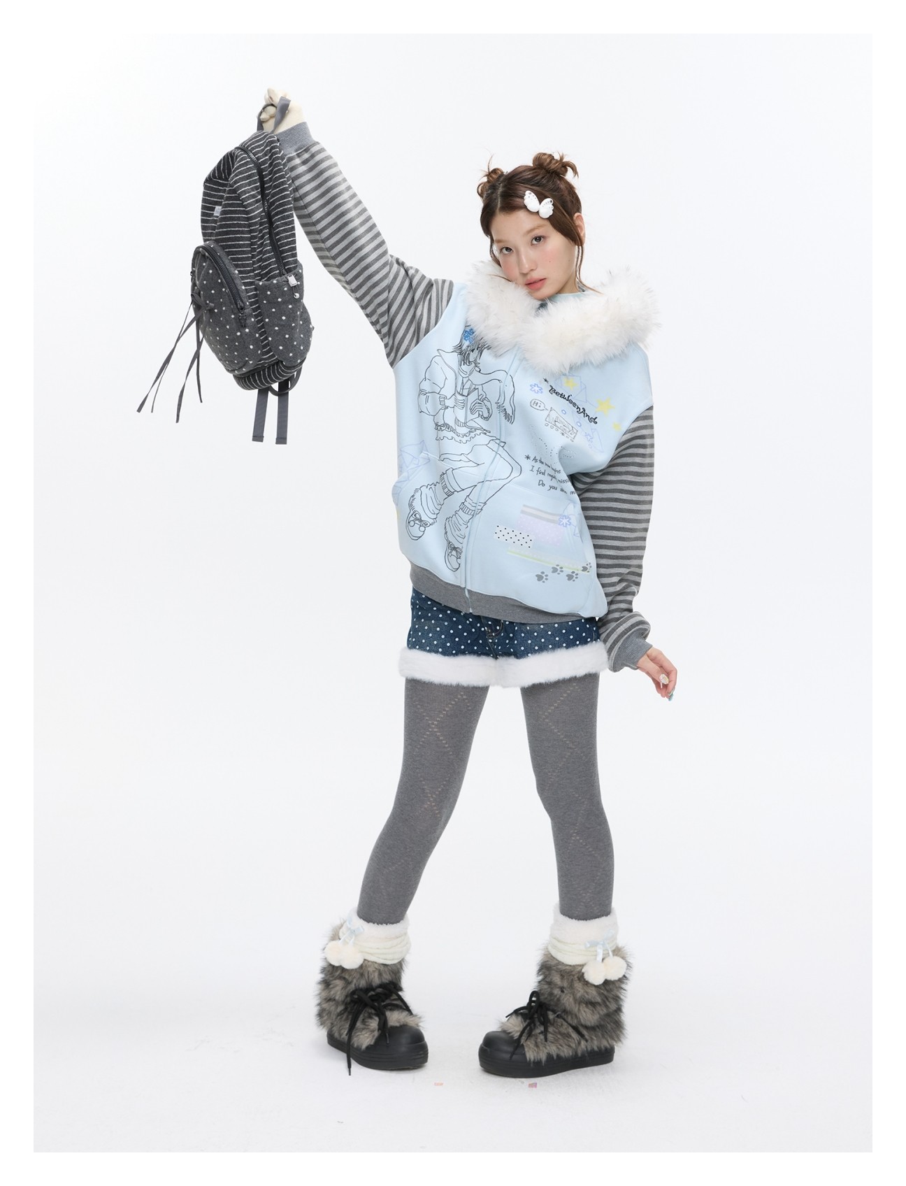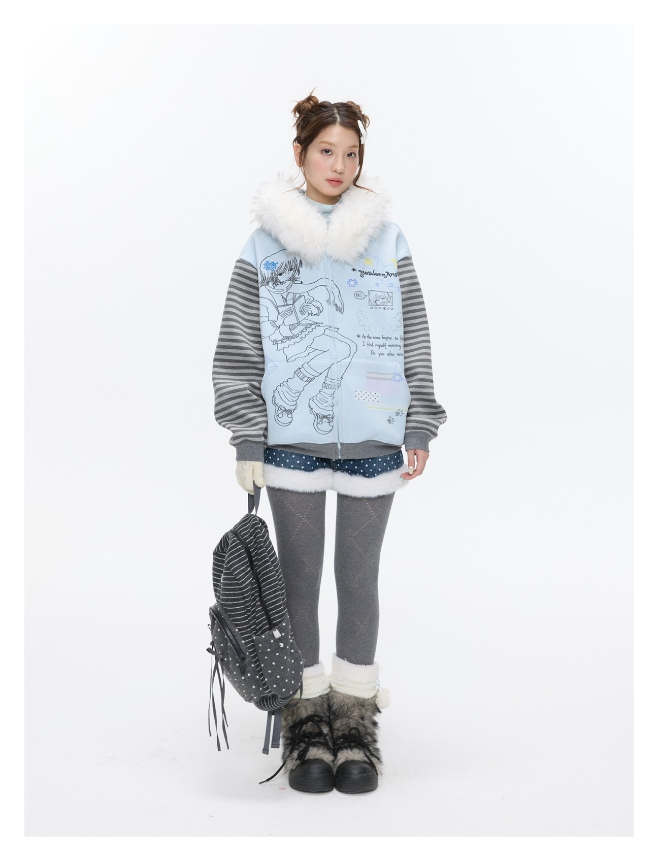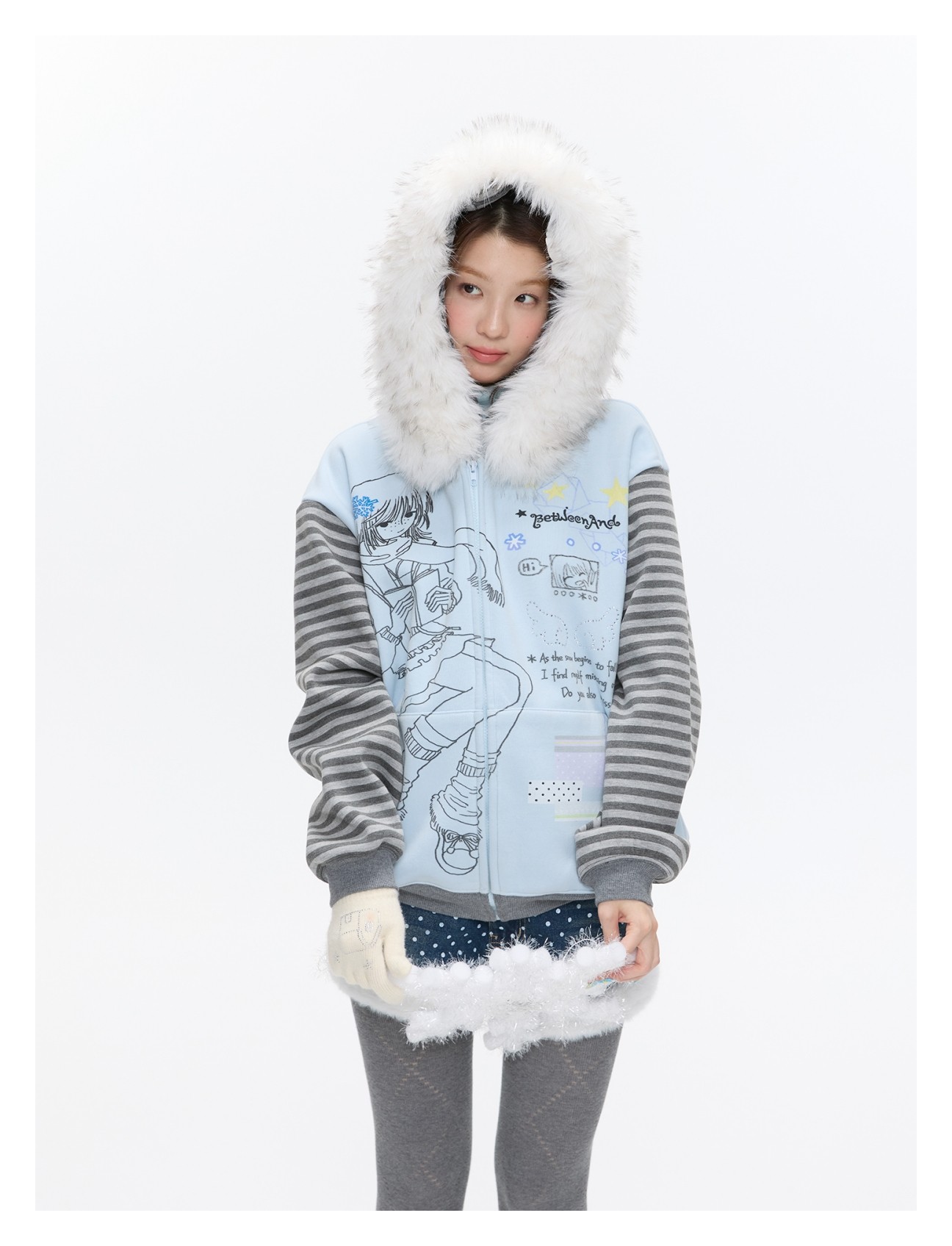 Sea-salt blue striped raglan fleece hoodie with faux fur collar Lookbook
