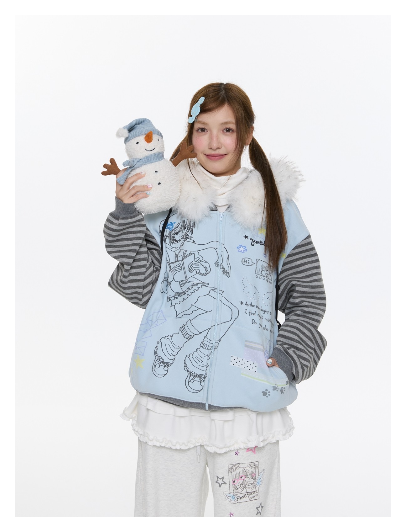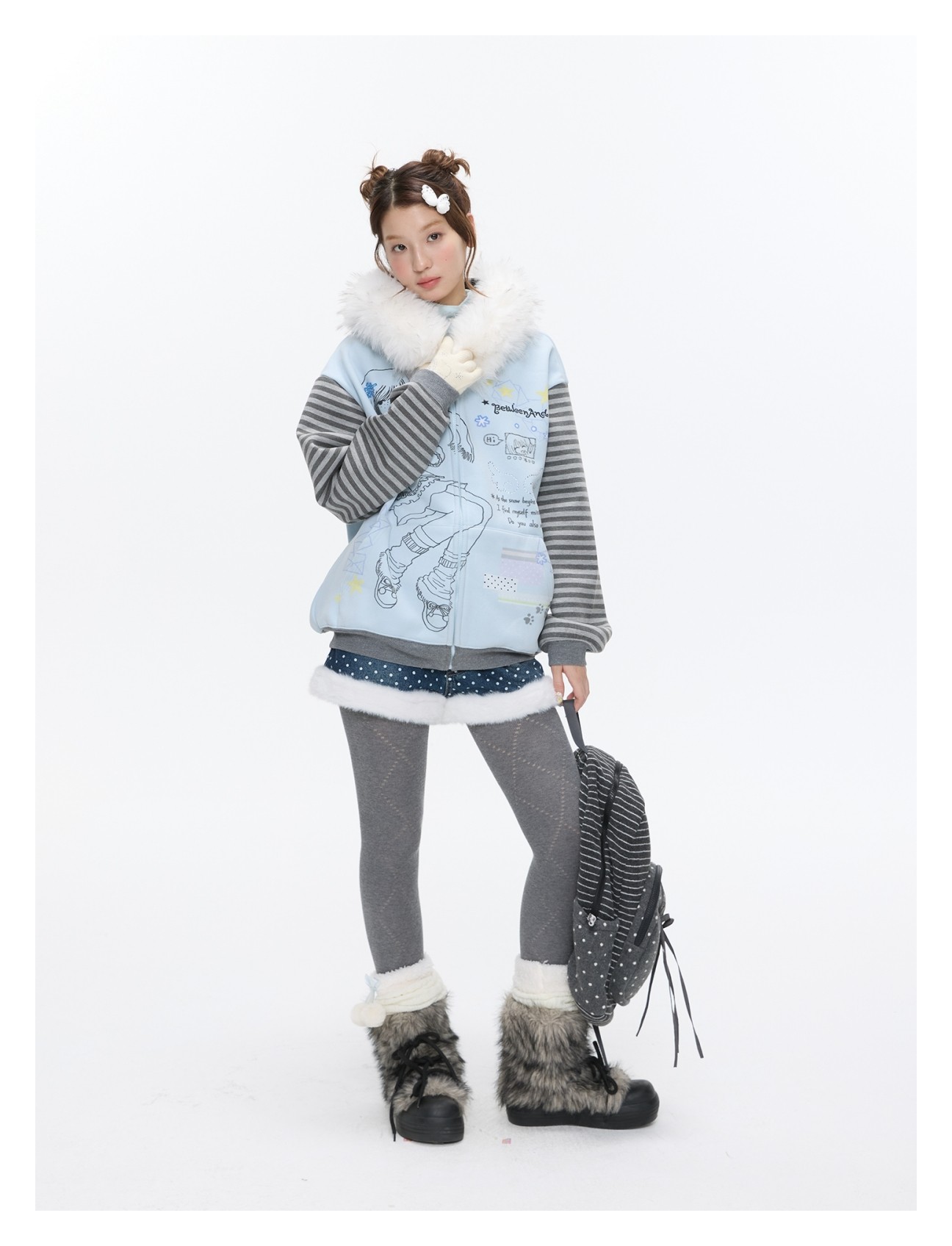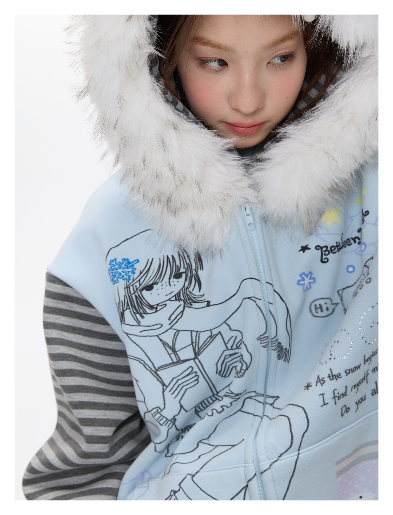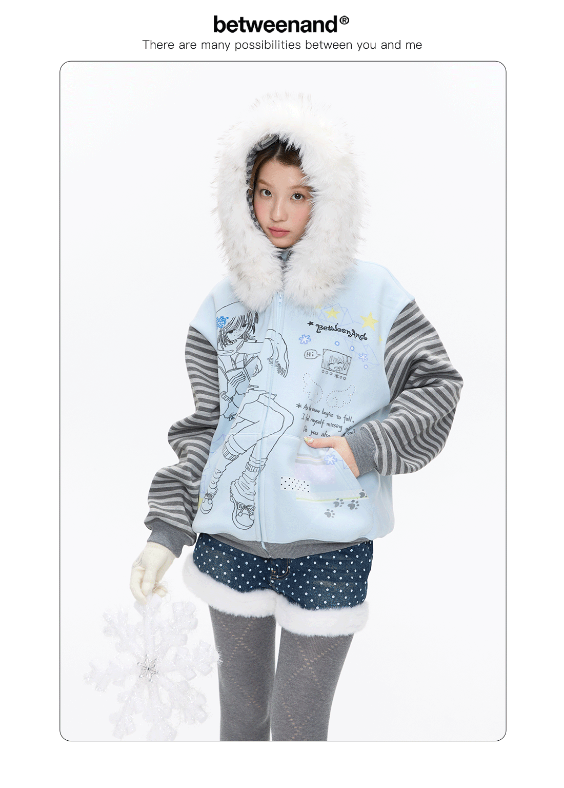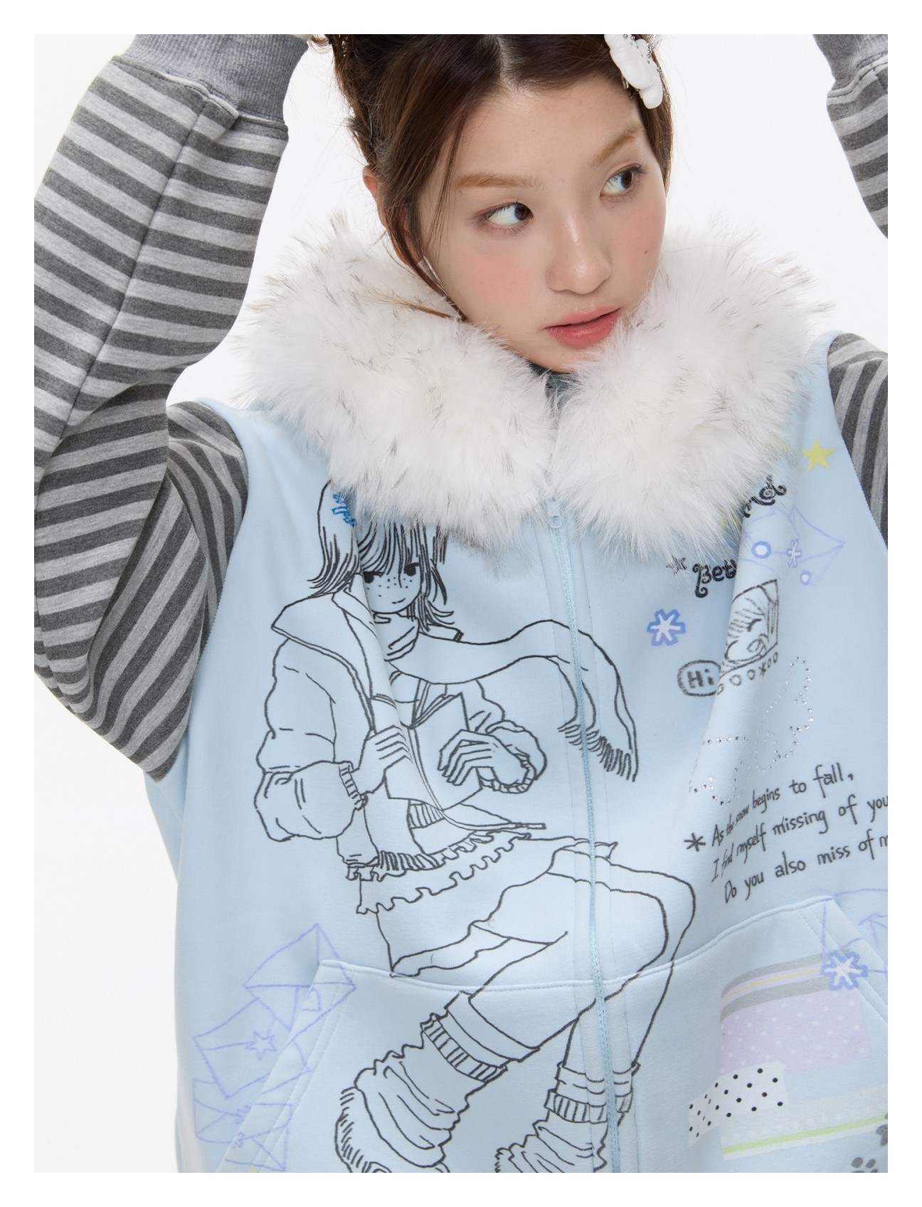 Sea-salt blue striped raglan fleece hoodie with faux fur collar Lookbook