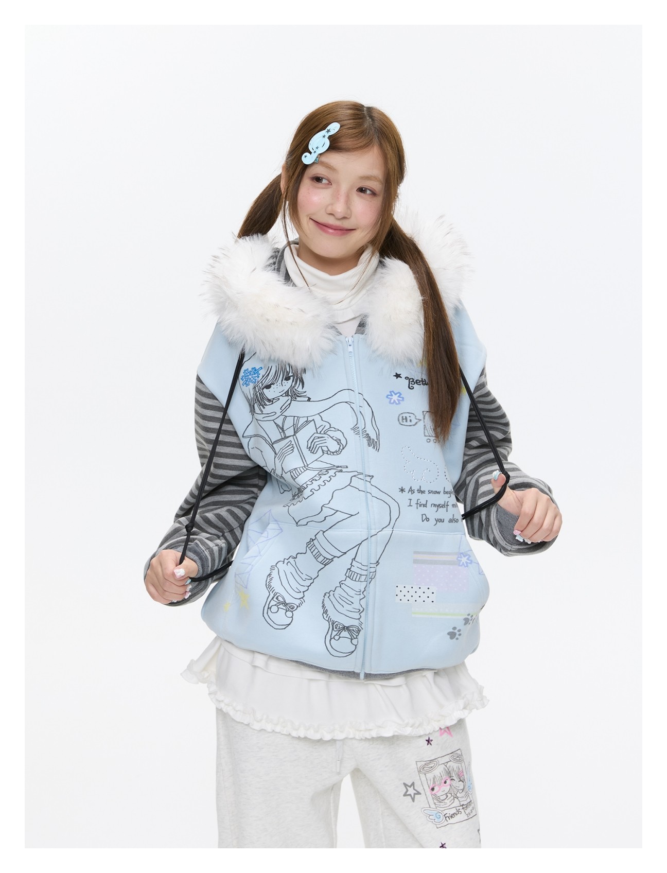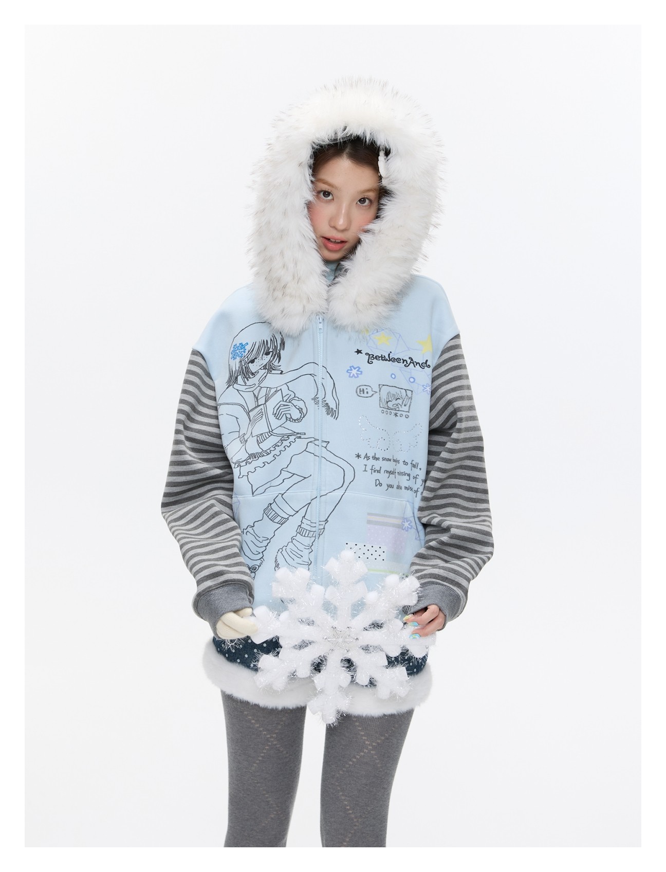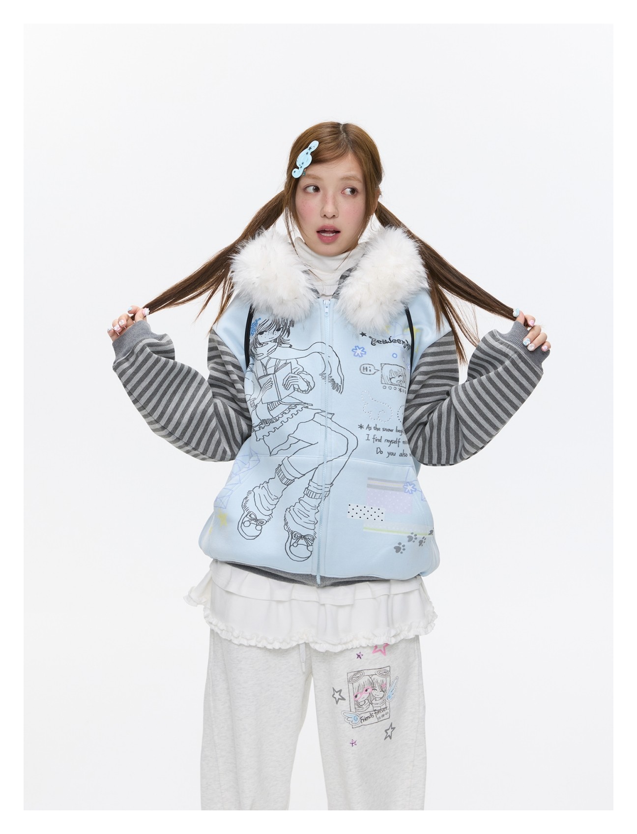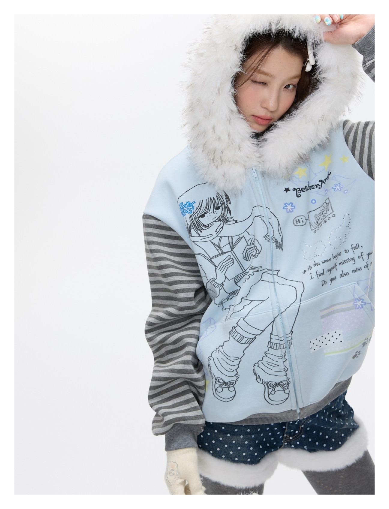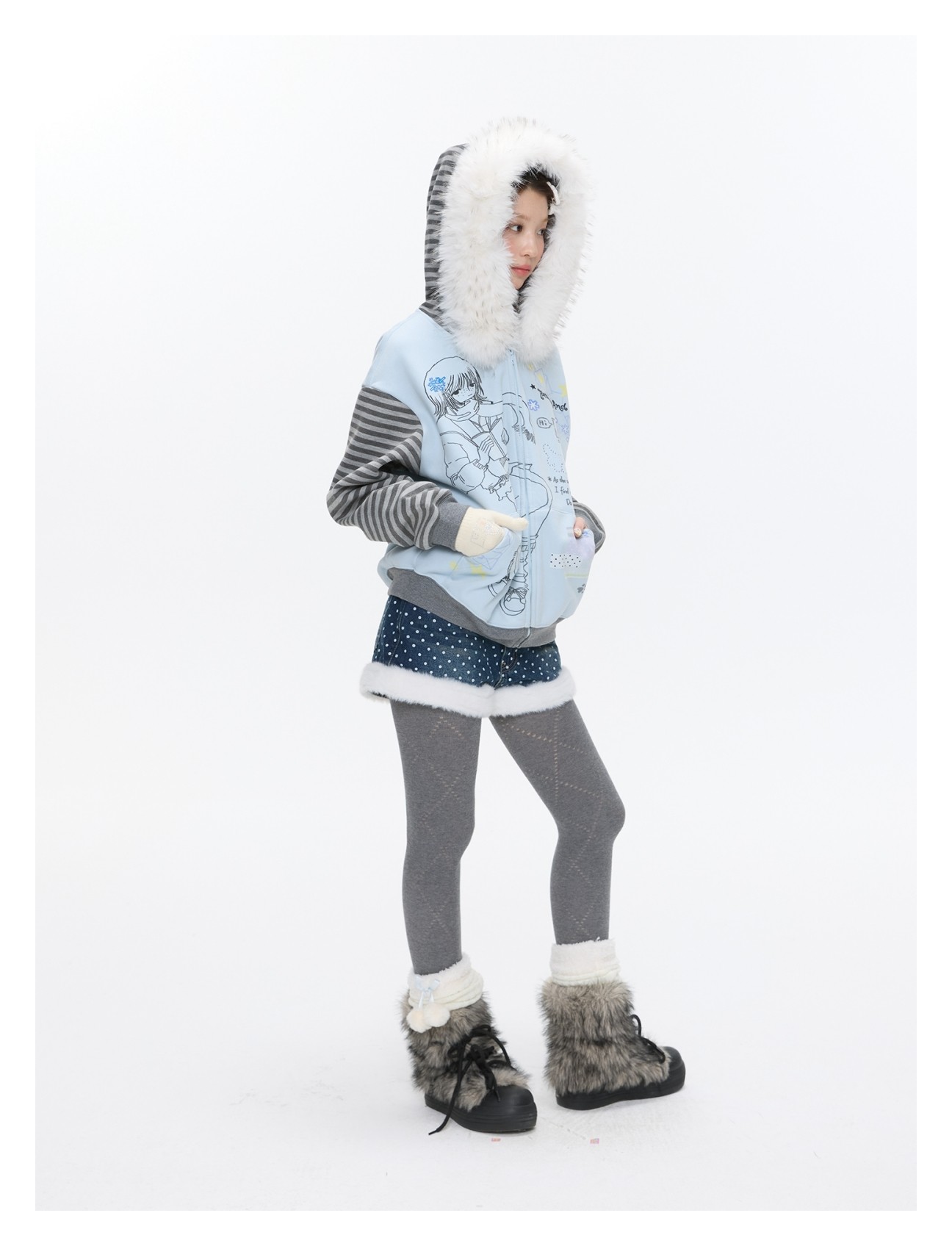 Sea-salt blue striped raglan fleece hoodie with faux fur collar Lookbook