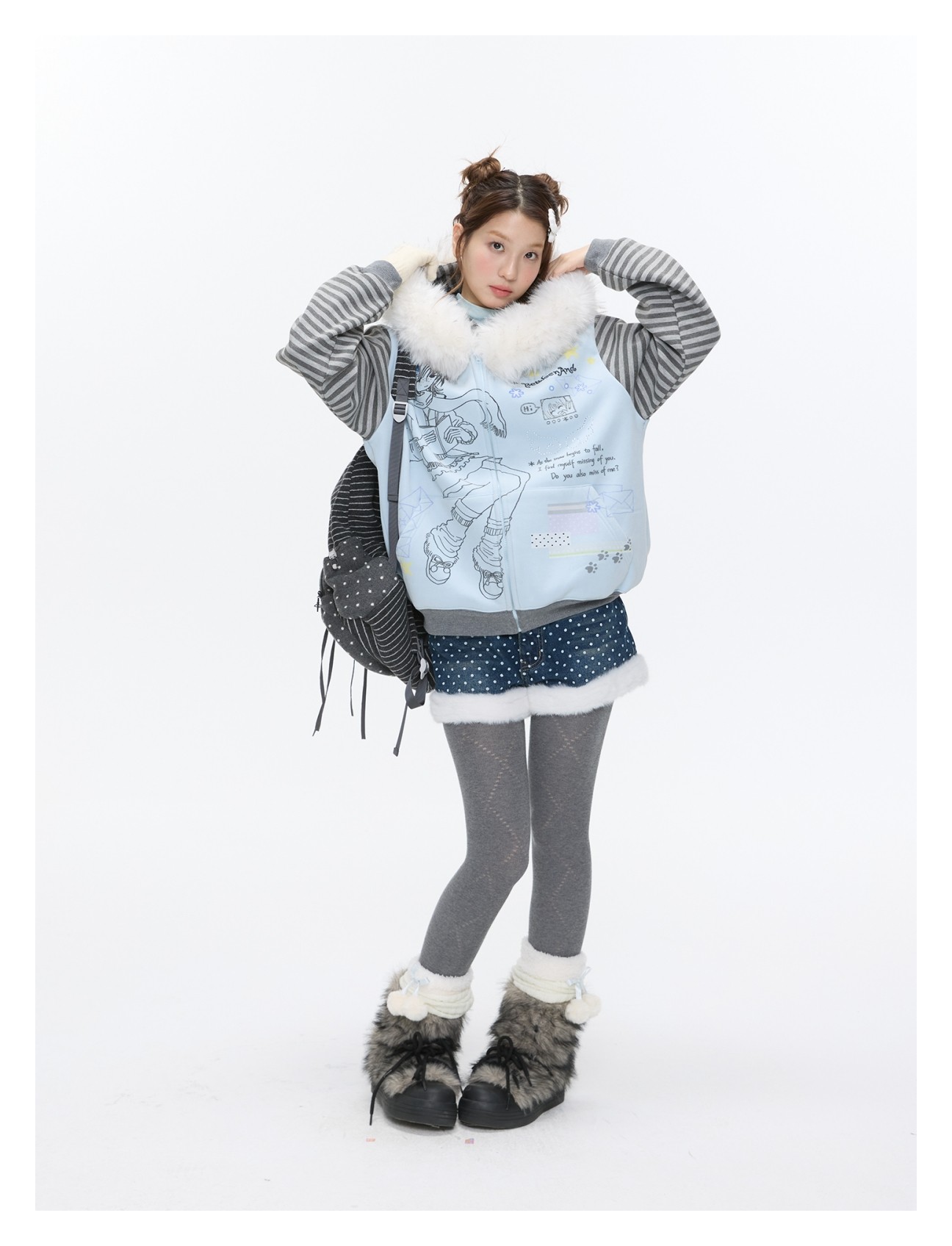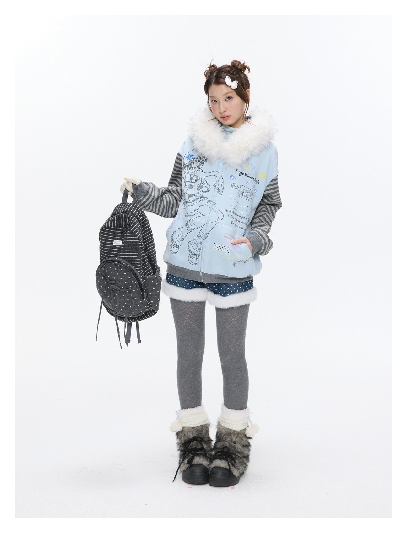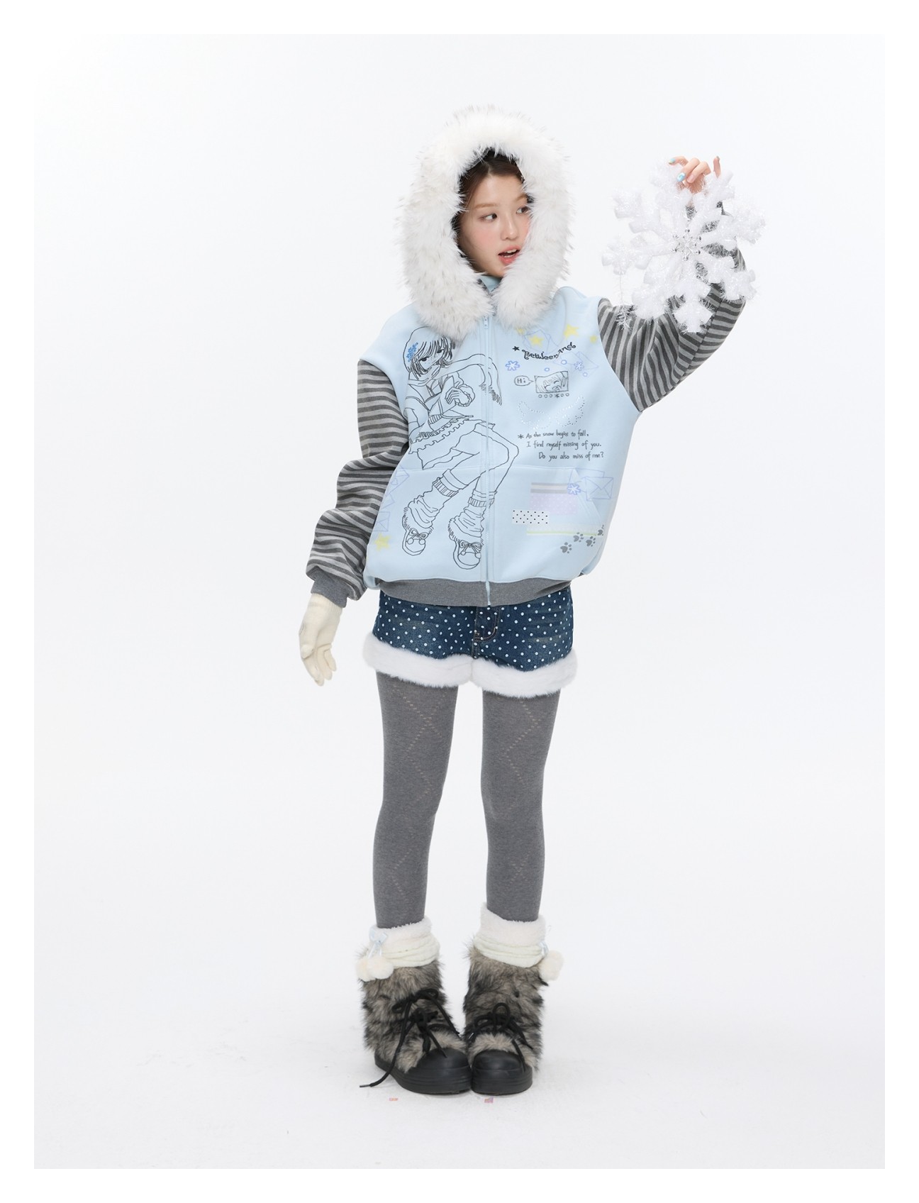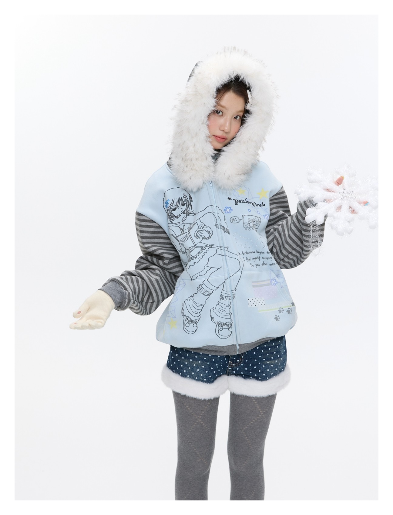 Sea-salt blue striped raglan fleece hoodie with faux fur collar Lookbook