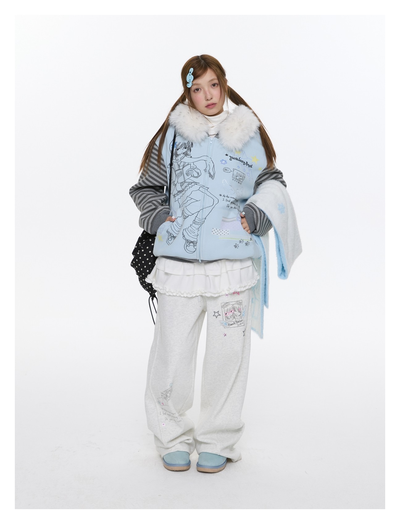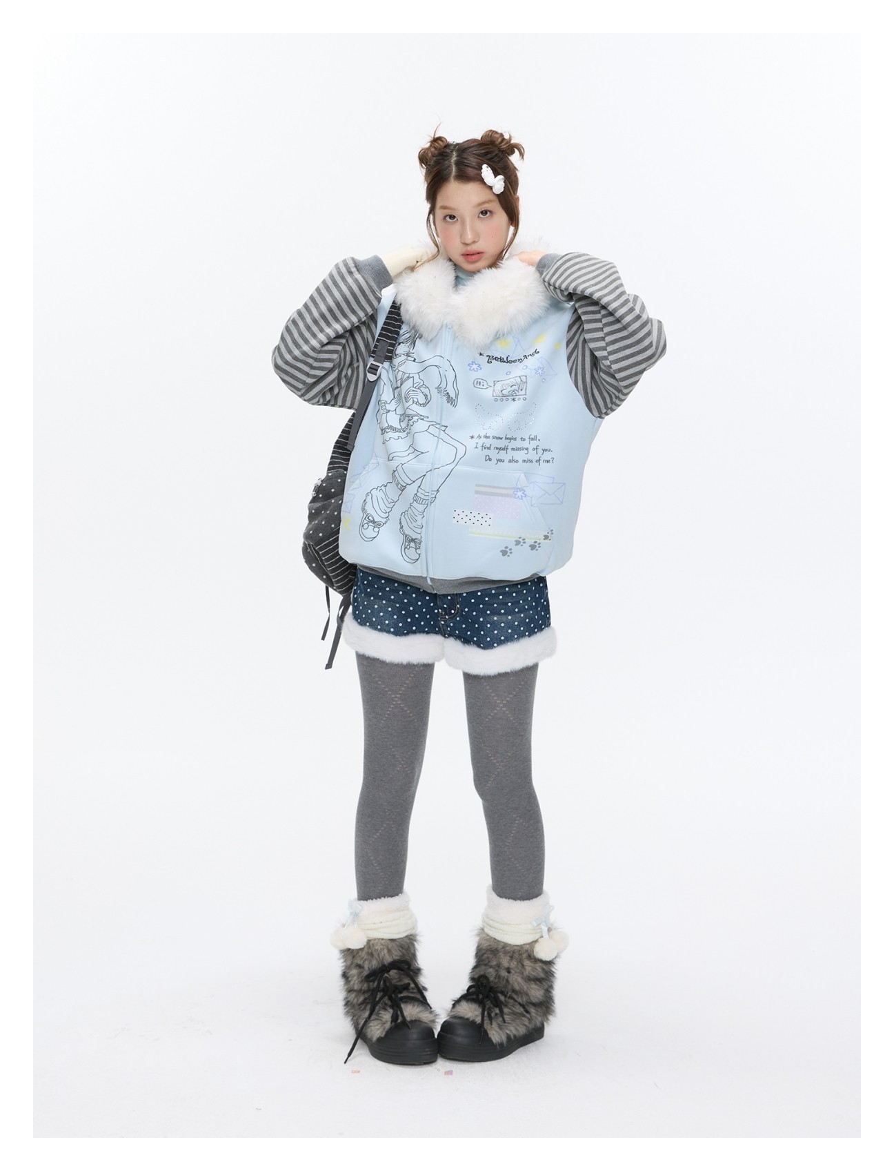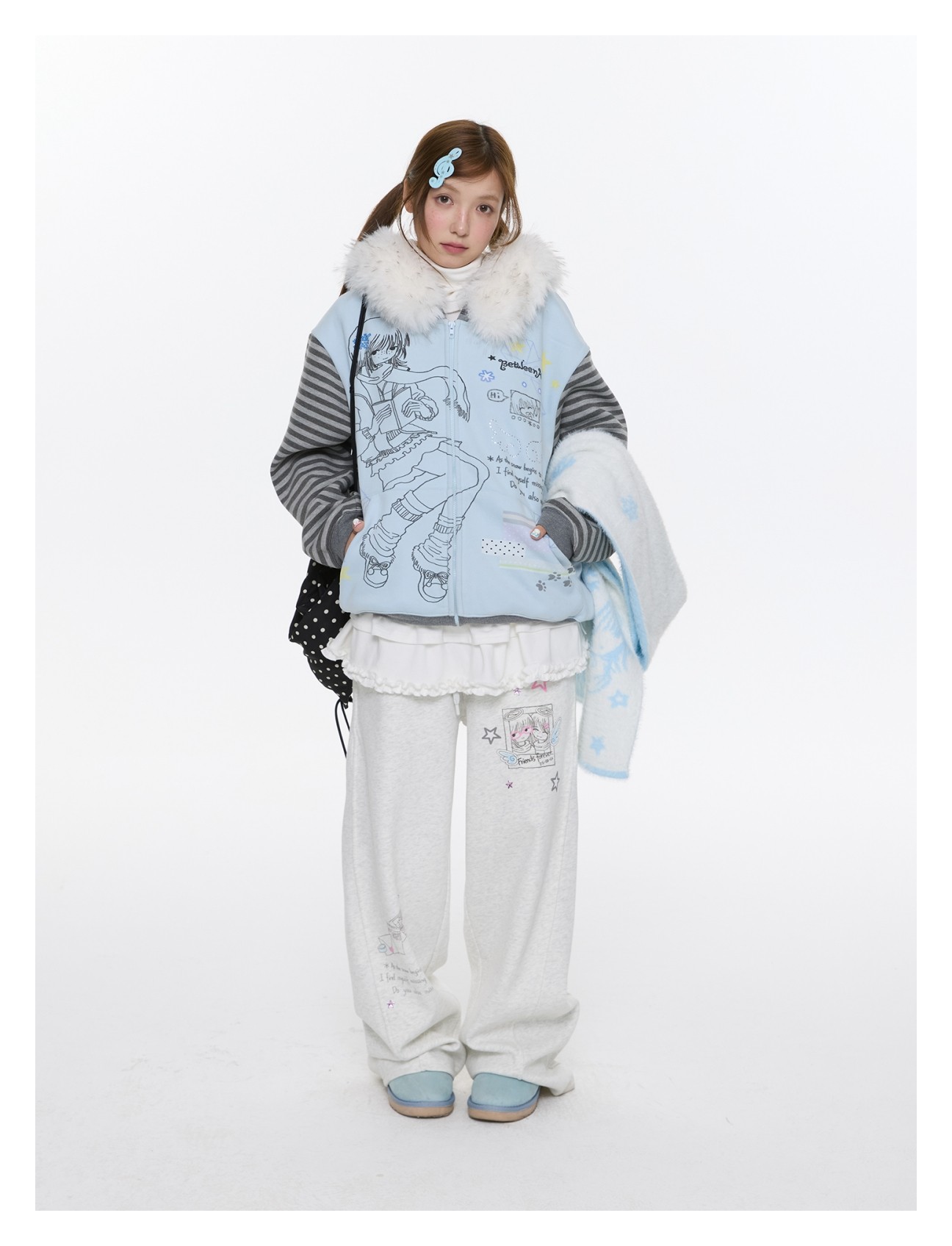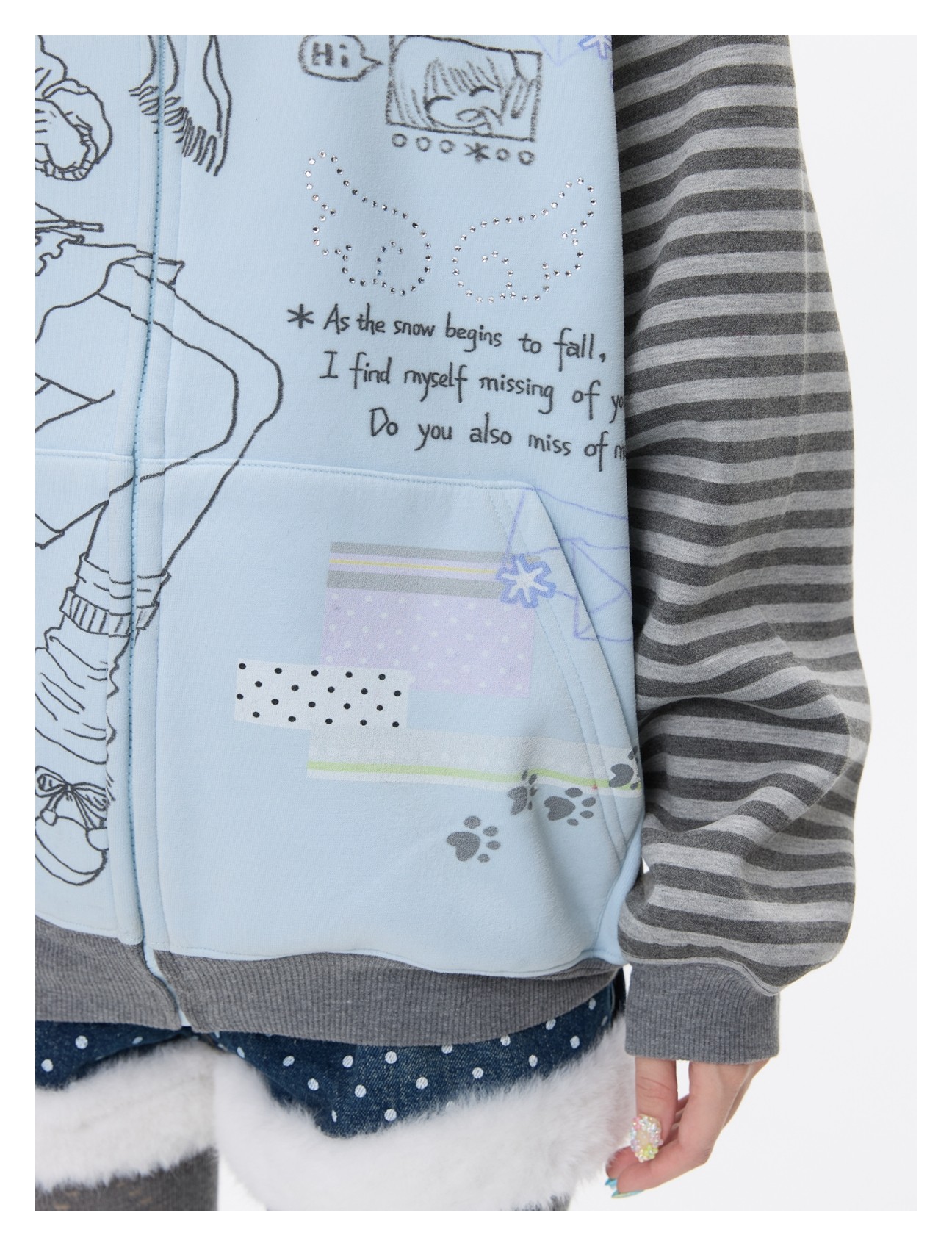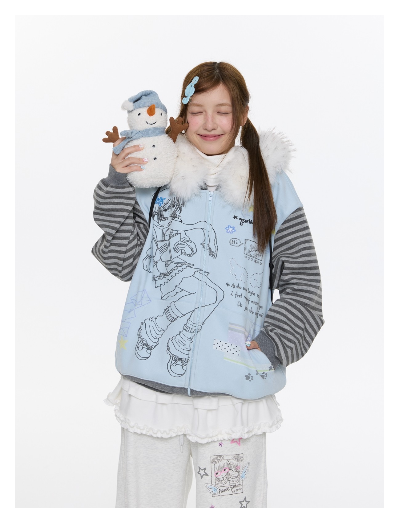 Sea-salt blue striped raglan fleece hoodie with faux fur collar Lookbook