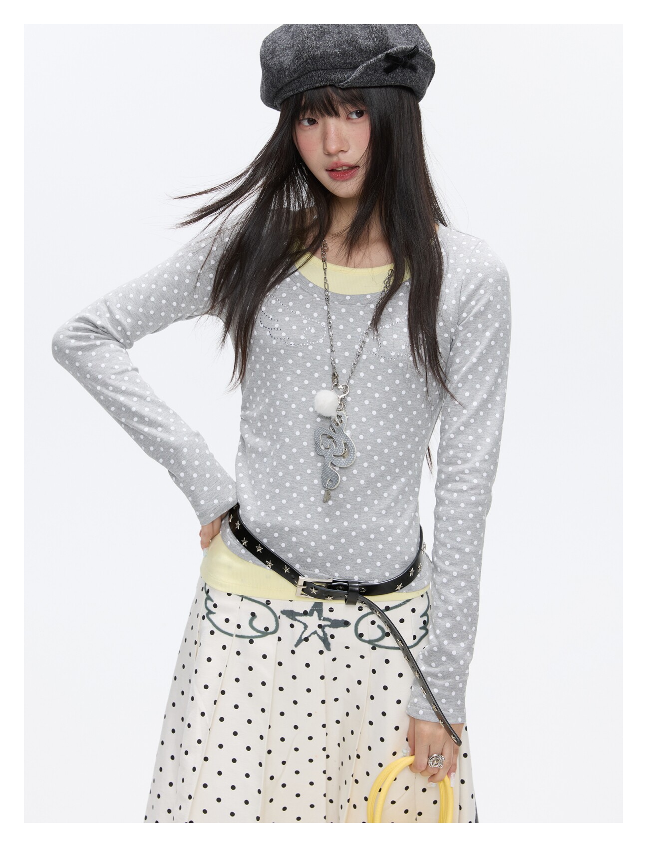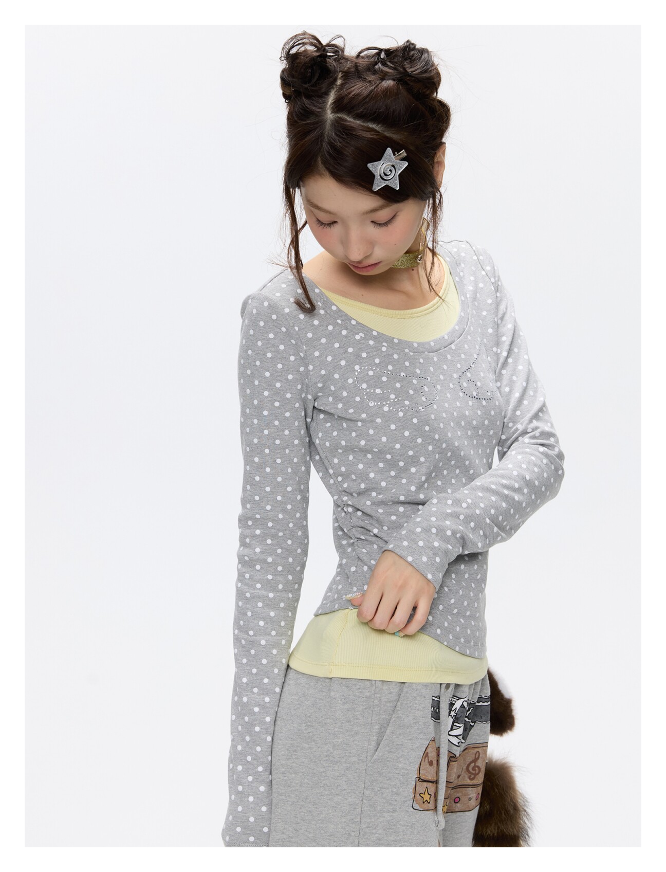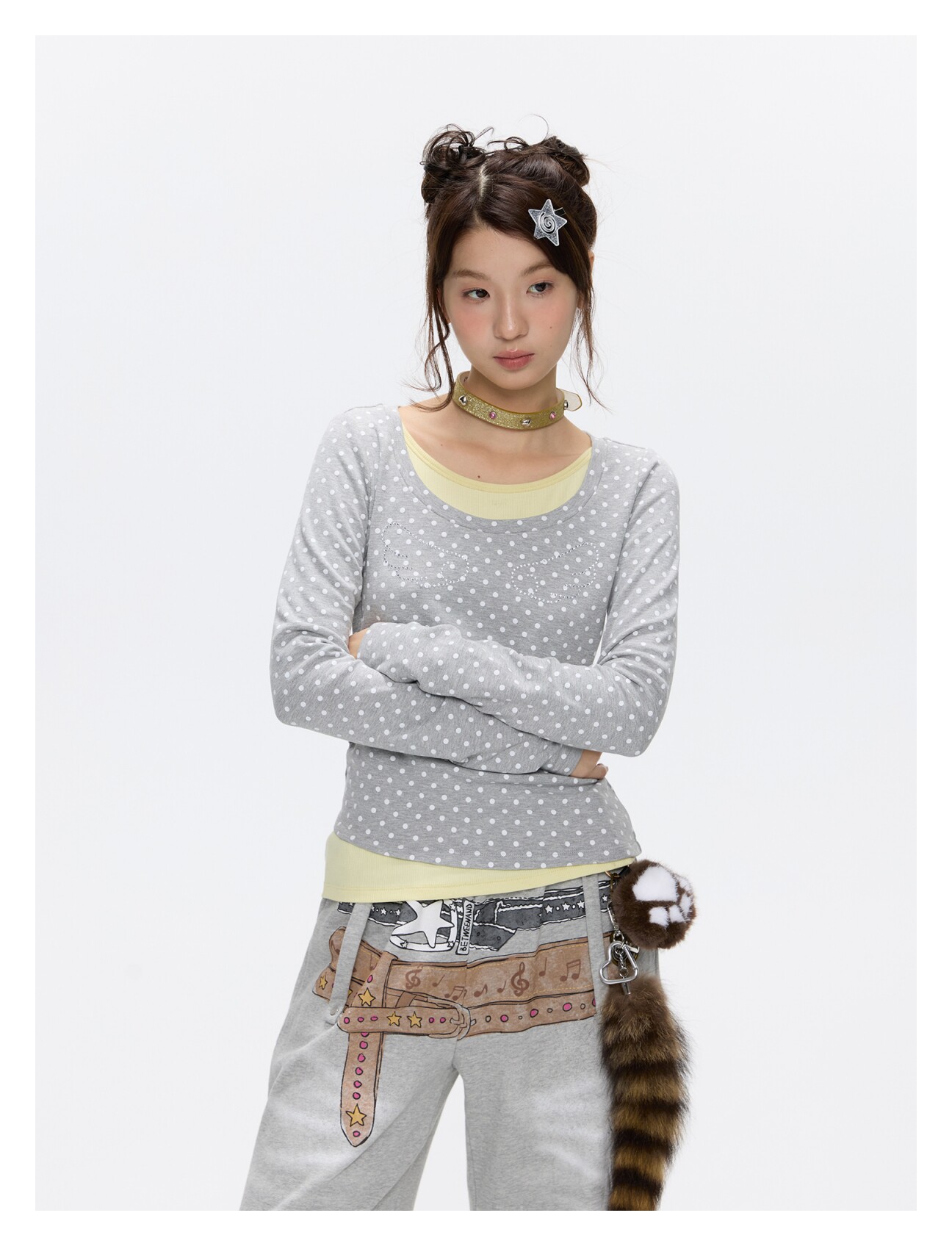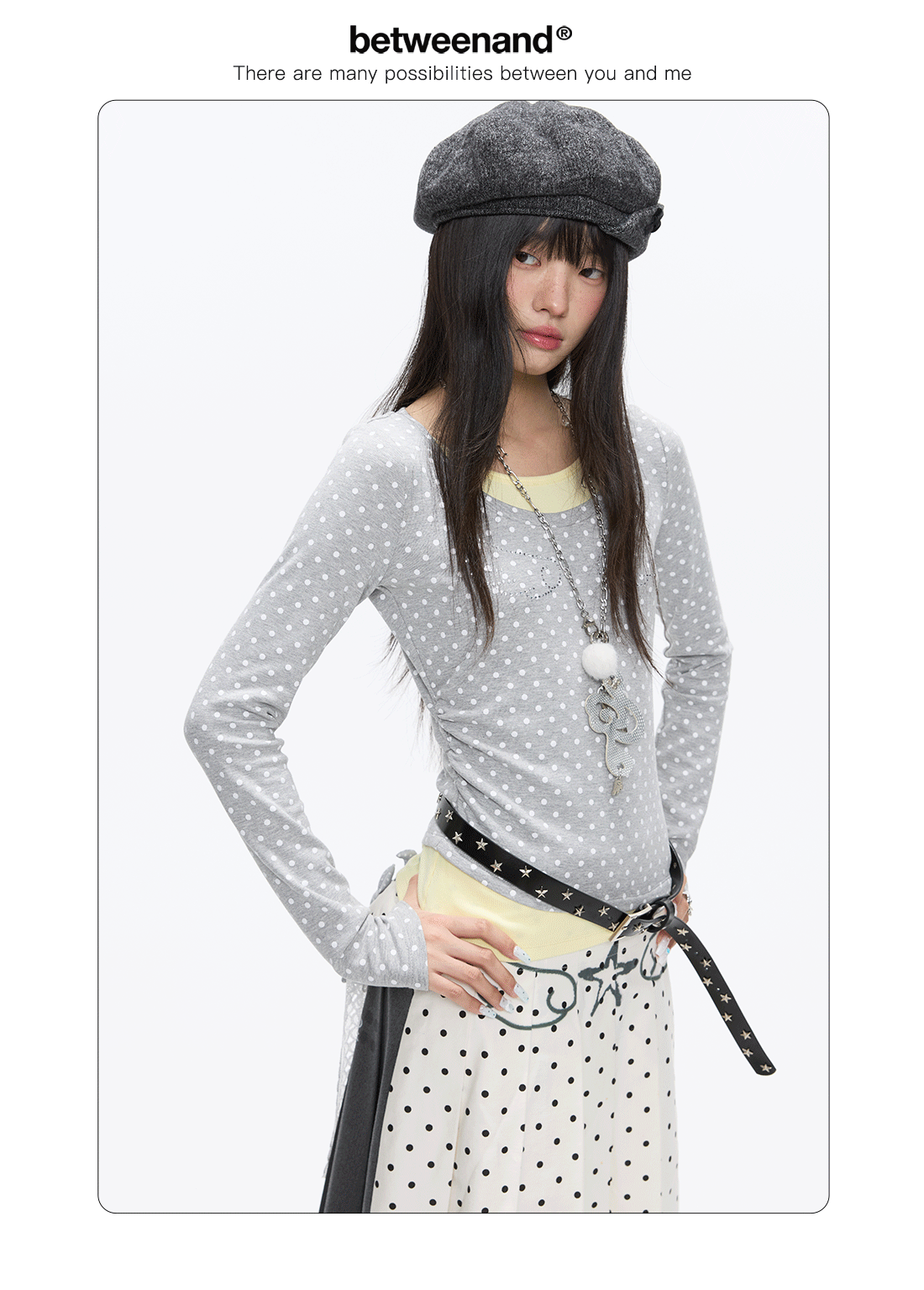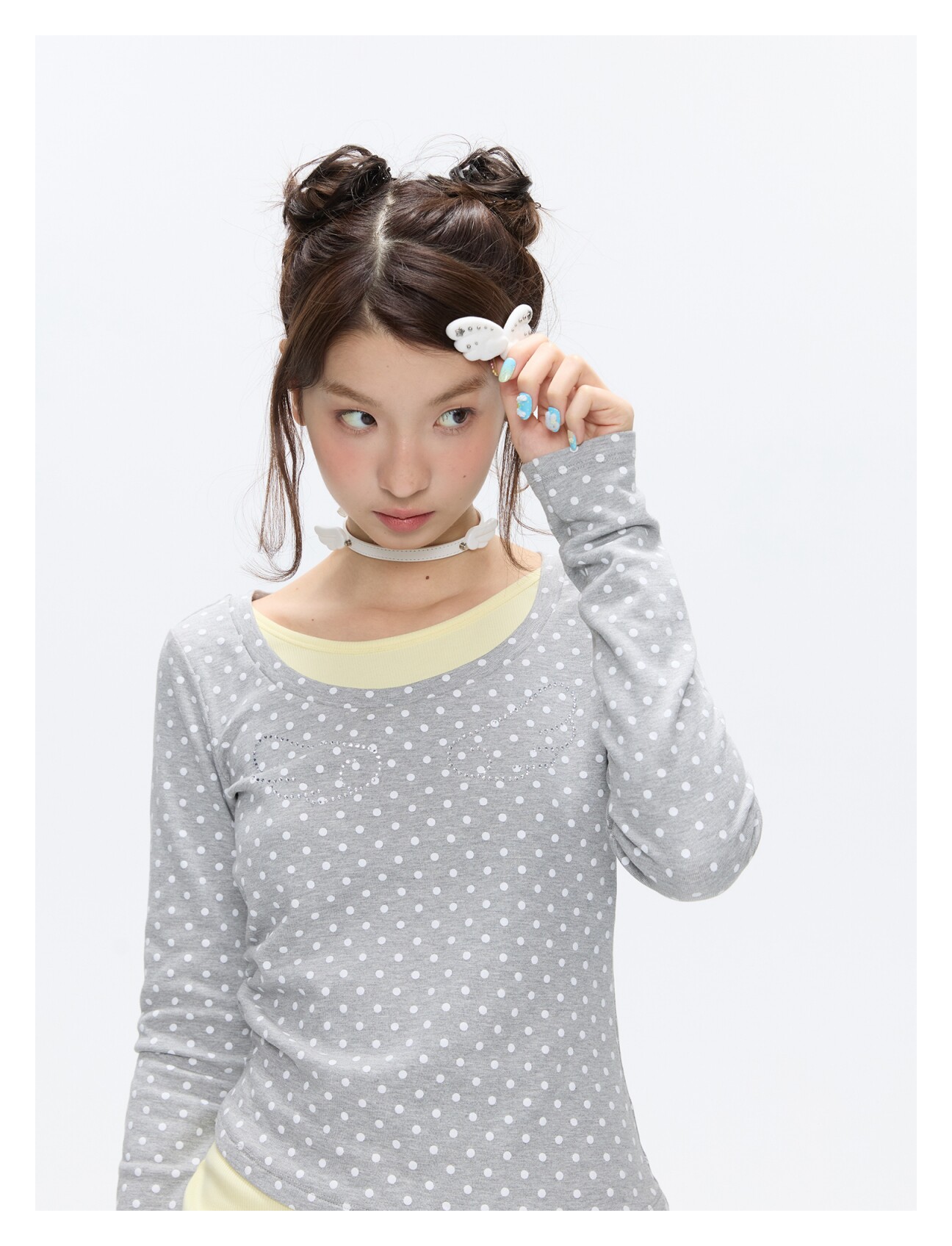 Soft faux-layer polka-dot long sleeve top Lookbook