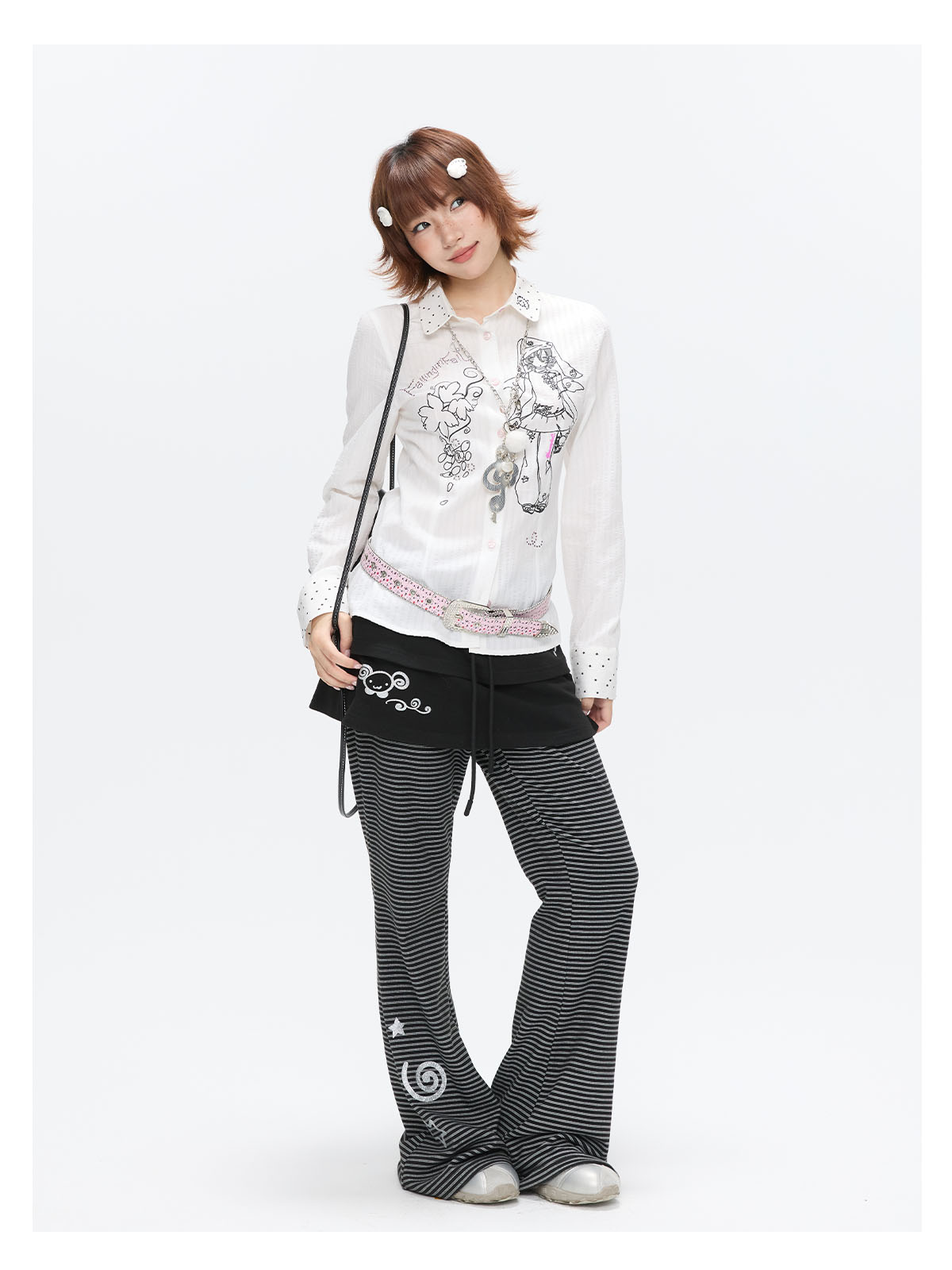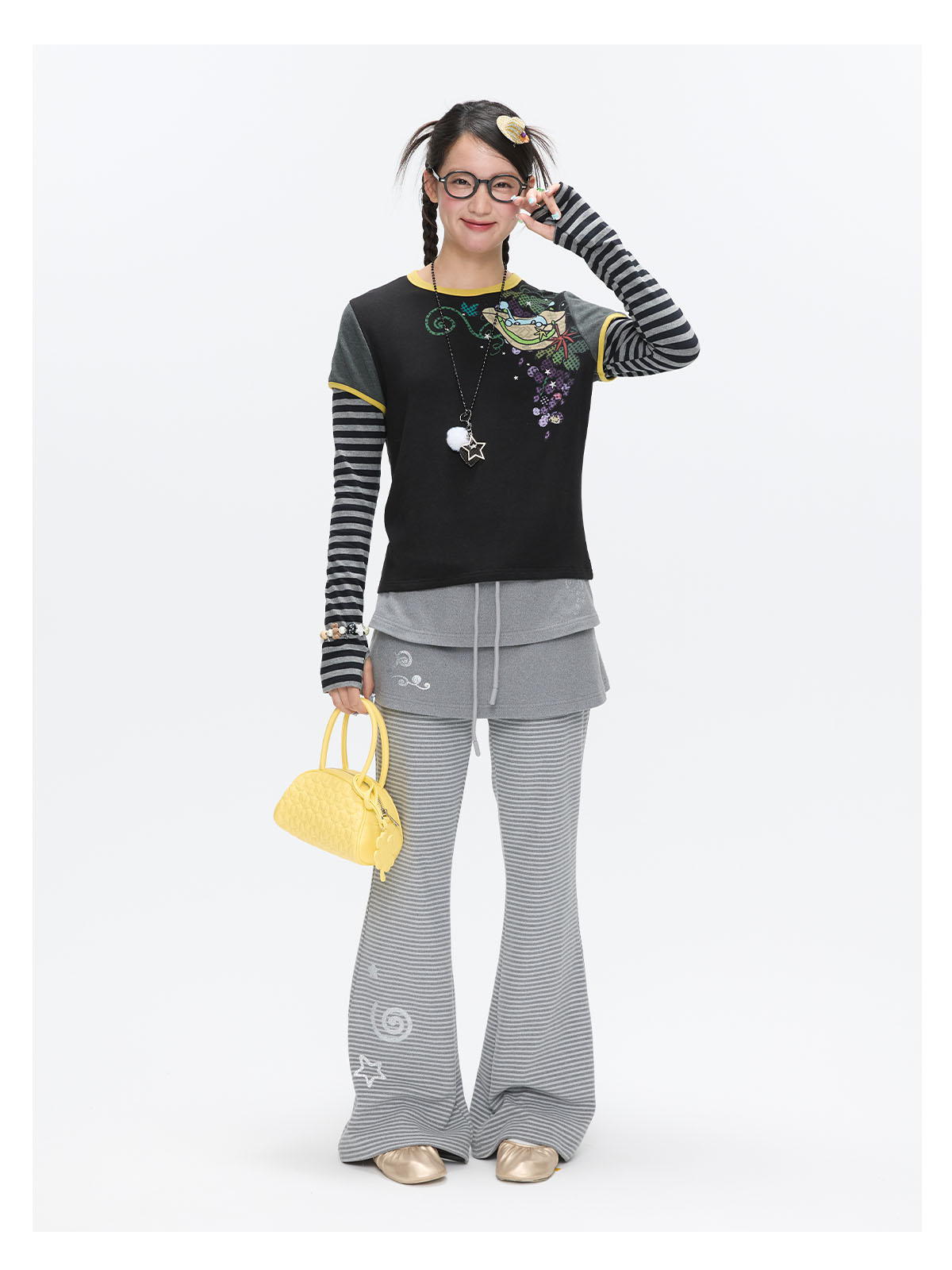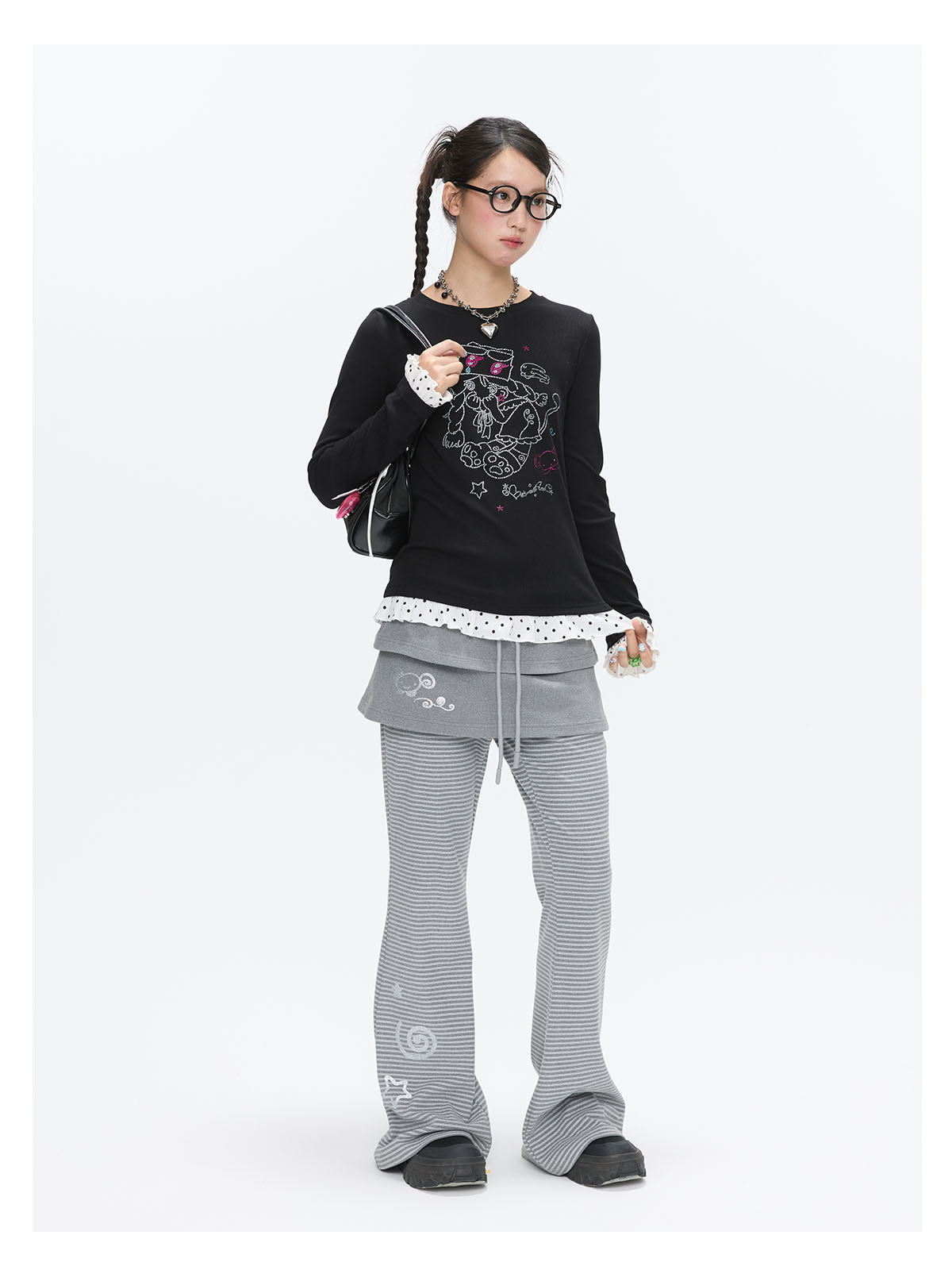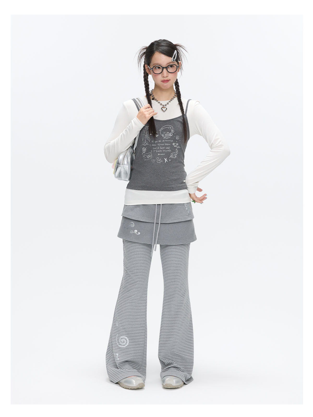 Striped layered flare pants with ruffle skirt design and Y2K style