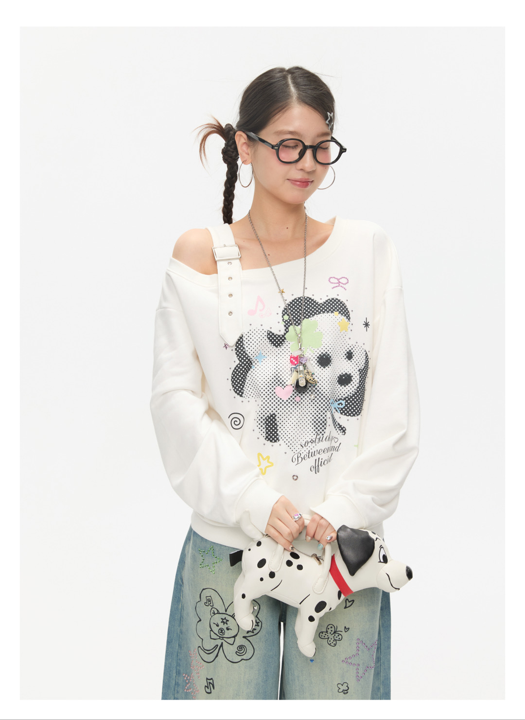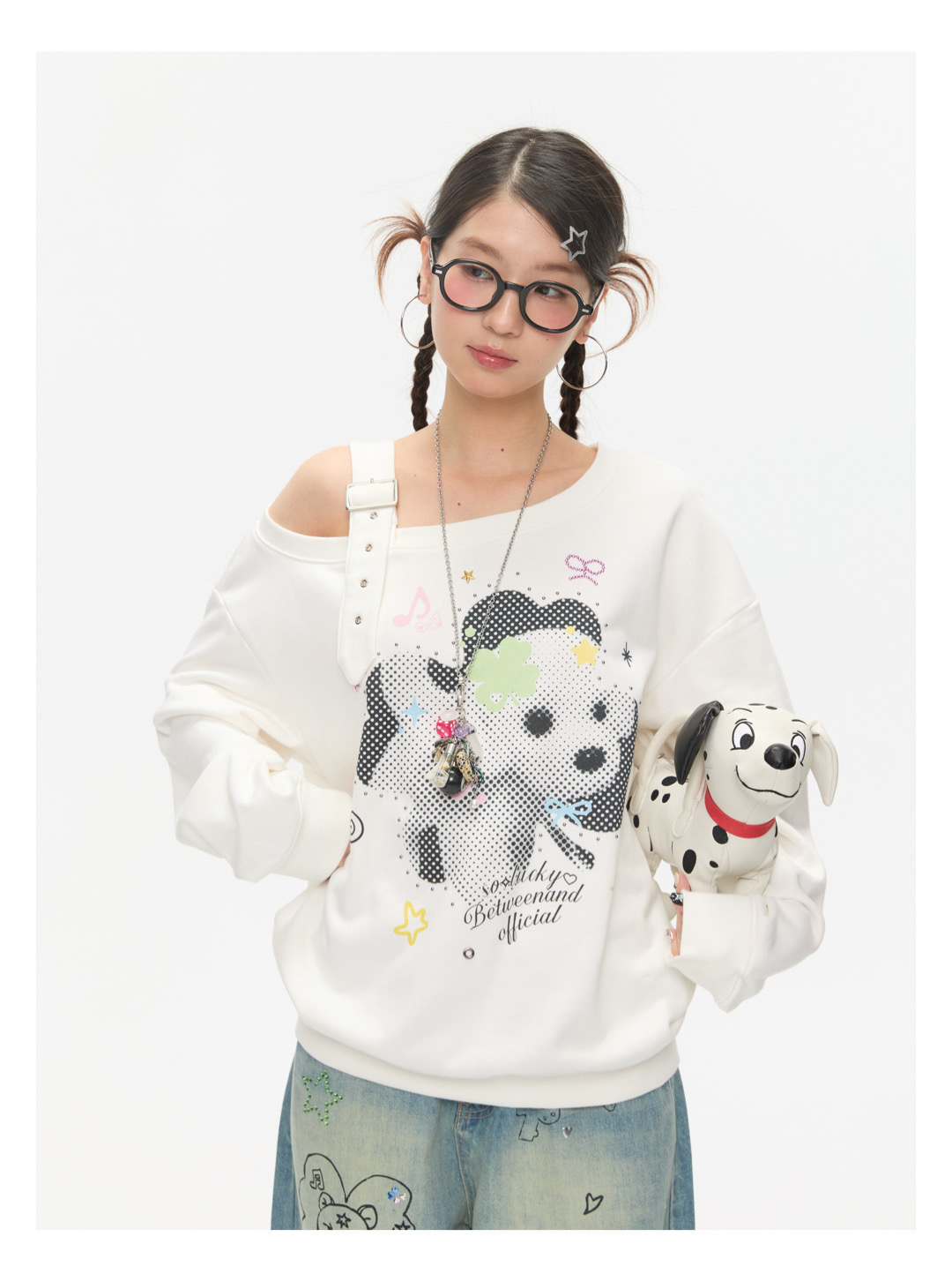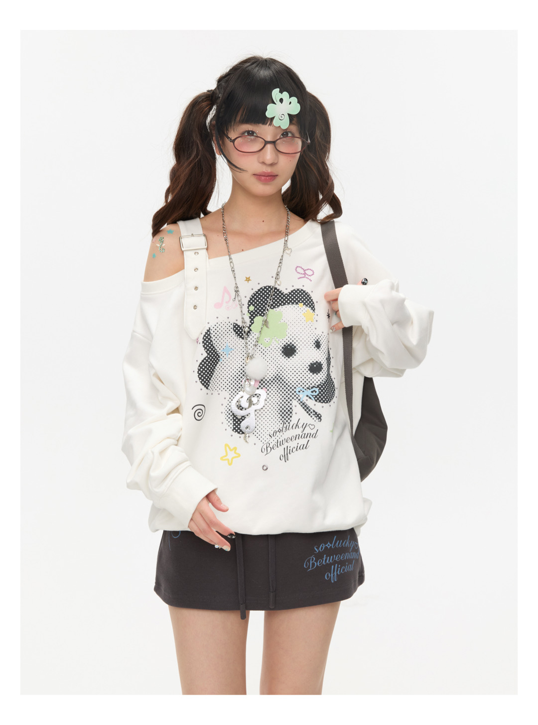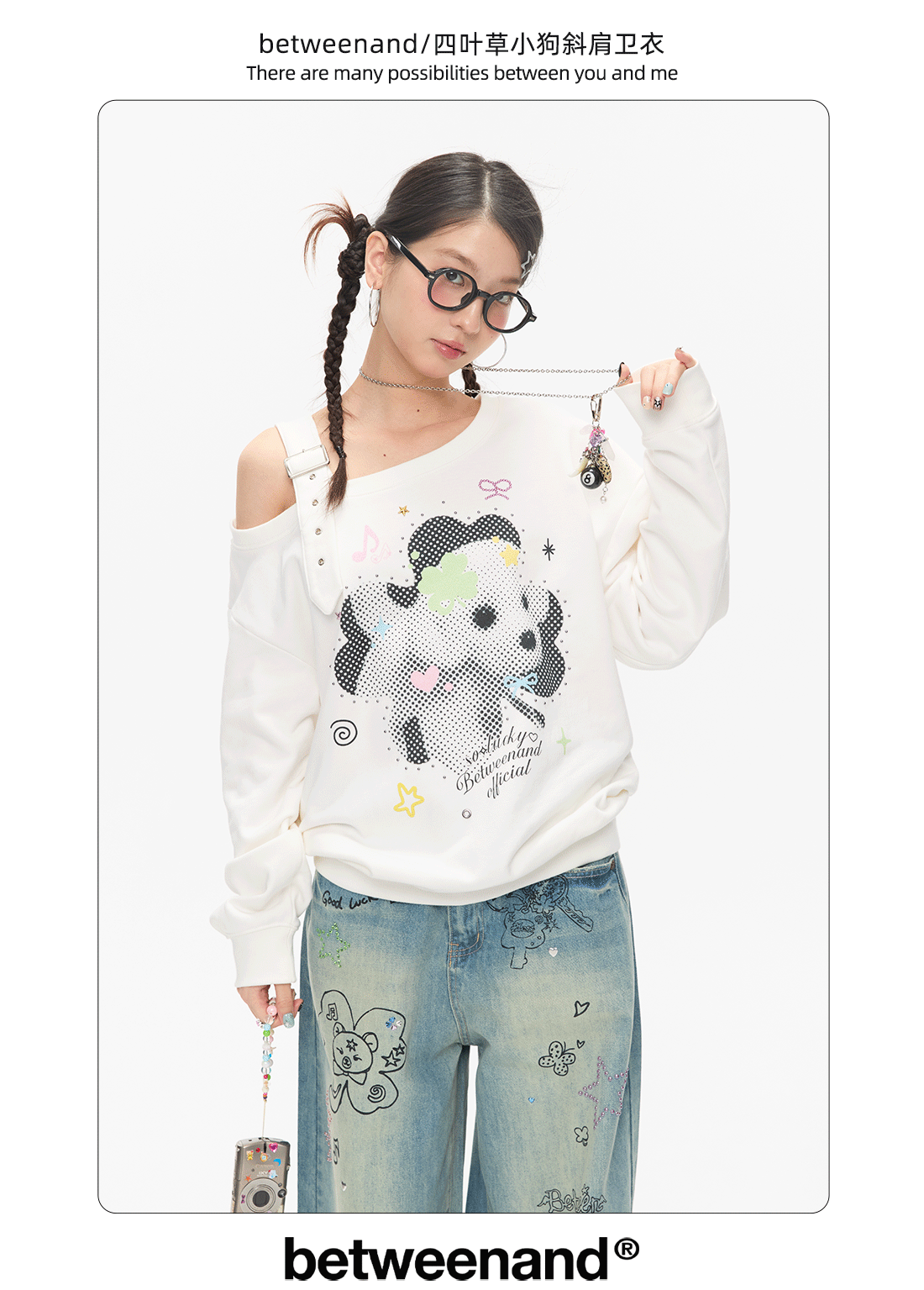 White clover dog off shoulder hoodie with adjustable strap design Lookbook