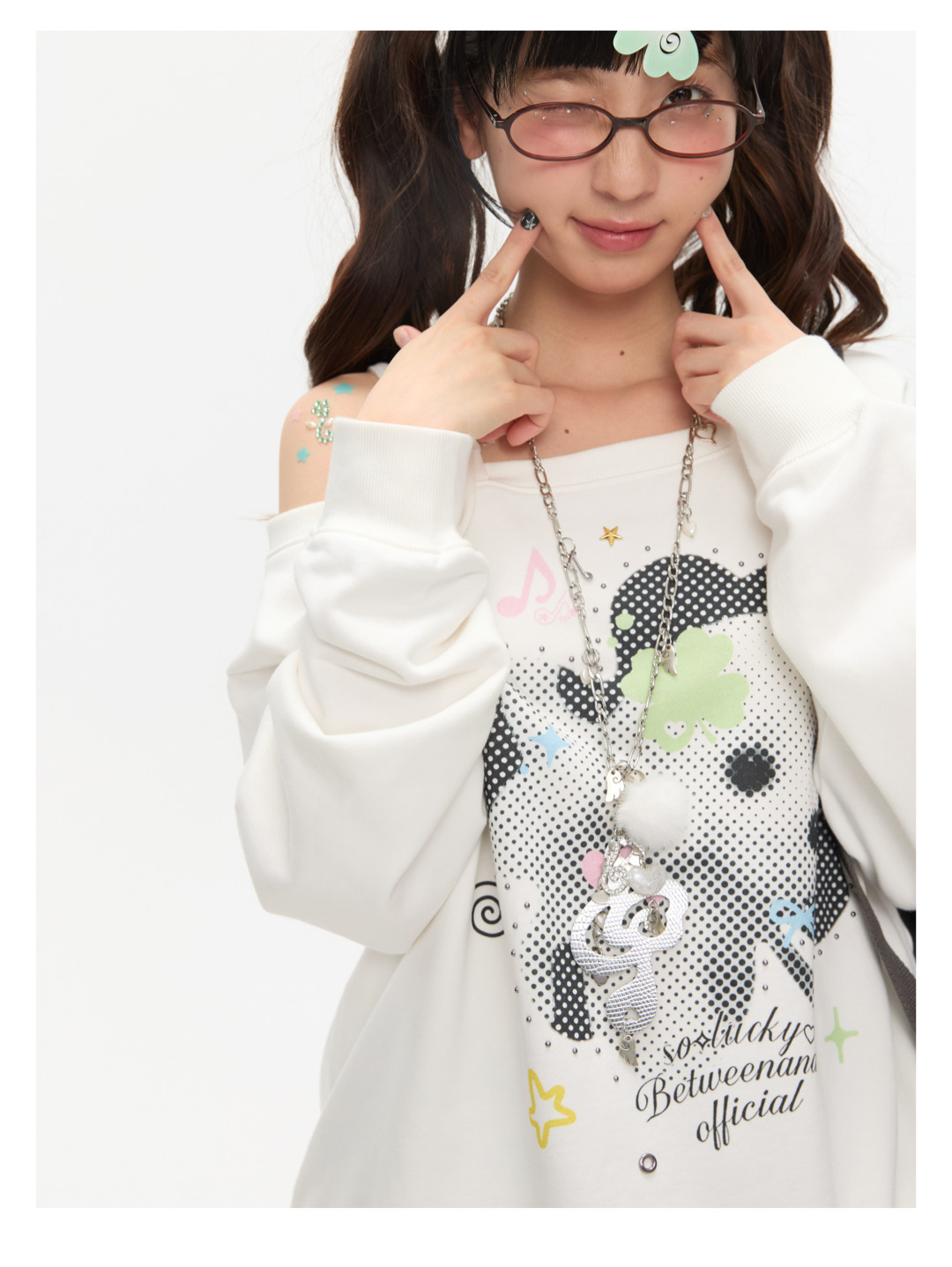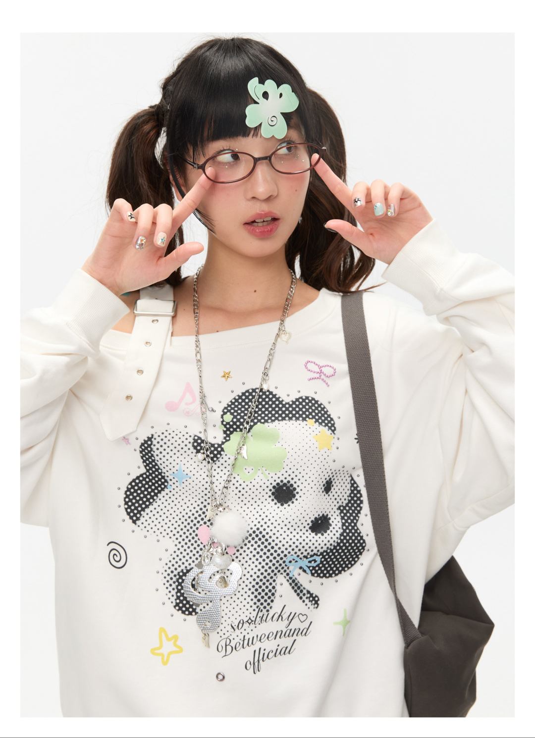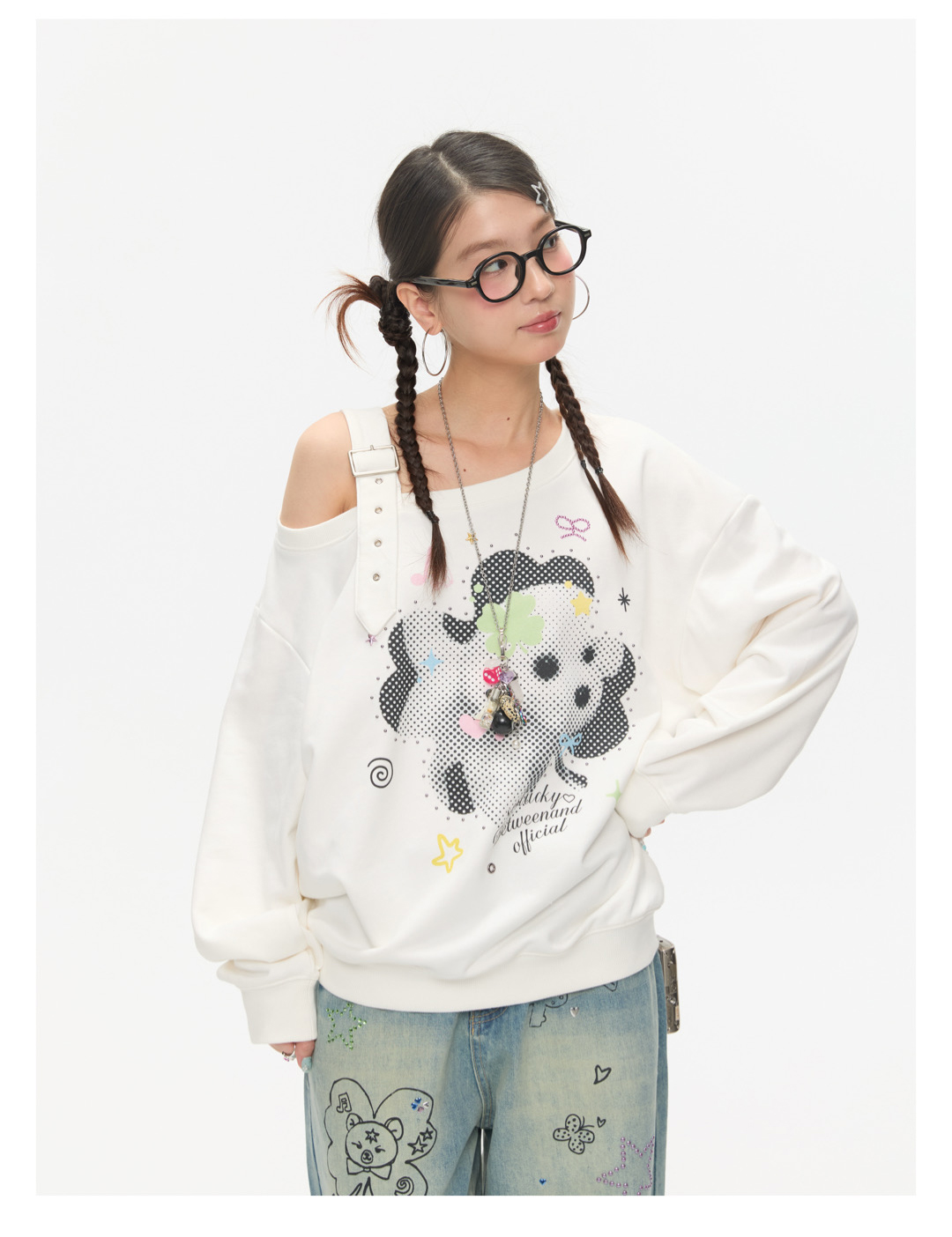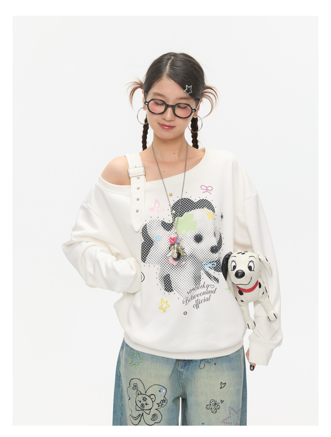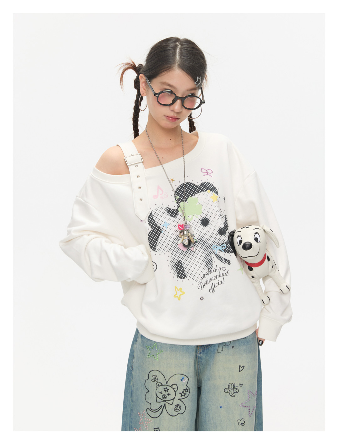 White clover dog off shoulder hoodie with adjustable strap design Lookbook