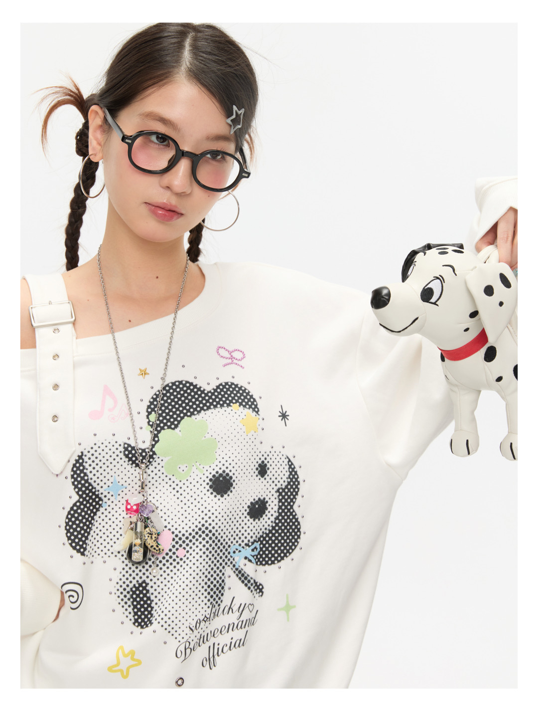 White clover dog off shoulder sweatshirt with adjustable strap design